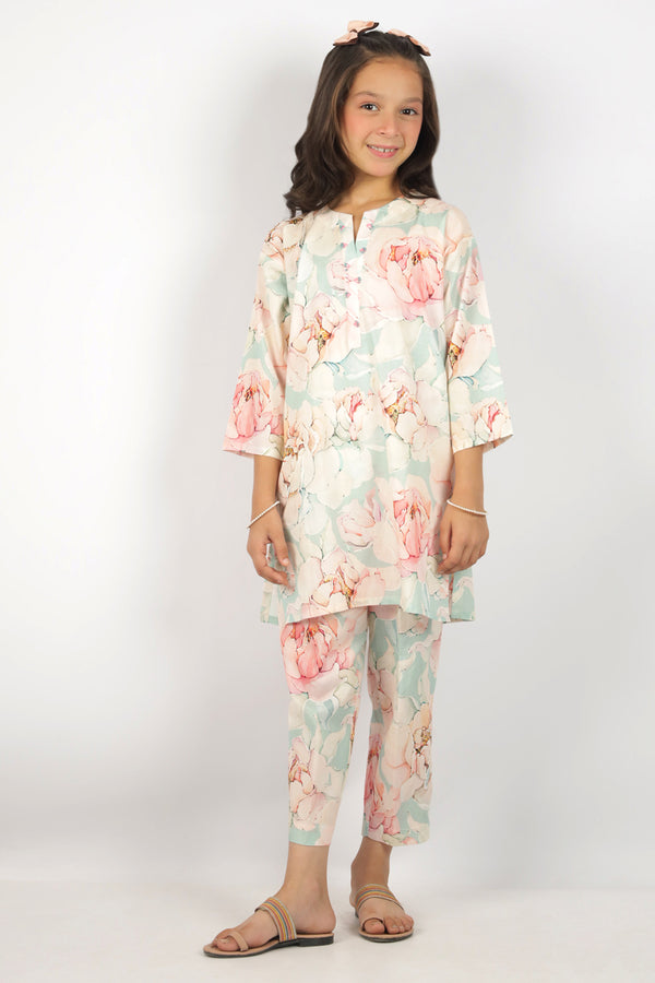 Design: SP-11072 (P29-25181-13A 2Pcs) S+TColor: Ivory  Fabric: Lawn Product Detail Soft And Elegant, This SAYA Printed Lawn Stitched 2-Piece Set For Kids In Ivory Captures Innocent Charm With Refined Style....