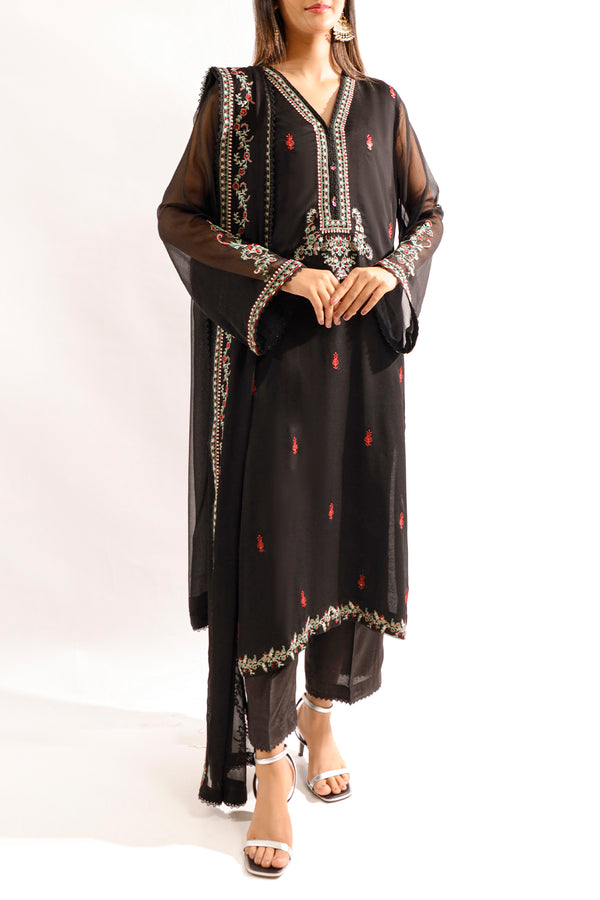 Design: SP-9618 (P14-24162-E59A 3Pcs)Color: Black Fabric: Chiffon Product Detail Elevate your wardrobe with Saya's Solid Embroidered Chiffon Stitched 3-Piece suit in classic black. Crafted from premium Chiffon fabric, this ensemble ensures comfort and style...