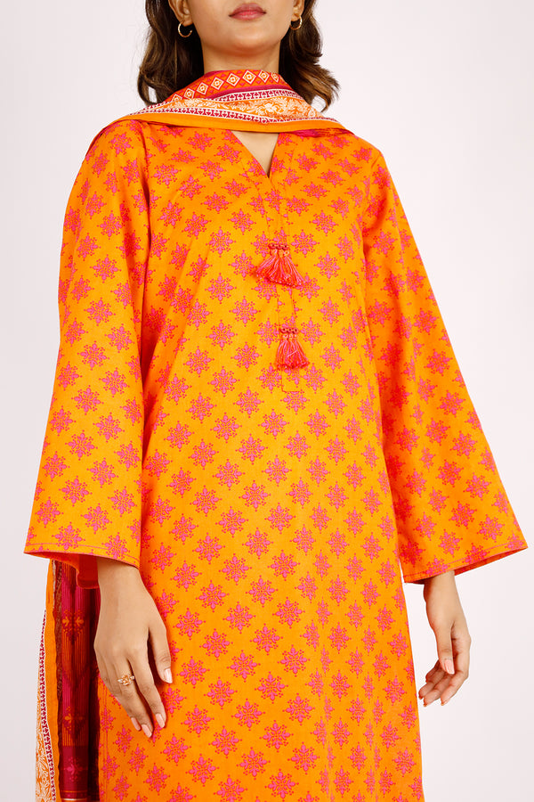 Design: SP-6653 (P14-24056-E11B 3Pcs) Color: Orange Fabric: Lawn Product Detail Redefine elegance with this stitched 3-piece ensemble featuring printed and embroidered lawn fabric. The set includes a meticulously embroidered shirt, a...