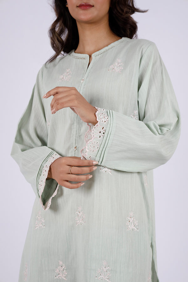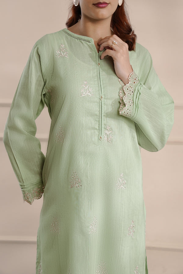 Design: SP-6765 (P16-24236-E06AB 2Pcs) S+TColor: Pastel Yellow Fabric: Zari Filament Product Detail Elevate your wardrobe with this solid embroidered zari filament stitched 2-piece set. Featuring a delicately embroidered shirt paired...