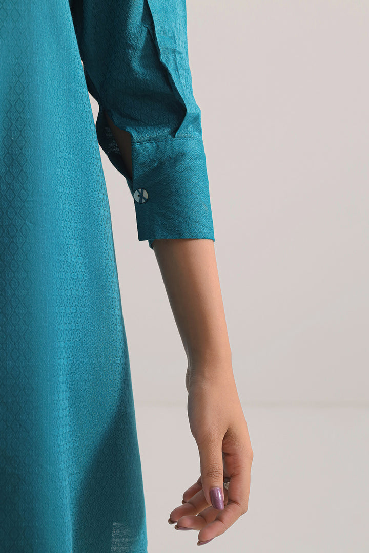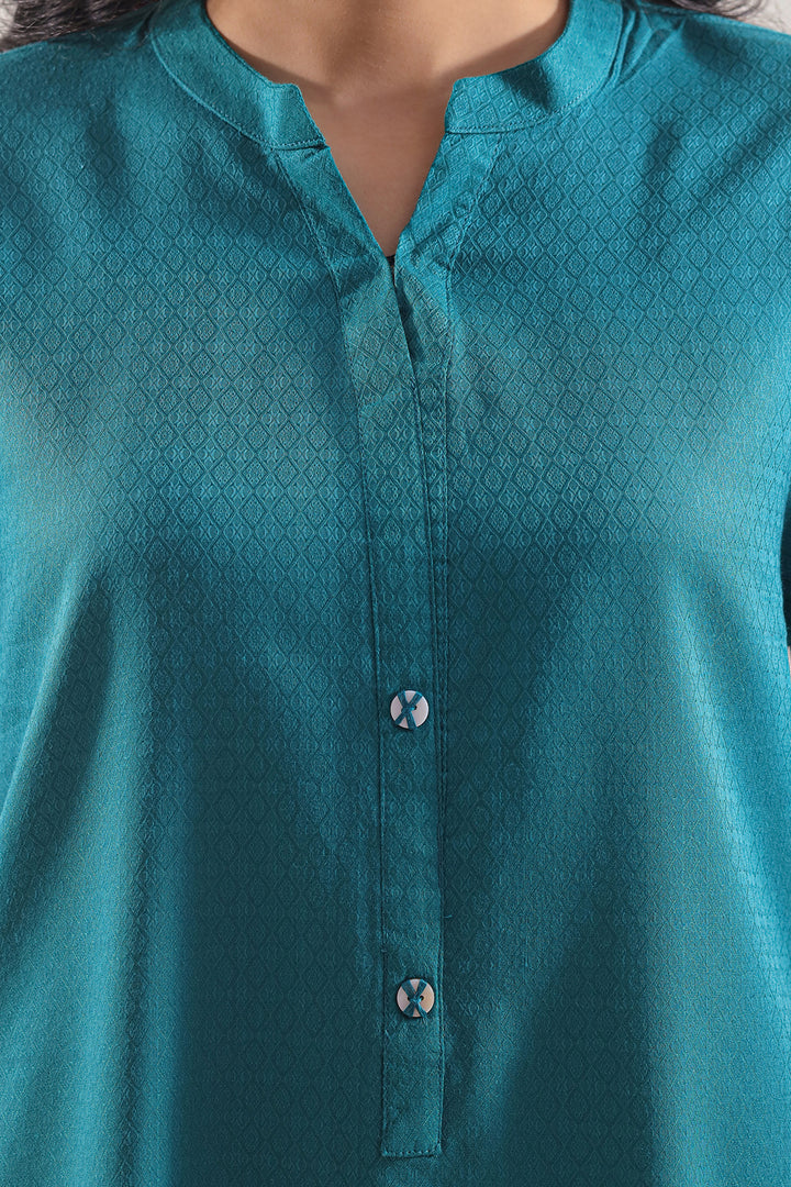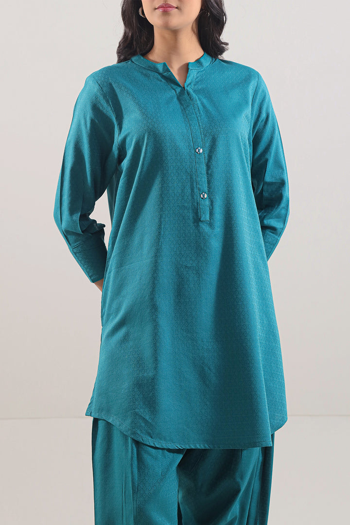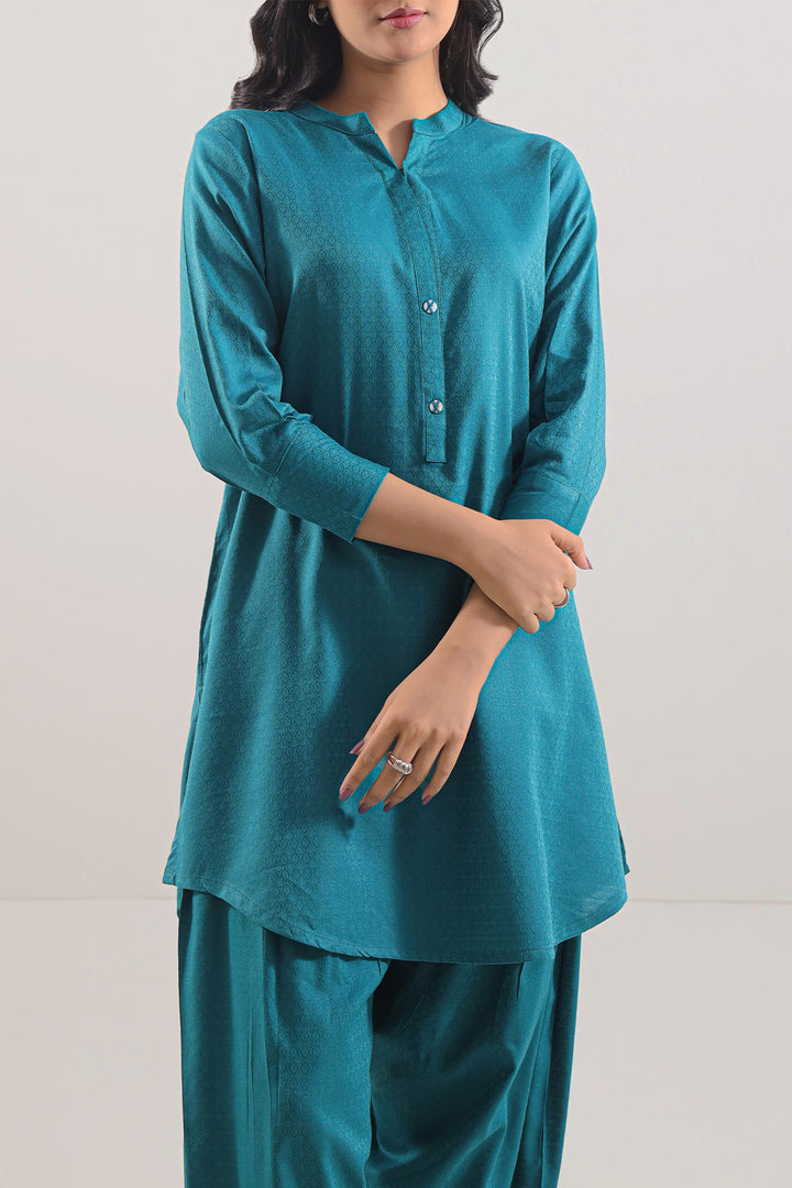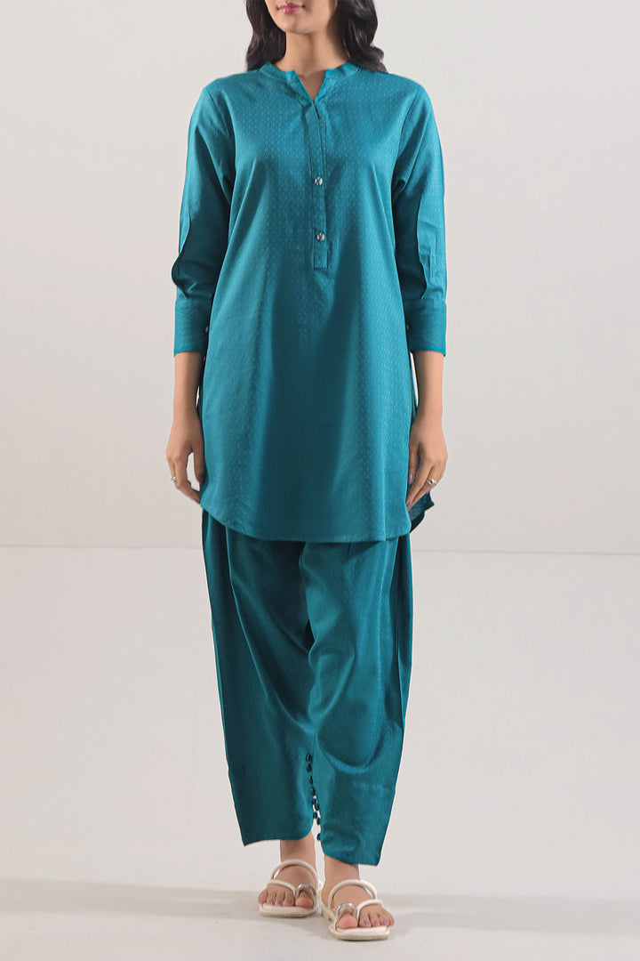 Elevate Your Daytime Elegance With This Cotton Jacquard Stitched 2-Piece Set By Saya Made From Premium Cotton Jacquard Fabric, The Shirt Features A Subtle Self-Textured Weave Offering Visual Interest With A Luxurious Feel. Paired With Coordinated Trousers For A Sleek And Comfortable Fit, This Ensemble Balances Refinement With Perfect For Smart-Casual Meetings, Office Days, Or Polished Daily Dressing, This Outfit Delivers Graceful Utility And Timeless Style.