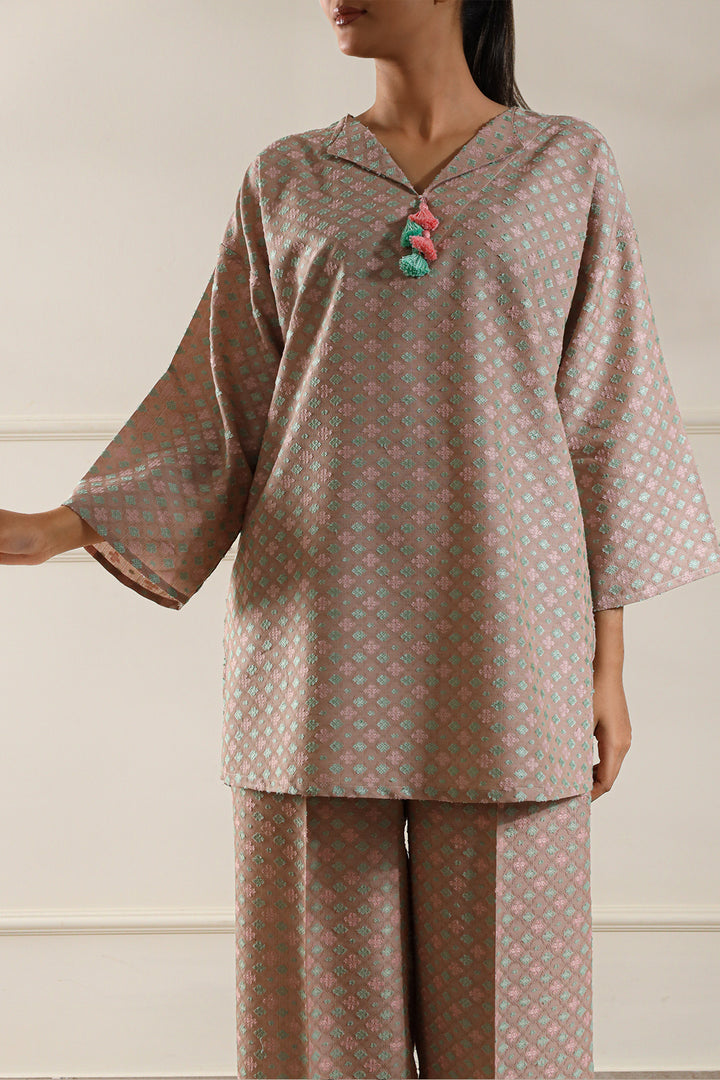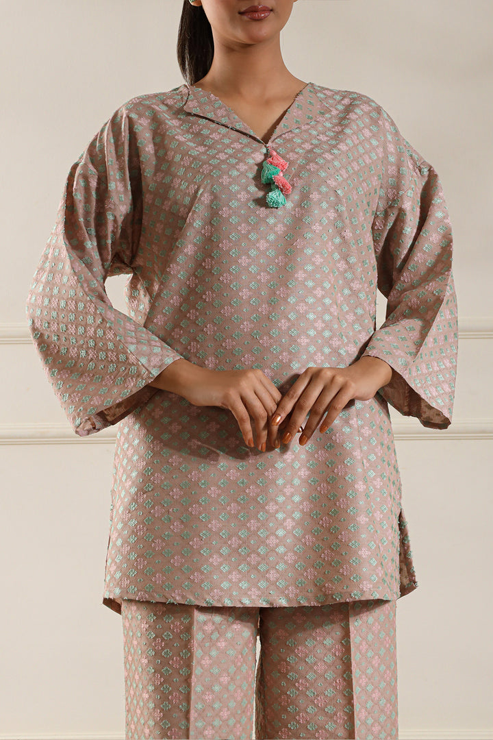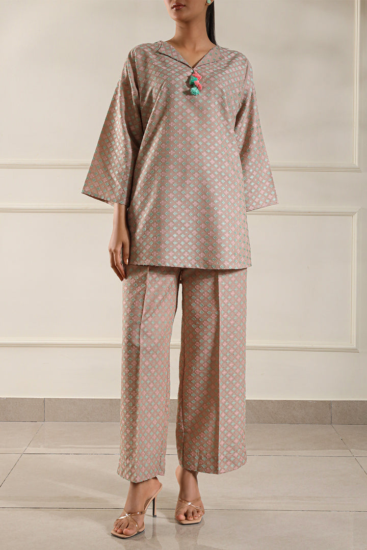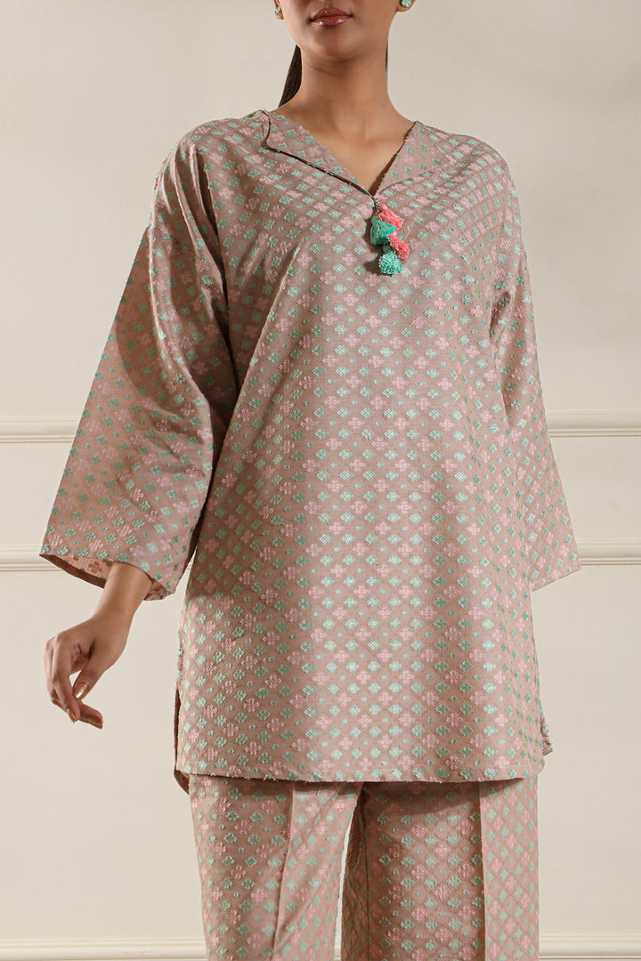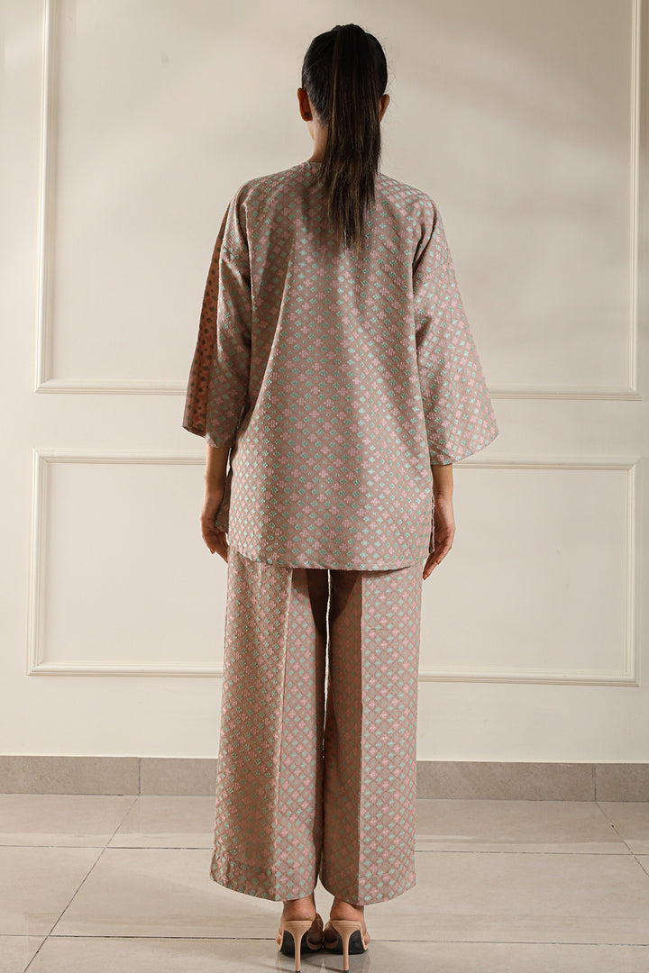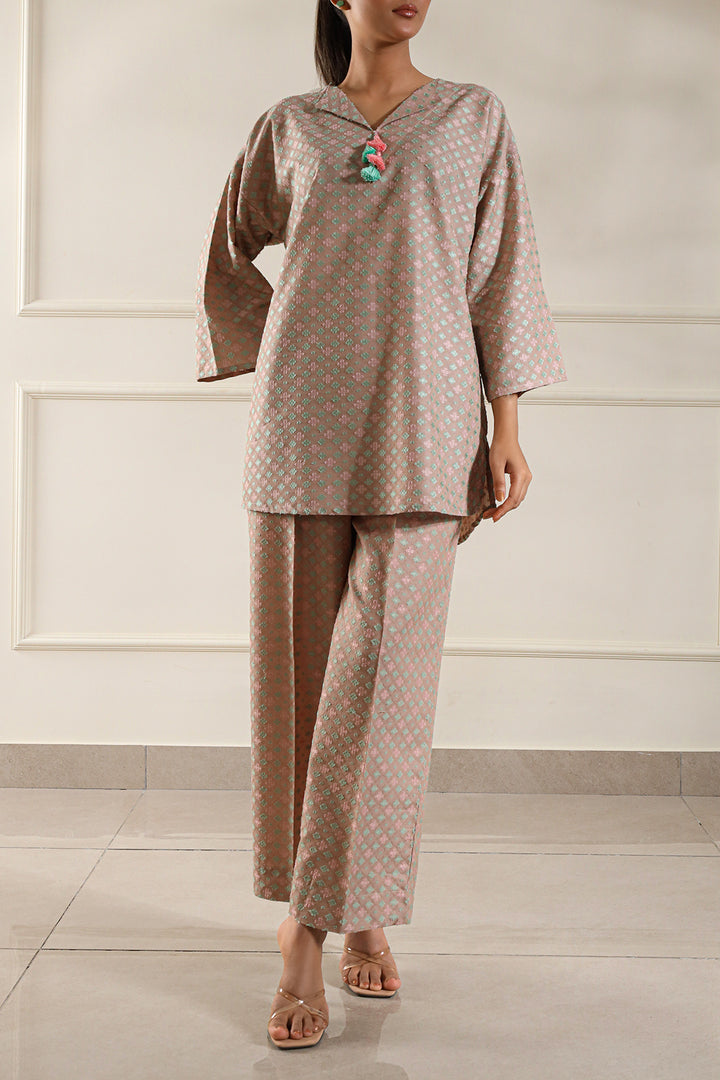 Add timeless charm to your wardrobe with this cotton jacquard stitched 2-piece by Saya. Featuring a beautifully woven jacquard shirt paired with matching trousers, this set blends comfort with elegance—perfect for daily wear and casual meetups.