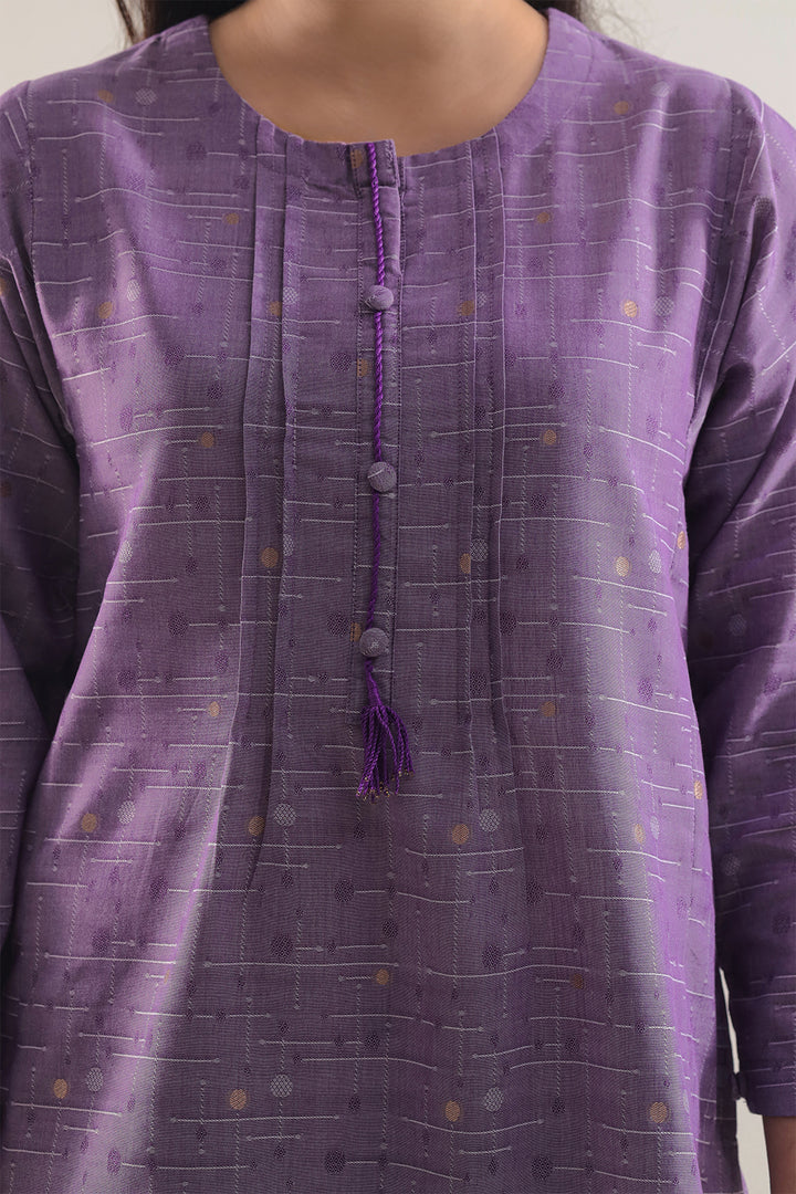 Regal And Elegant, This SAYA Cotton Jacquard Stitched 2-Piece In Majestic Purple Imbues Poise With Ease. Expertly Woven In Rich Cotton Jacquard, The Fabric Boasts A Distinctive Textured Weave That Captures Light And Adds Depth. The Shirt Is Meticulously Tailored With Sharp Seams And A Clean Finish, While The Coordinated Trouser Complements With A Harmonious Silhouette. Designed For Graceful Presence, This Ensemble Is Perfect For Day To Evening Events, Festive Gatherings, Or Sophisticated Soirées. A Statement Of Understated Luxury That Effortlessly Meets Fashion And Function.
