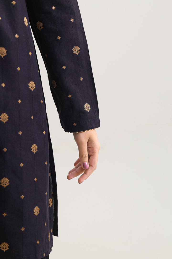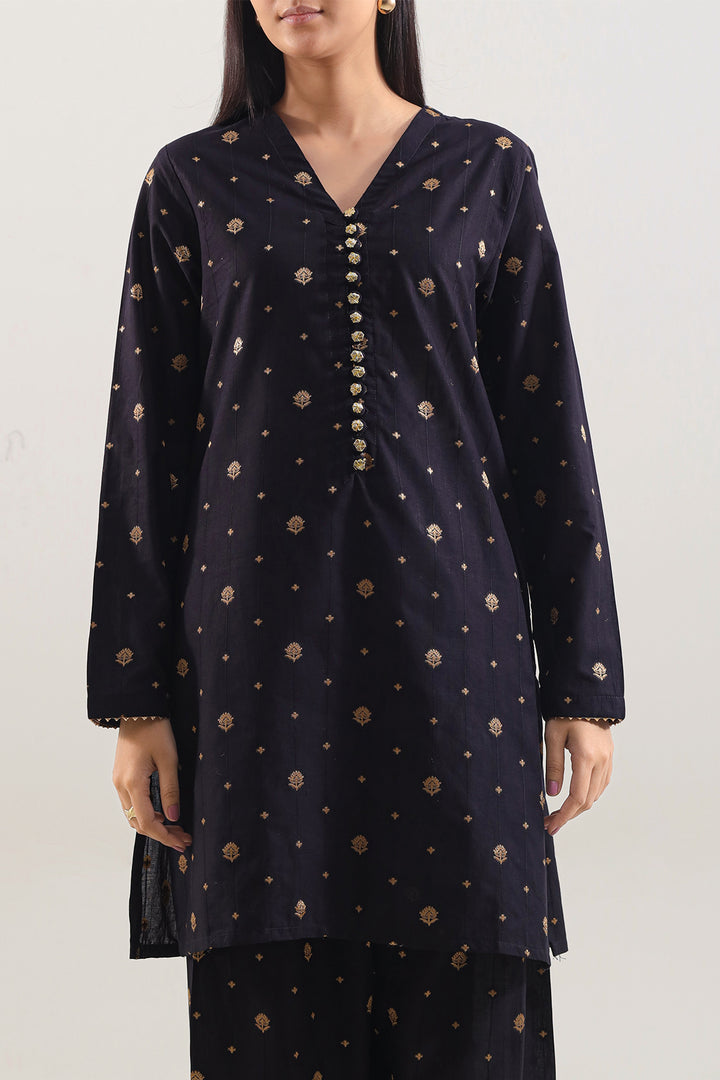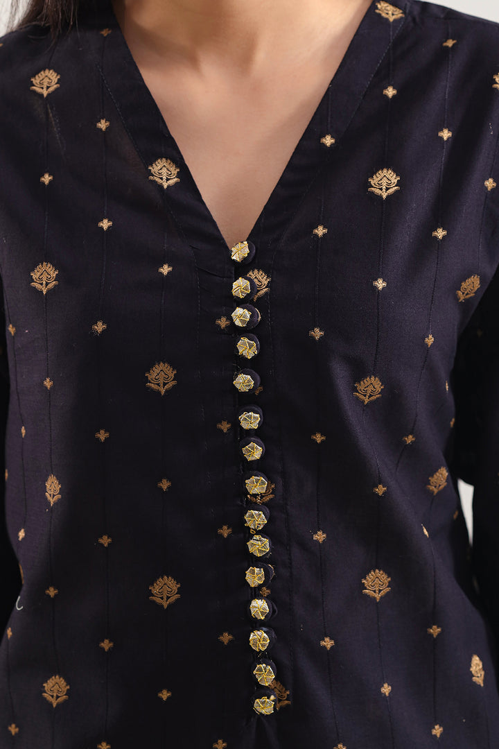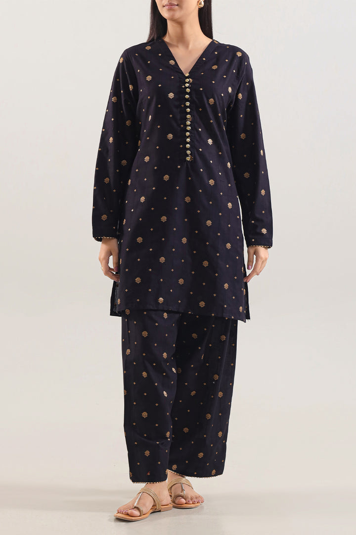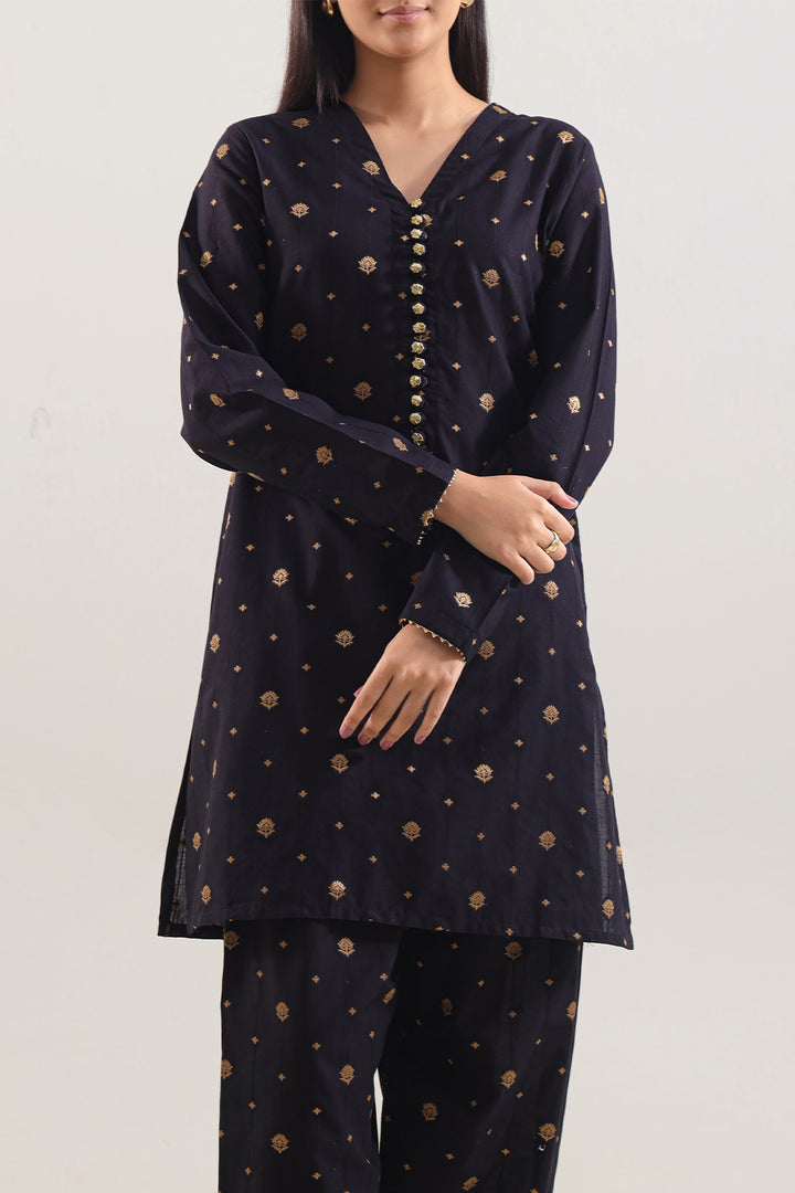 Cotton Jacquard Stitched Two-Piece Set By SAYA, Made From Rich, Textured Cotton Jacquard Fabric That Offers Both Style And Breathability. The Shirt Comes Ready-To-Wear In A Deep Black Hue With An Intricate Woven Pattern, Perfectly Paired With Coordinating Trousers For A Sophisticated, Matching Look. Designed For Semi-Formal Gatherings Or Polished Daywear, With Fine Stitching And A Polished Finish That Elevates Everyday Comfort. This Ensemble Blends Subtle Elegance, Durability, And Versatility—A True Wardrobe Staple.