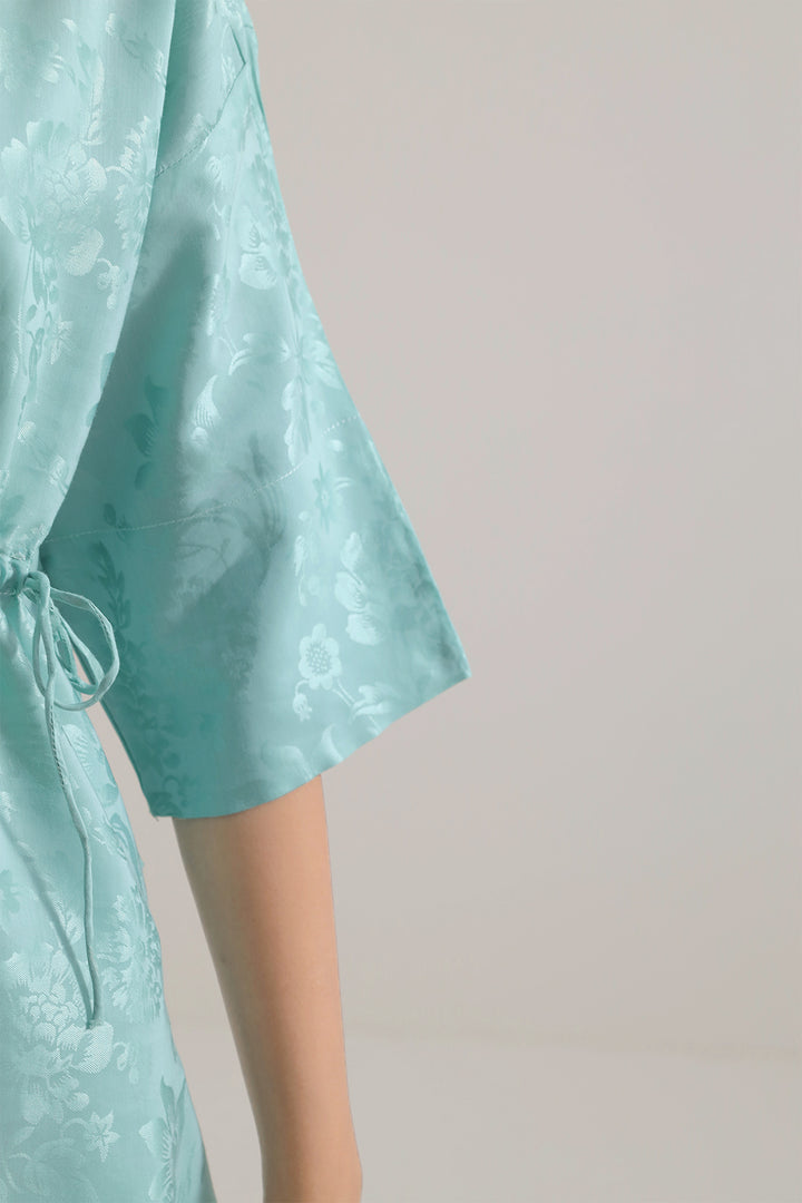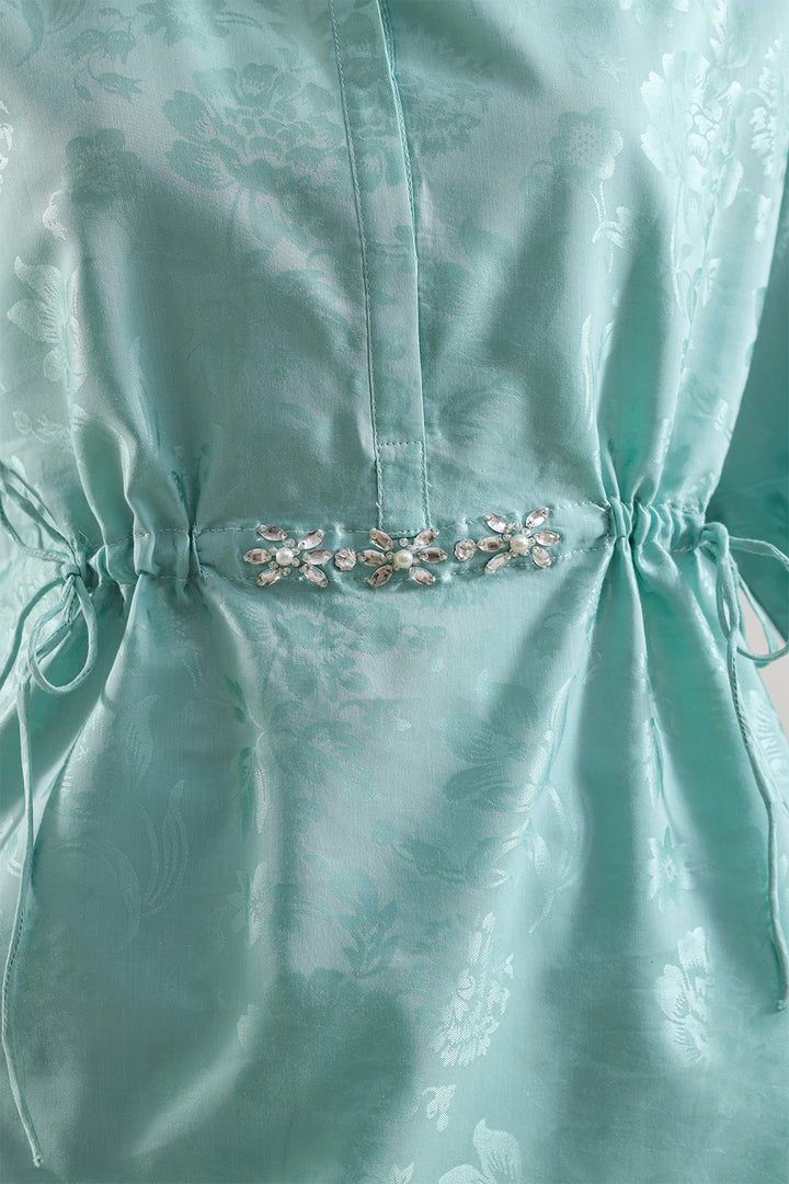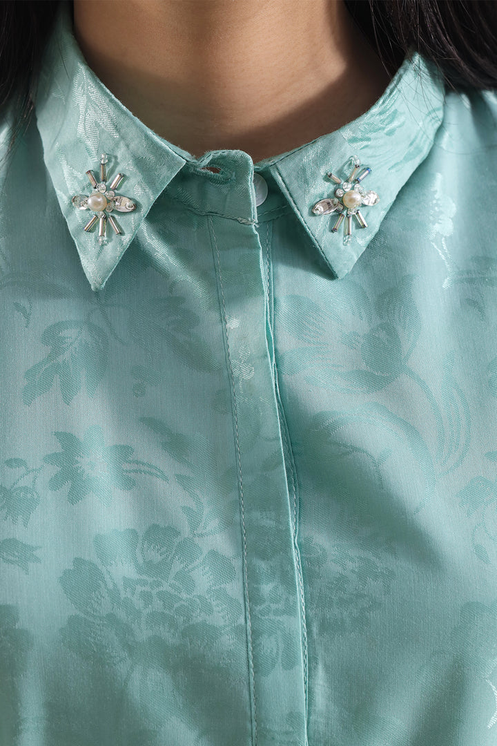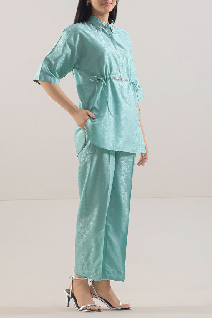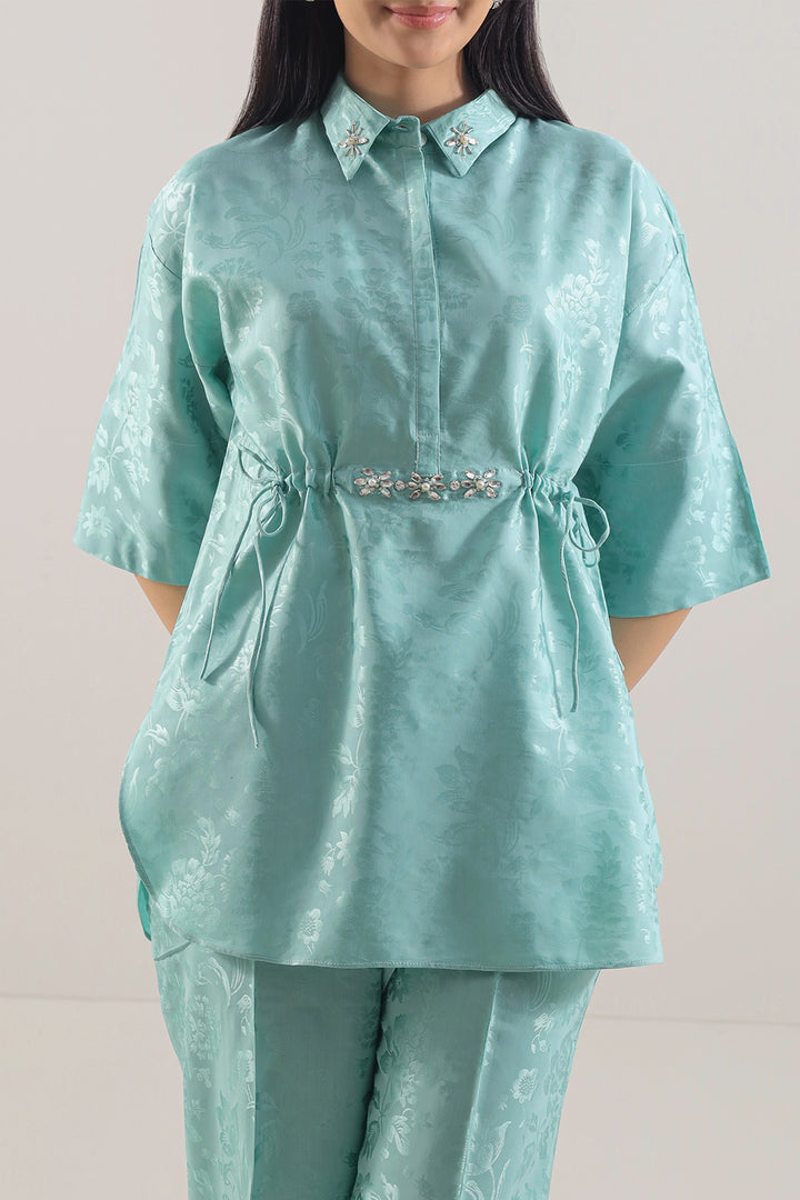 Cotton Jacquard Stitched 2-Piece By SAYA Radiates With A Deep Green Tone. Woven From Textured Jacquard Cotton, It Offers A Blend Of Comfort And Structure. The Shirt Features Subtle Tonal Patterns, Clean Stitching, And A Refined Collar. Paired With A Matching Trouser, This Ready-To-Wear Ensemble Delivers Polished Style For Semi-Formal Events, Office Evenings, Or Elegant Daywear With Confidence.