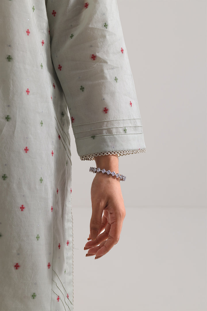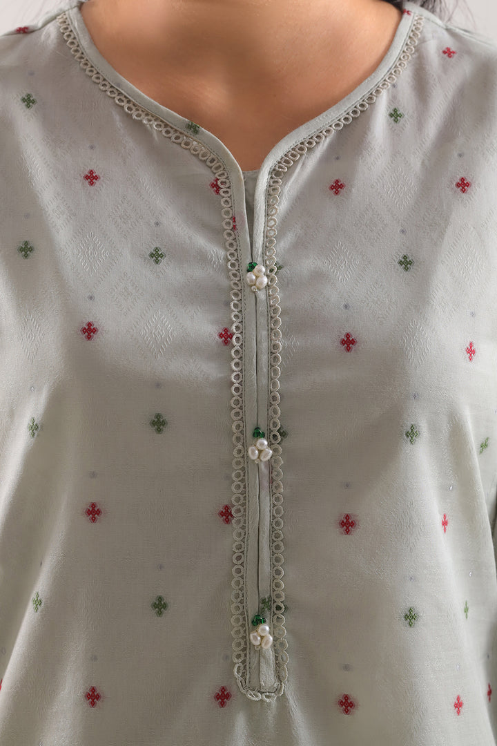 Cotton Jacquard Stitched 2-Piece By SAYA Radiates Refined Style In A Deep Mint Green Tone. The Textured Jacquard Cotton Fabric Offers Elegant Depth While Remaining Soft And Breathable. Its Ready-To-Wear Shirt Features Clean Structure, Subtle Weave Detail, And Precise Stitching. Paired With A Matching Trouser, This Ensemble Delivers A Polished Look Suitable For Semi-Formal Events, Office Wear, Or Elevated Daywear.