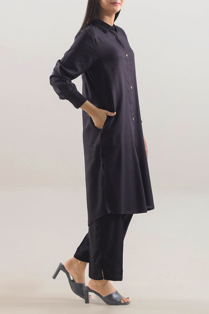 Cotton Jacquard Stitched 2-Piece By SAYA Radiates Elegant Depth In A Black Hue. Woven From Premium Jacquard Cotton, It Offers Texture With Breathability. The Shirt Features Clean Stitching, A Refined Collar, And A Tailored Silhouette That Speaks Of Subtle Luxury. Paired With A Matching Trouser, This Ready-To-Wear Ensemble Is Perfect For Semi-Formal Outings, Office Evenings, Or Polished Daywear.