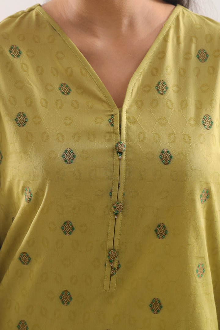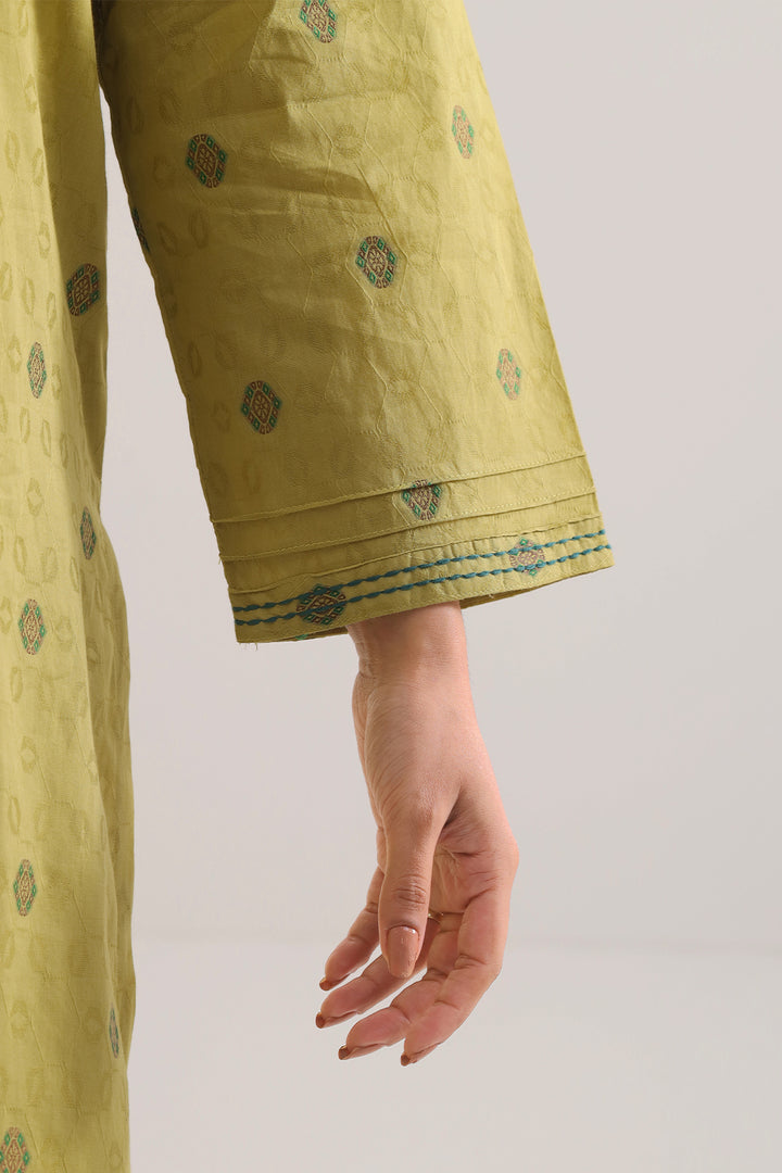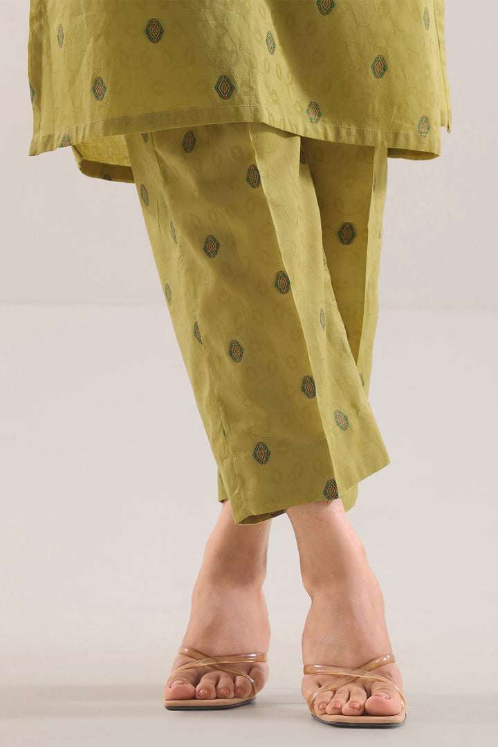 Cotton Jacquard Stitched 2-Piece By SAYA Comes In A Rich Lime Green Tone. The Jacquard Fabric Offers Subtle Texture With Breathable Comfort. Shirt Features Clean Stitching, A Neat Collar, And A Tailored Silhouette. The Matching Trouser Provides Structure And Ease. Perfect For Semi-Formal Events, Office Evenings, Or Polished Daywear.