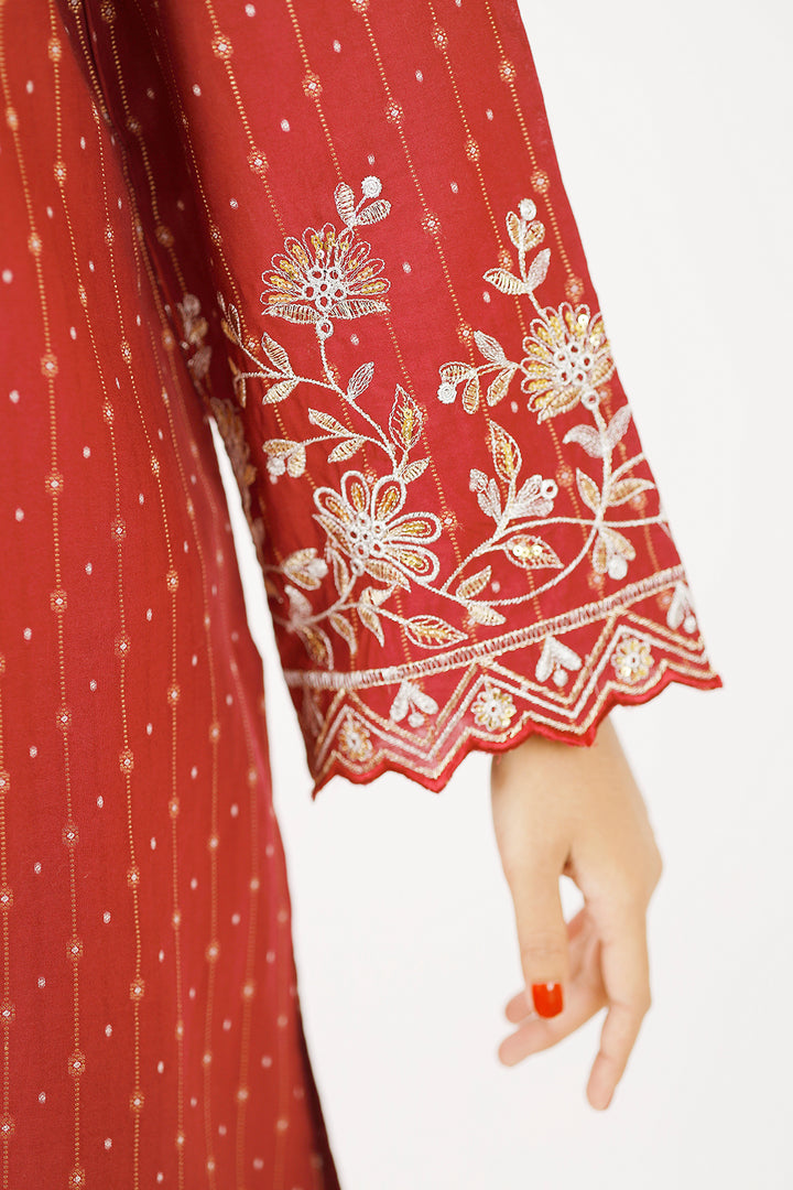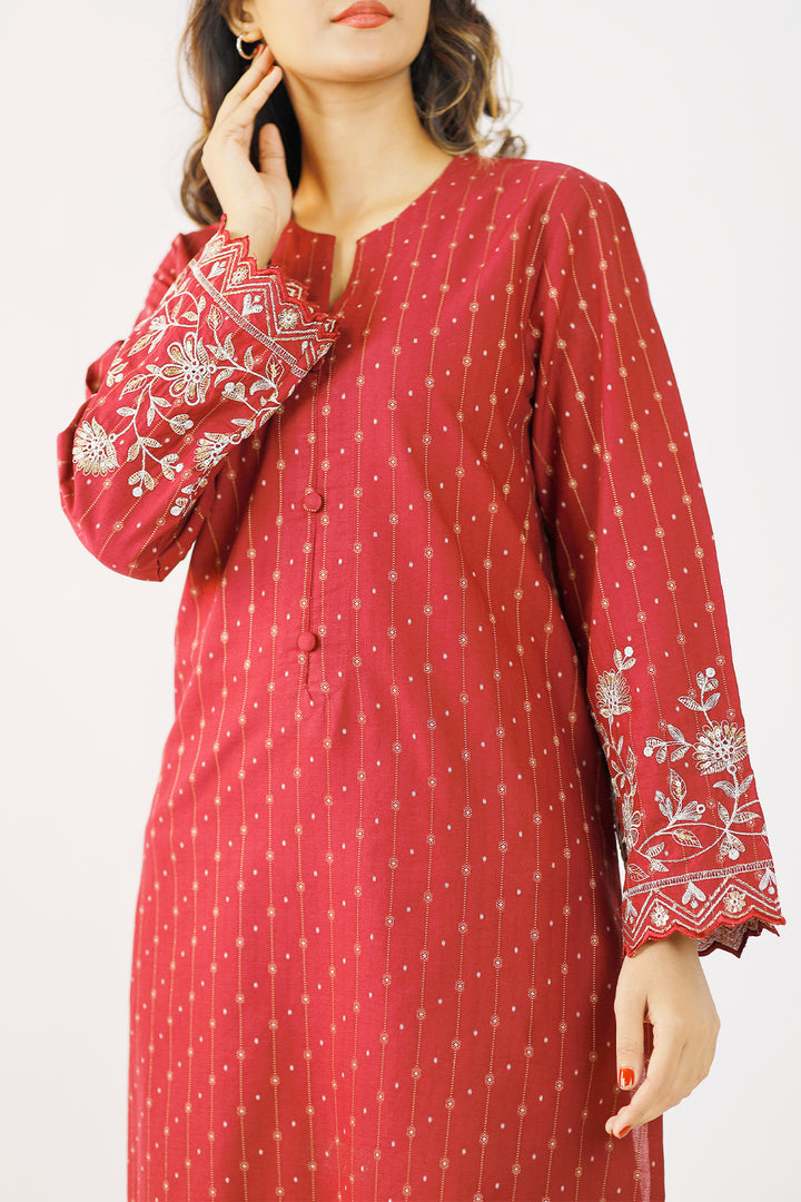Upgrade your wardrobe with Saya's Embroidered Cotton Jacquard Stitched 2-Piece Shirt Trouser. Designed with intricate embroidery on high-quality cotton jacquard fabric, this stitched ensemble combines comfort with refined elegance, perfect for semi-formal occasions and elevated everyday wear.