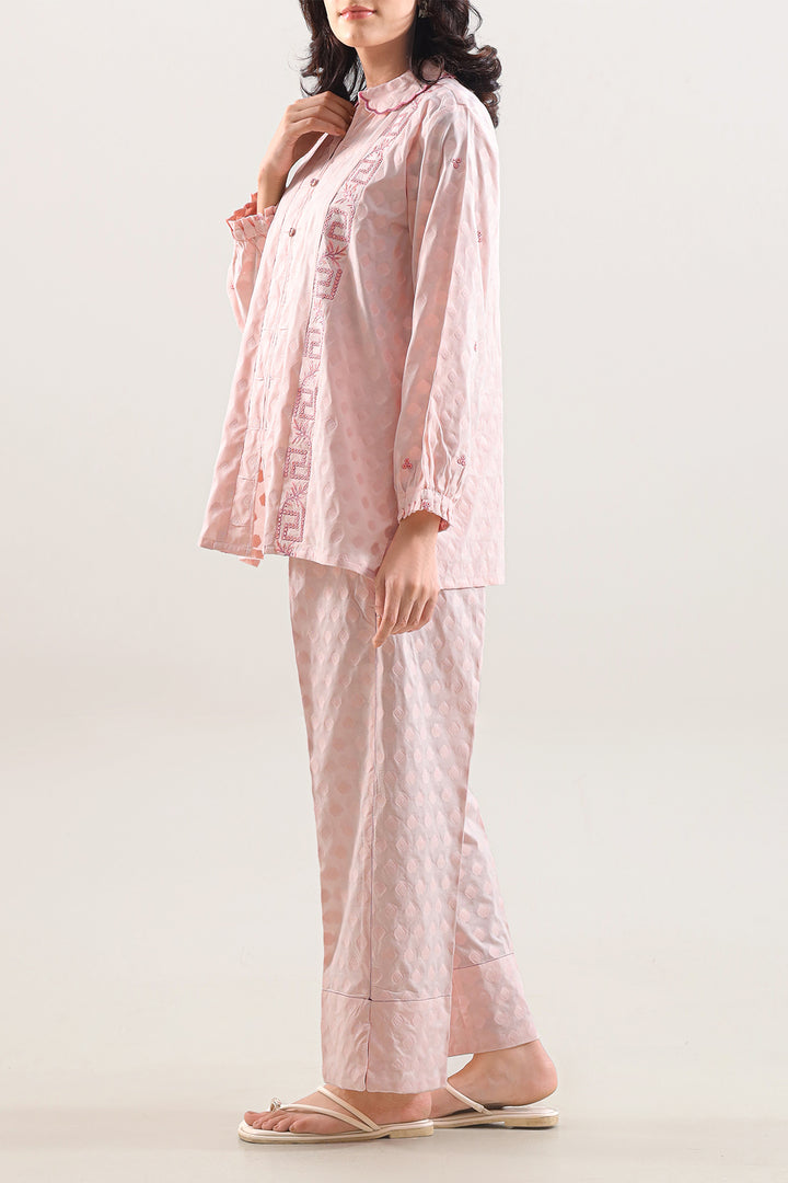 Elevate Your Wardrobe With The SAYA Embroidered Cotton Jacquard Stitched Two-Piece Set, A Masterful Blend Of Artisanal Detailing And Structural Elegance. This Exquisite Ensemble Is Meticulously Crafted From Premium Cotton Jacquard, Renowned For Its Rich Texture, Breathable Comfort, And Durable Quality. It Features An All-Over Woven Jacquard Pattern, Gracefully Accentuated By Delicate Embroidered Motifs That Showcase Unparalleled Craftsmanship. Designed For A Flawless, Ready-To-Wear Fit, This Coordinated Shirt And Trouser Set Is The Quintessential Choice For Distinguished Occasions Including Weddings, Eid Celebrations, And Formal Galas, Offering A Perfect Synthesis Of Heritage Artistry And Contemporary Sophistication.
