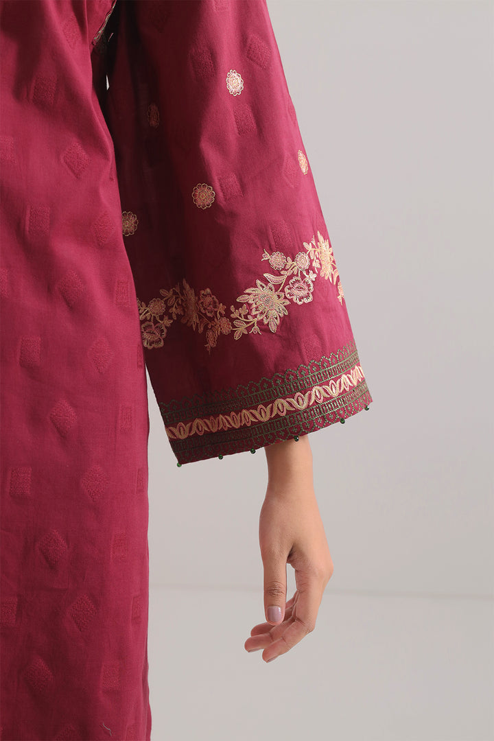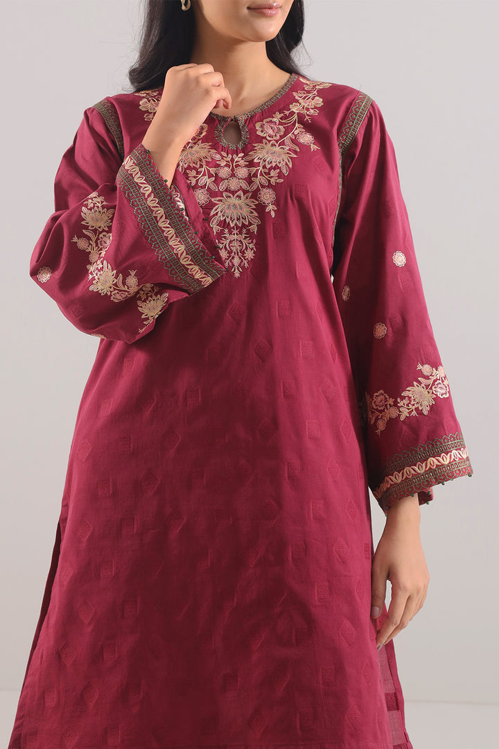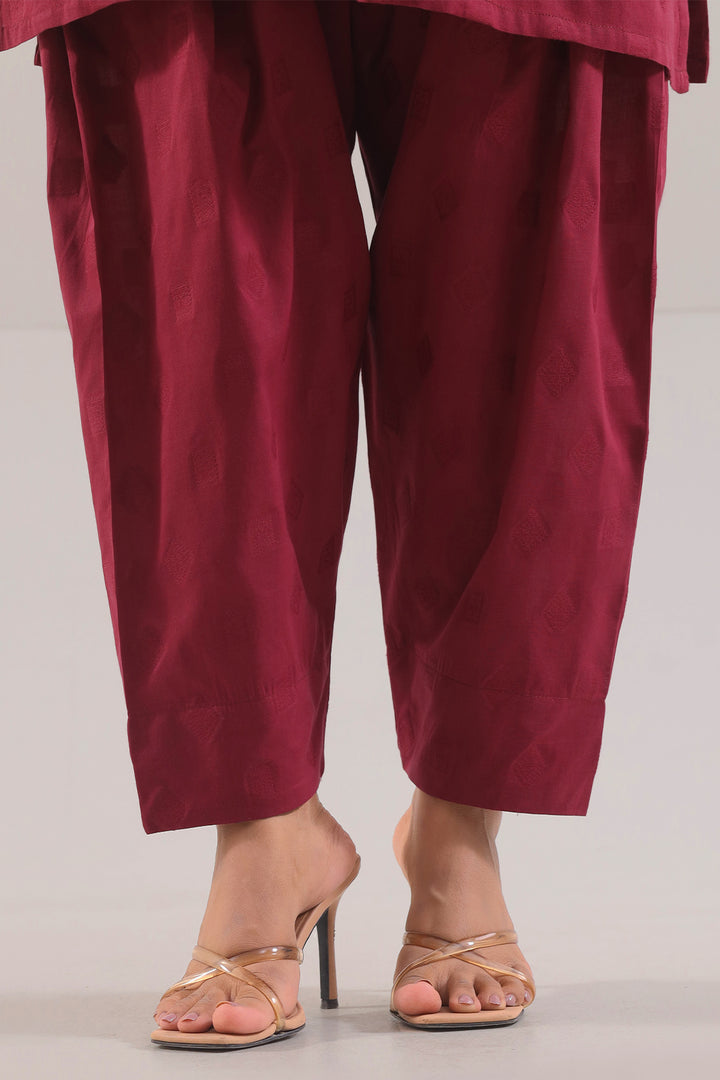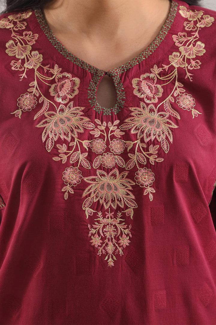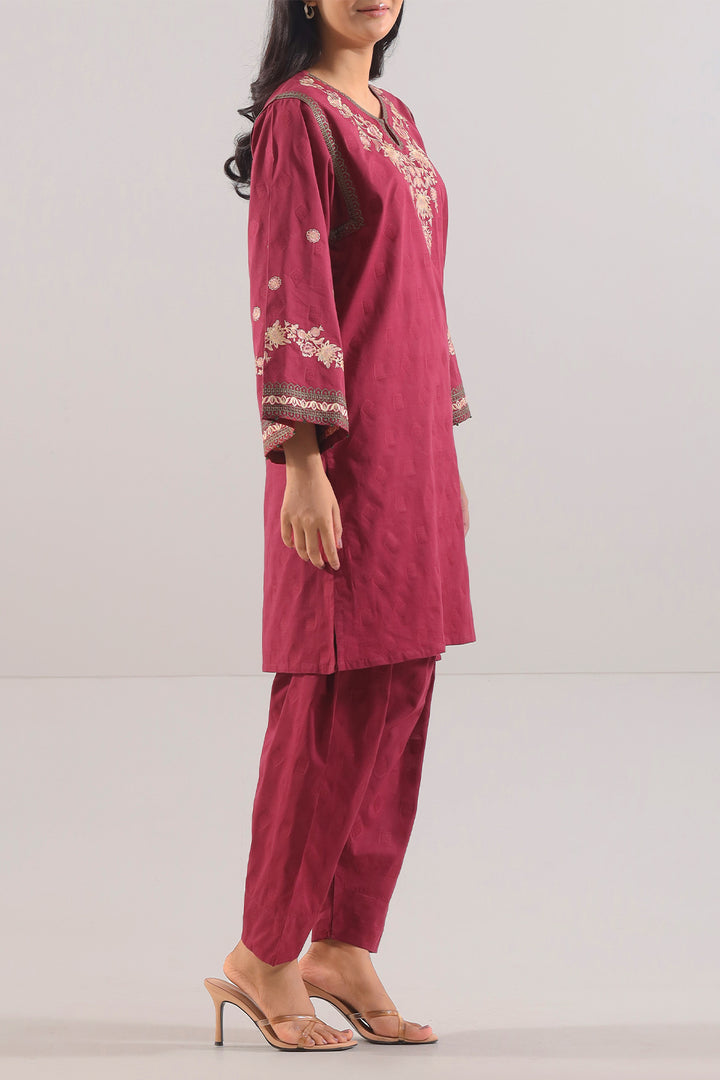 Embroidered Cotton Jacquard Stitched 2-Piece By SAYA Embraces A Soothing Maroon Tone. Crafted In Luxurious Jacquard Cotton, It Combines Rich Texture With Breatheable Comfort. The Shirt Features Delicate Embroidery On The Front Panel And Sleeves, Alongside Clean Stitching And A Refined Collar. The Matching Trouser Offers Structure And Balance. Ideal For Semi-Formal Evenings Or Elegant Daywear, This Set Provides Ready-To-Wear Ease With Understated Glamour.