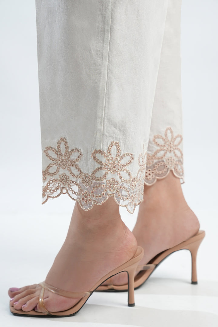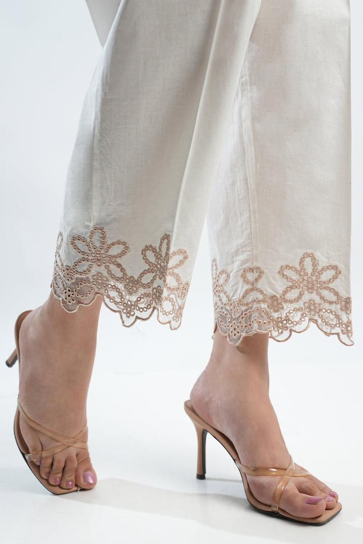 Elevate Your Wardrobe Staples With This Embroidered Cambric Pant By SAYA, A Perfect Fusion Of Subtle Detailing And Everyday Sophistication. Tailored From Premium Quality Cambric Fabric, It Offers A Crisp Yet Comfortable Feel, Making It Suitable For Both Casual And Semi-Formal Occasions. The Intricate Embroidery Along The Hemline Adds A Touch Of Grace Without Overpowering Simplicity, Allowing Seamless Pairing With A Variety Of Kurtas Or Tunics. Its Versatile Neutral Tone Makes It A Must-Have Foundation Piece For A Polished And Effortless Look