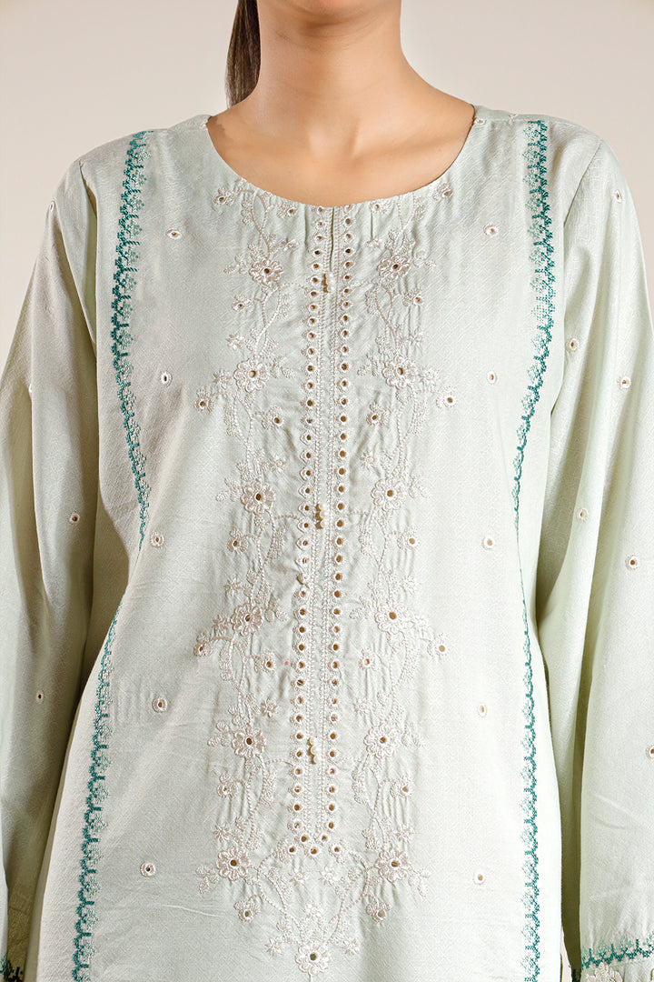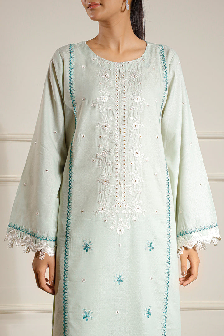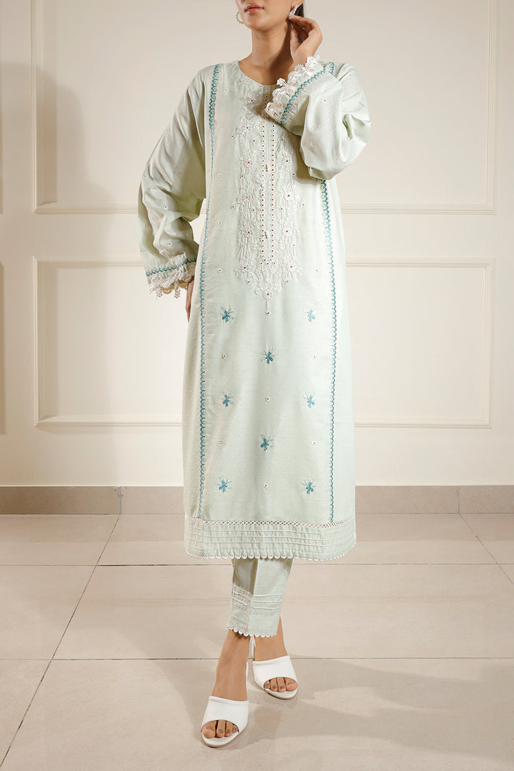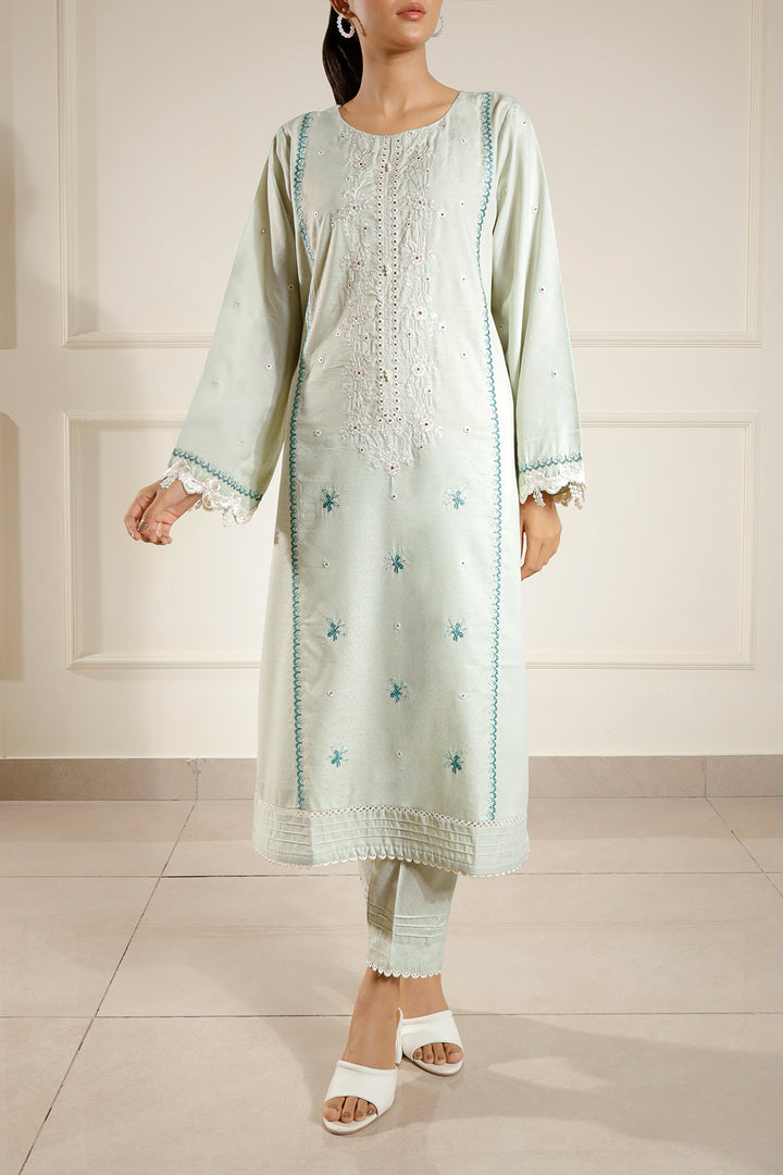 Elevate your wardrobe with Saya’s Luxury Pret Cotton Jacquard Stitched 2-Piece ensemble. This elegant outfit features a meticulously crafted cotton jacquard shirt paired with matching trousers, perfect for adding a touch of luxury to your everyday wear. The intricate jacquard texture exudes sophistication, while the tailored silhouette ensures a flattering fit. Ideal for semi-formal gatherings or day-to-evening transitions, this outfit embodies timeless grace.