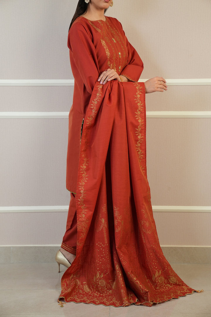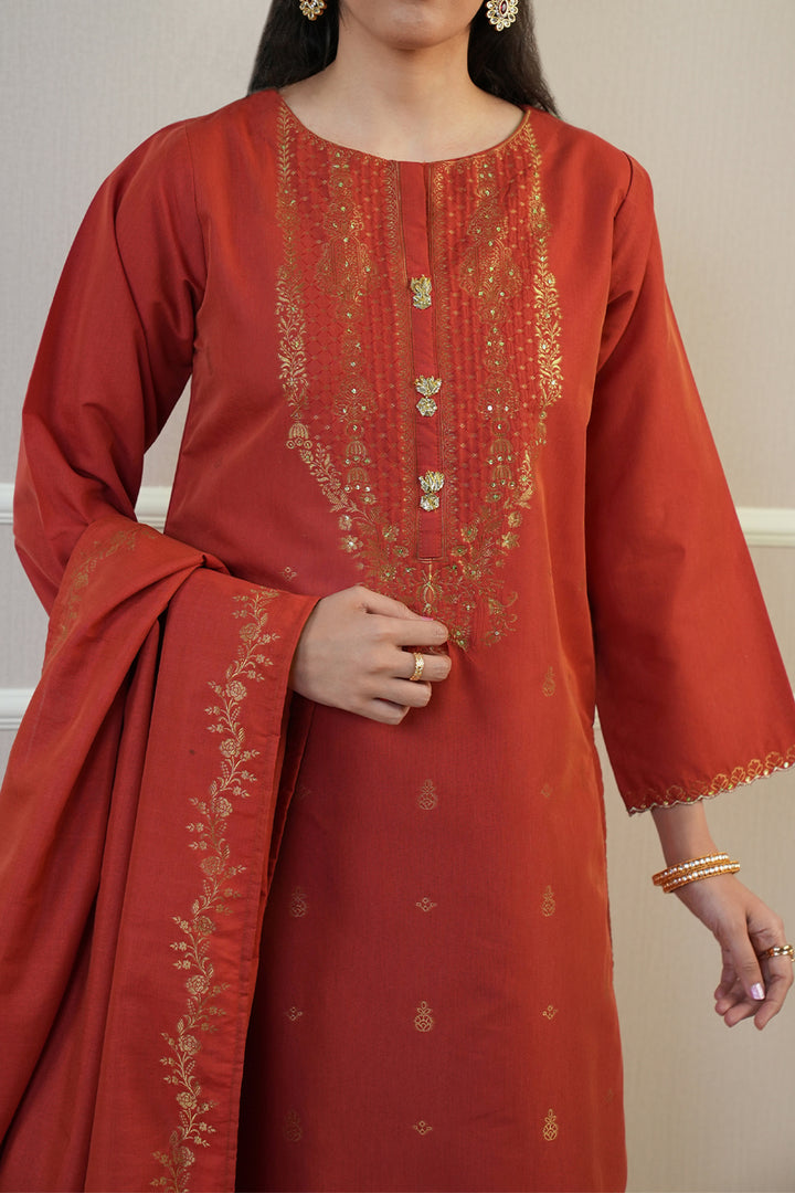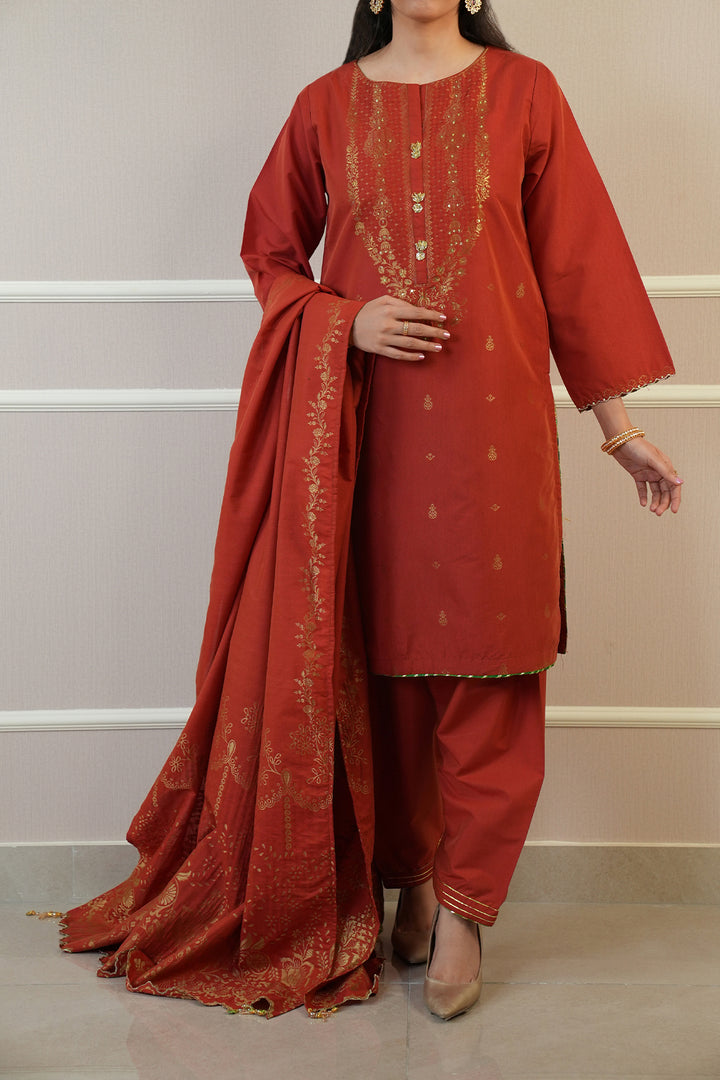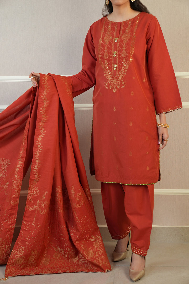 Elevate your style with the Luxury Pret Cotton Jacquard Stitched 3-Piece Set from Saya.pk. Made from premium cotton jacquard fabric, this set offers a perfect blend of comfort, durability, and elegance. The set includes a beautifully designed shirt, an intricately embroidered waistcoat, and tailored trousers, making it ideal for weddings, festive events, or formal gatherings. The luxurious jacquard weave and delicate embroidery ensure you stand out in style. Ready-to-wear and designed for convenience, this 3-piece set is a timeless addition to your wardrobe.