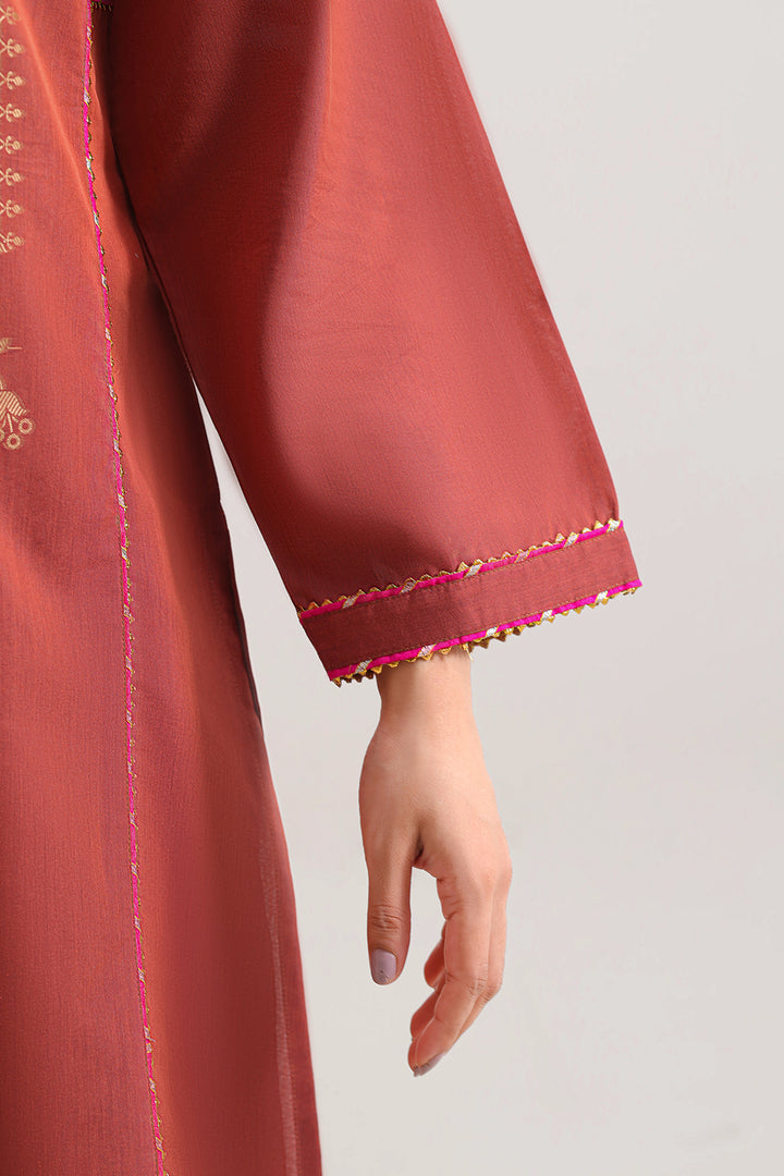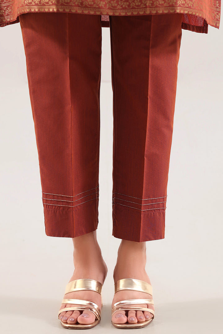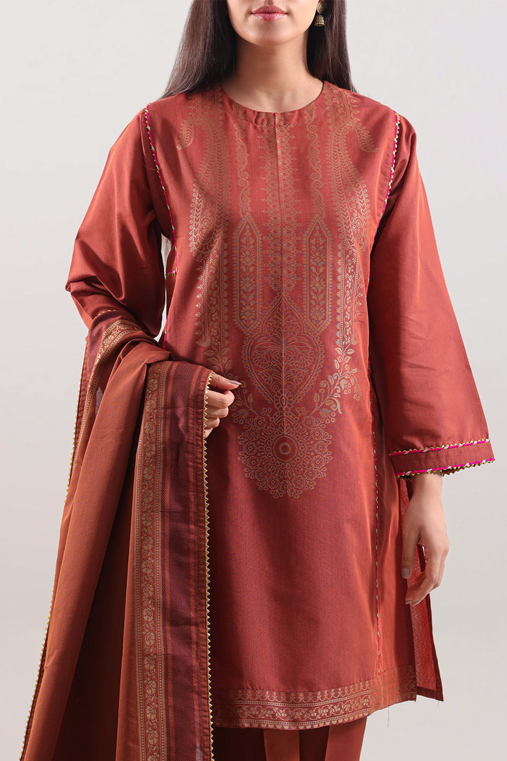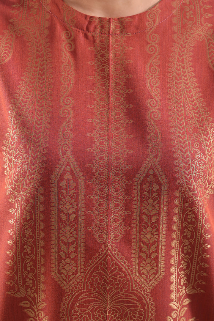 Elevate Your Everyday Elegance With The SAYA Luxury Pret Cotton Jacquard Stitched Shirt & Trouser Set. Crafted From Premium Cotton Jacquard Fabric With A Rich Texture And Subtle Weave, This Ready-To-Wear Ensemble Features A Fully Stitched Shirt With Refined And A Coordinated Trouser For Polished Style. The Deep Rust Shade Adds Season-Ready Warmth, Making It Ideal For Festive Affairs, Smart Casual Gatherings Or Elevated Everyday Wear. The Clean Design, Premium Fabric And Coordinated Set Combine Utility With Fashion With Effortless Grace.