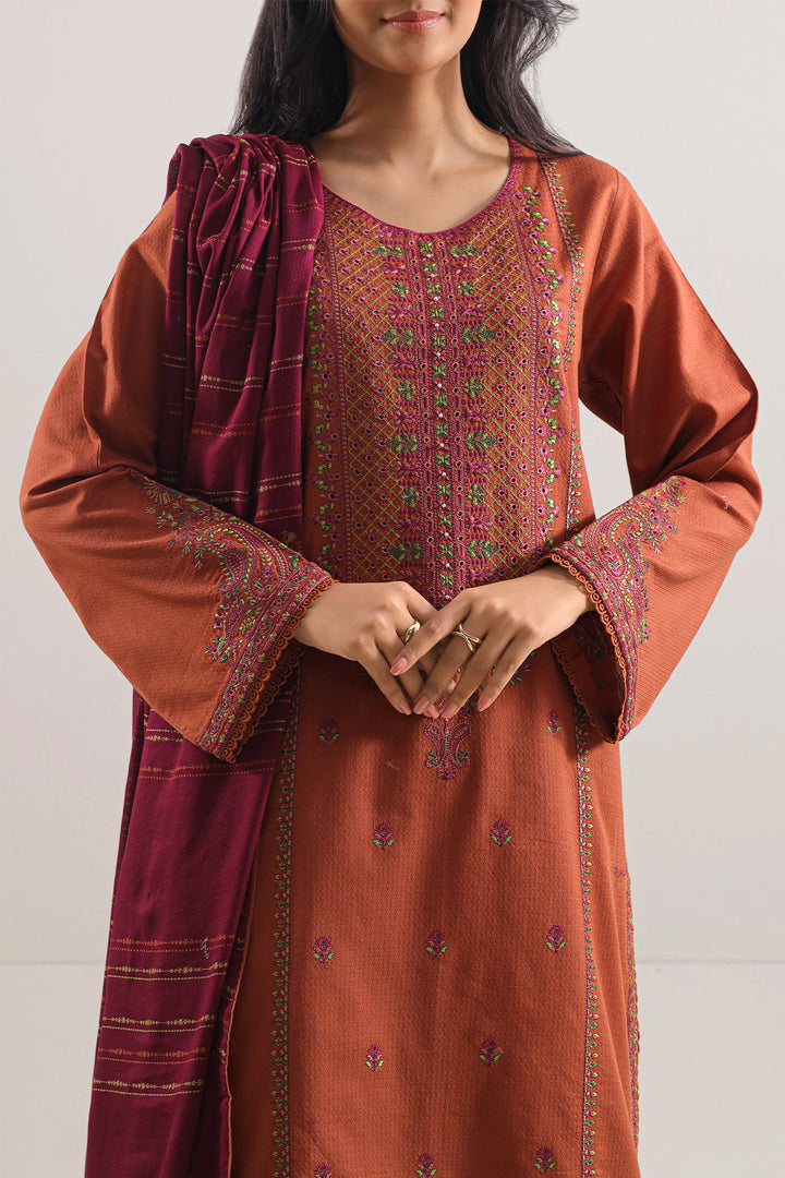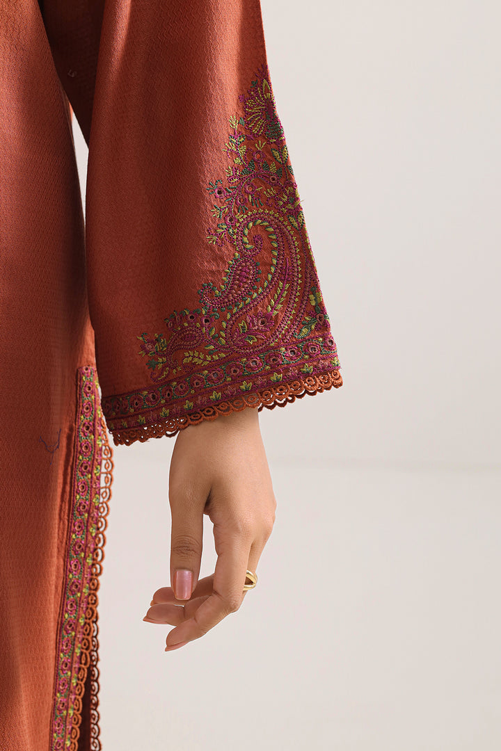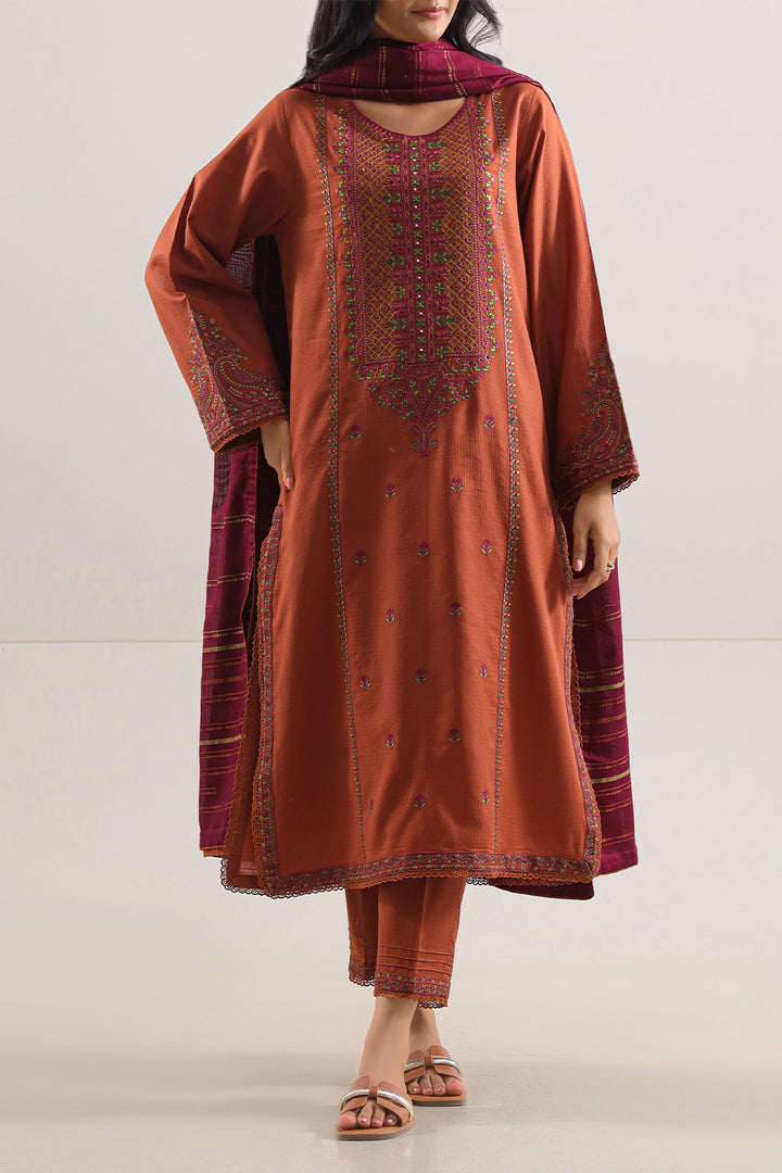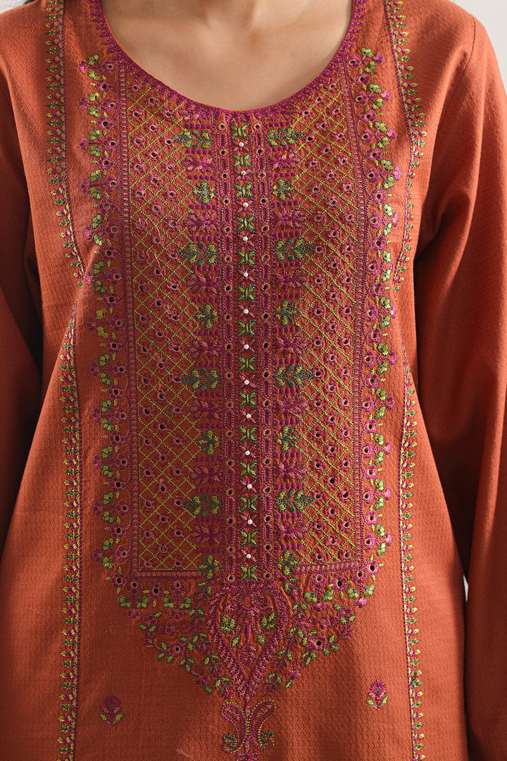 Elevate Your Occasion Look With This Luxurious Rust Luxury Pret Cotton Jacquard Stitched 3-Piece Set By SAYA. Fashioned From Premium Cotton Jacquard Fabric, The Ensemble Features A Ready-To-Wear Shirt Embellished With Intricate Embroidery, Accompanied By A Flowing Jacquard Dupatta For Graceful Drape, And Tailored Dyed Trousers That Offer Structure With Ease. Expertly Crafted For Formal Affairs, Festive Celebrations, Or Elevated Daytime Styling That Demands Poise And Refined Flair.