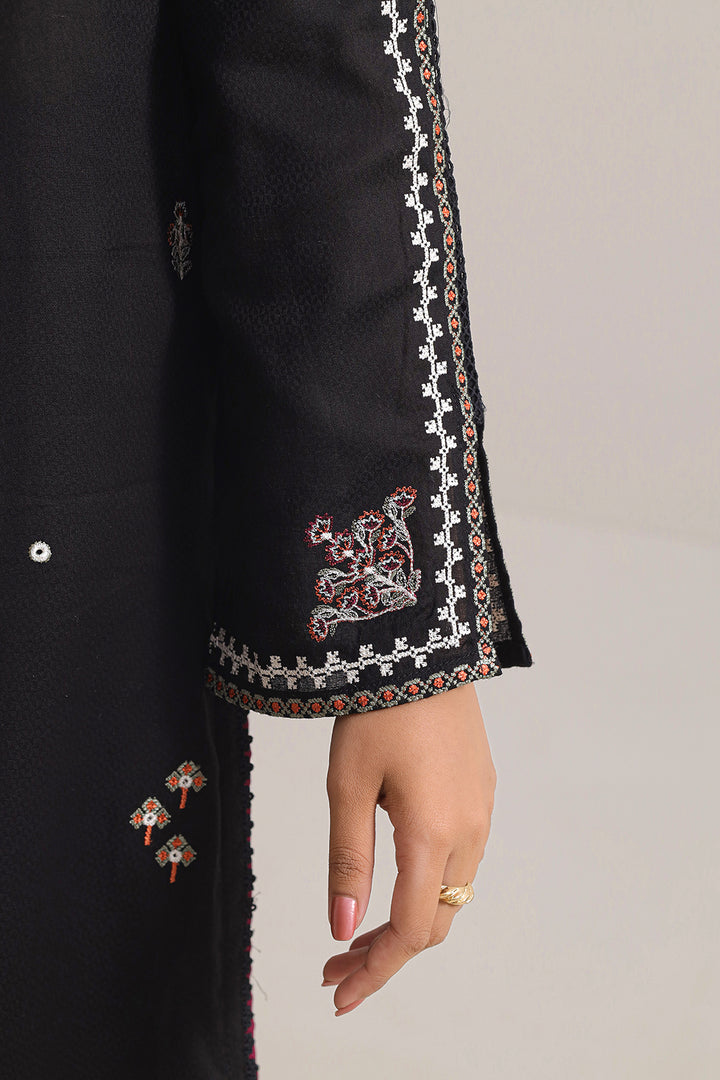 Luxury Pret Embroidered Cotton Jacquard 3-Piece By SAYA Crafted With Exquisite Cotton Jacquard Fabric That Offers Rich Texture And Elegant Weave. The Black Hue Paired With Intricate Embroidery Makes A Bold, Sophisticated Statement—Perfect For Evening Soirées, Formal Events, Or Festive Gatherings. This Fully Stitched Set Includes Shirt, Trouser, And Dupatta, Each Piece Tailored With Precision, Clean Seams, And A Flawless Finish. It Balances Opulent Design With Wearable Comfort, Elevating Any Wardrobe With Poised Grace.