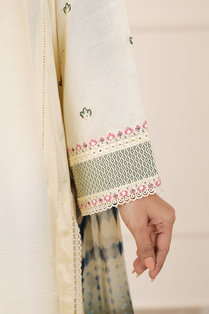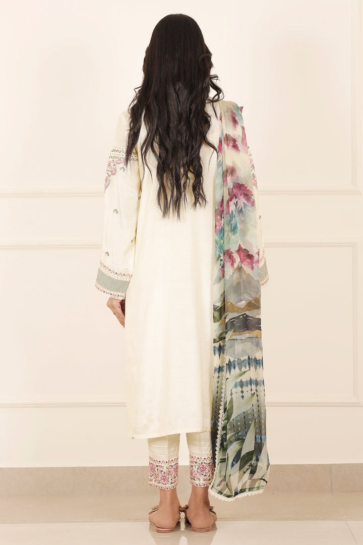 Experience timeless elegance with this luxury pret embroidered raw silk stitched 3-piece suit. Crafted from premium raw silk, the ensemble features intricate embroidery on the shirt, a complementing trouser, and a beautifully adorned dupatta. Perfect for formal gatherings and festive occasions, this outfit radiates sophistication with a modern touch.