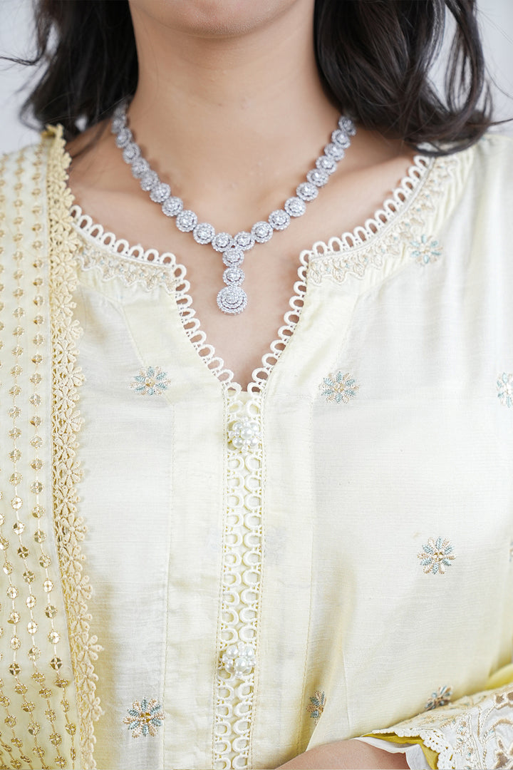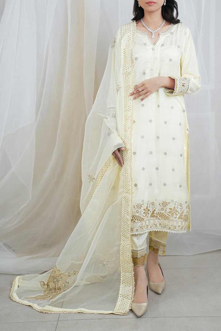 Elevate your festive wardrobe with this luxury pret embroidered raw silk stitched 3-piece from Saya.pk. Made with high-quality raw silk, the set features rich embroidery and a timeless silhouette—perfect for special occasions and evening events with a modern, graceful appeal.