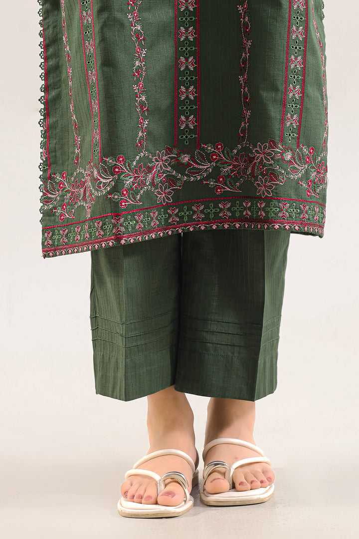 Elevate Your Style With This Elegant Three-Piece Ensemble From SAYA, Crafted In Slub Cotton That Offers Gentle Texture, Breathable Wear And A Soft Drape. The Ready-To-Wear Shirt Features Fine Embroidery Detailing On A Base And Expert Stitching For A Flawless Finish. Accompanied By A Coordinated Dupatta And A Dyed Trouser That Matches Effortlessly, This Set Is Ideal For Semi-Formal Gatherings, Daytime Receptions Or Polished Everyday Wear. A Thoughtful Fusion Of Fabric Quality, Embellished Design And Ready-To-Wear Grace.