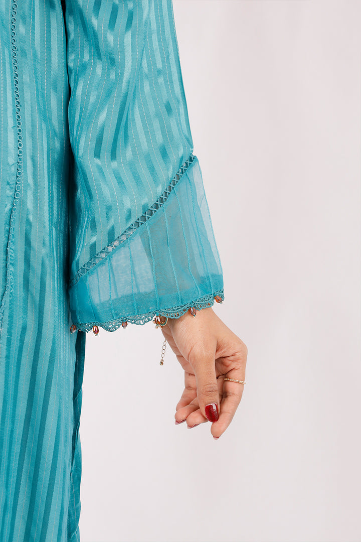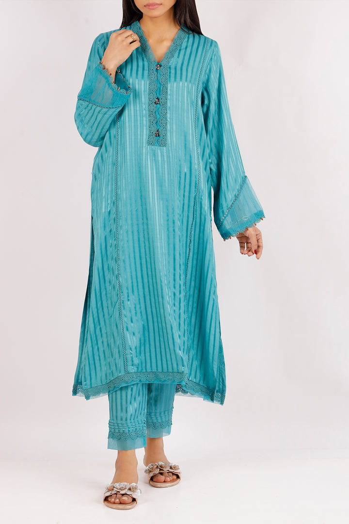 Introducing Saya's Luxury Pret Embroidered Zari Mesuri Stitched Shirt in a sophisticated sea green hue. This ready-to-wear shirt is crafted from premium Zari Mesuri fabric, known for its subtle sheen and luxurious feel. The shirt features intricate embroidery, adding a touch of elegance to its design, making it suitable for both formal and semi-formal occasions.