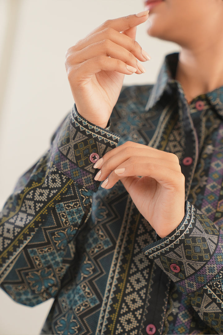 Experience effortless style with Saya's Printed Cotton Viscose Stitched Shirt. Made from a premium blend of cotton and viscose, this shirt offers a lightweight and breathable feel, making it perfect for casual and semi-formal wear. The artistic print adds charm and elegance to your everyday wardrobe.