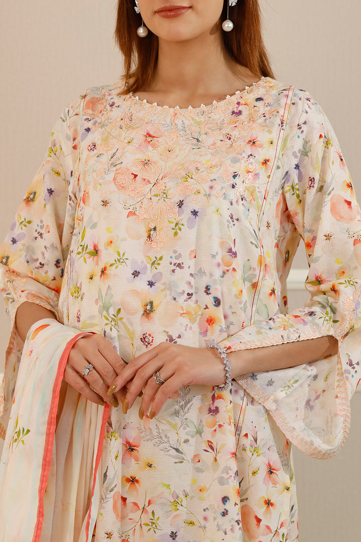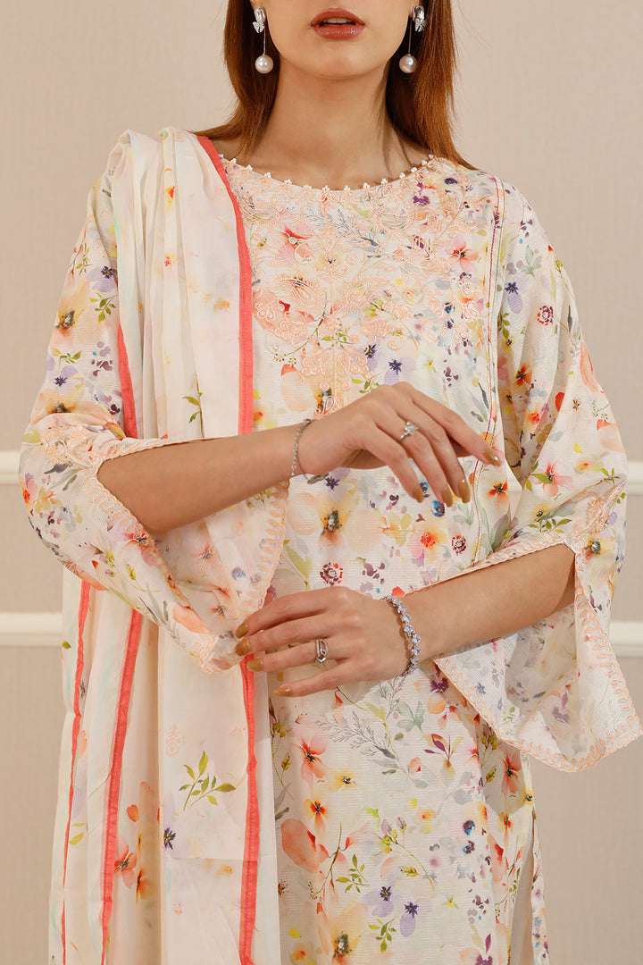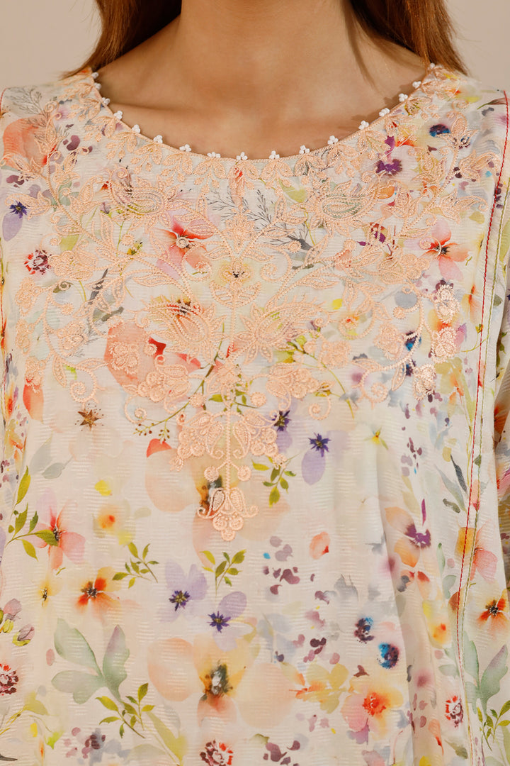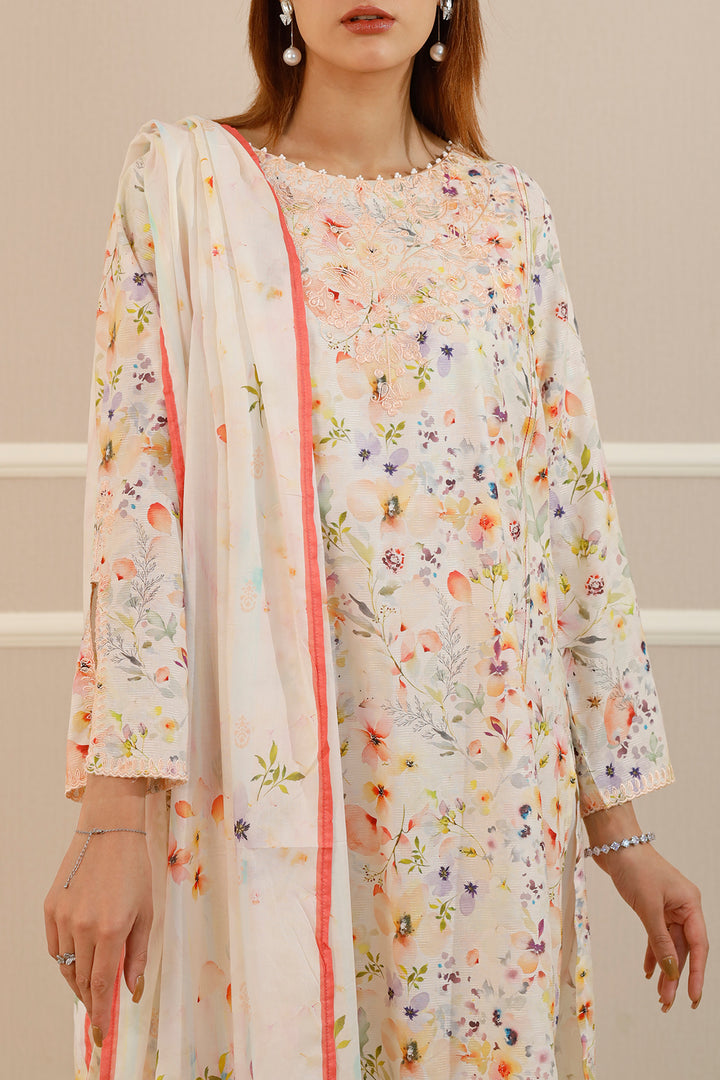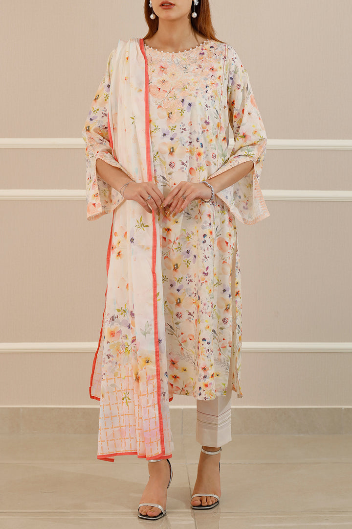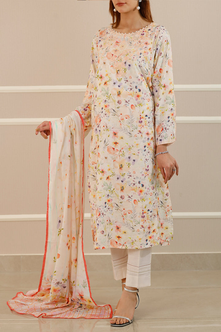 Introducing Saya's Printed Embroidered Cotton Jacquard Stitched 3-Piece ensemble, a perfect blend of elegance and comfort. This ready-to-wear set features an intricately embroidered cotton jacquard shirt, a dyed stitched trouser, and a coordinating lawn dupatta. The premium cotton jacquard fabric ensures breathability and durability, making it ideal for festive occasions and special events.