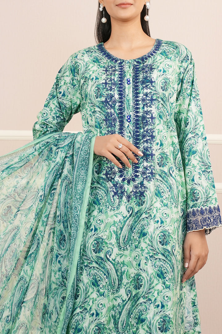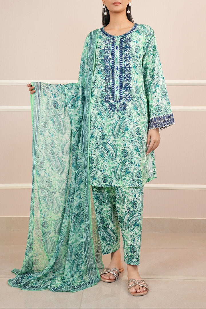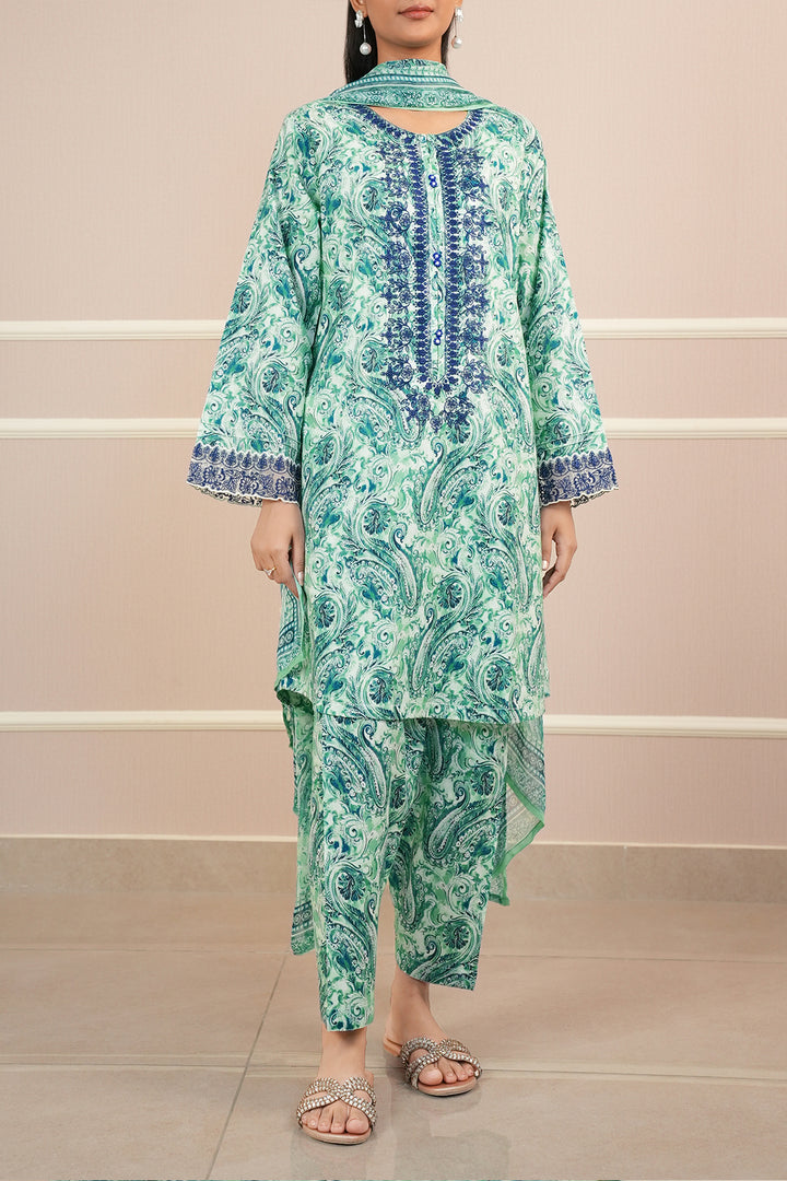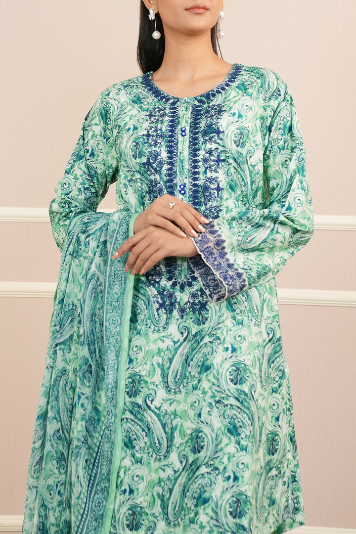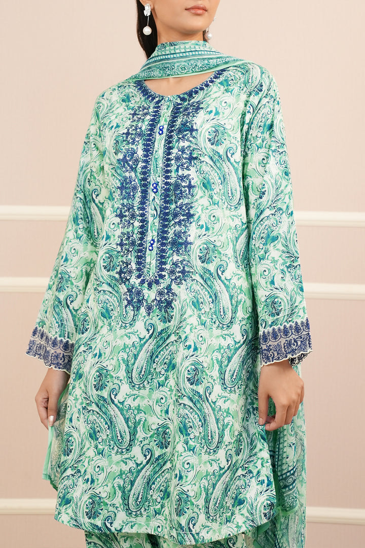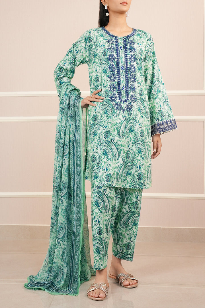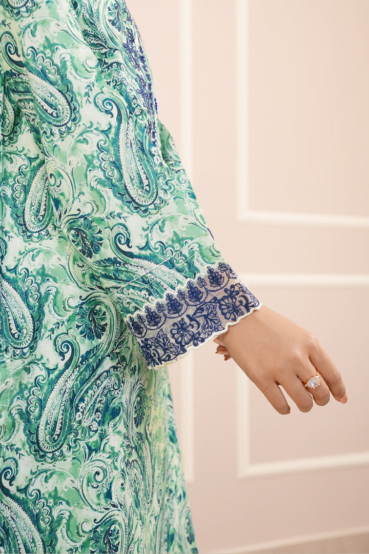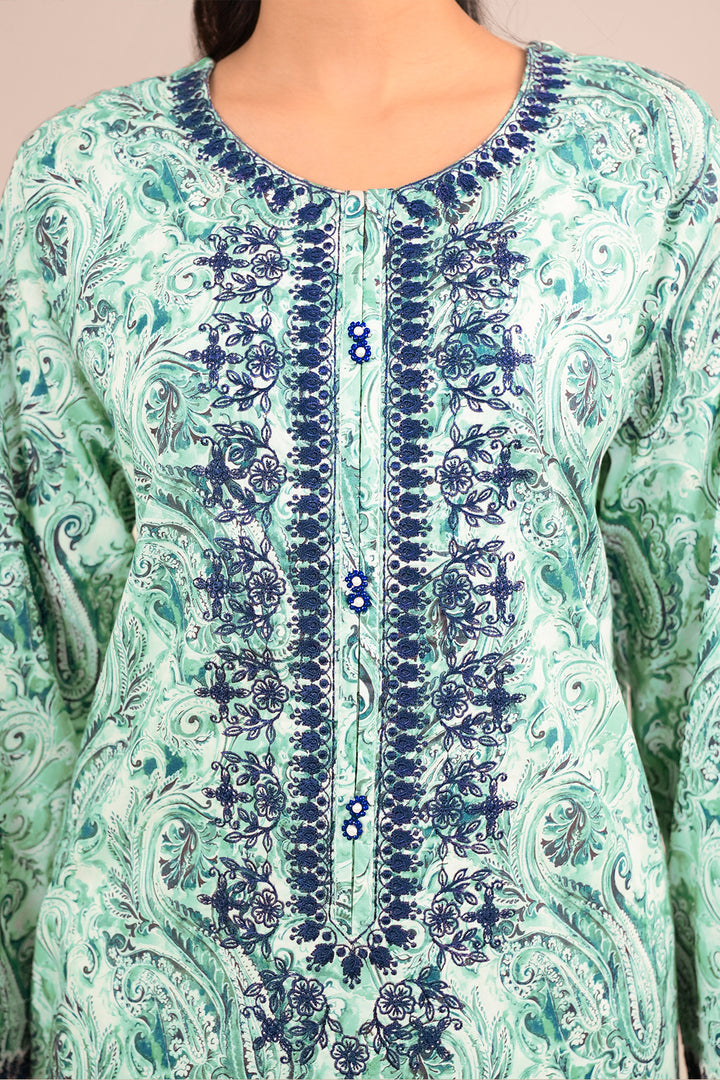 Introducing Saya's Printed Embroidered Lawn Stitched Shirt in a refreshing sea green hue. This ready-to-wear shirt is crafted from premium lawn fabric, known for its lightweight and breathable qualities, making it ideal for warm weather. The shirt features intricate embroidery that adds a touch of elegance to the vibrant print, ensuring you stand out on any occasion.