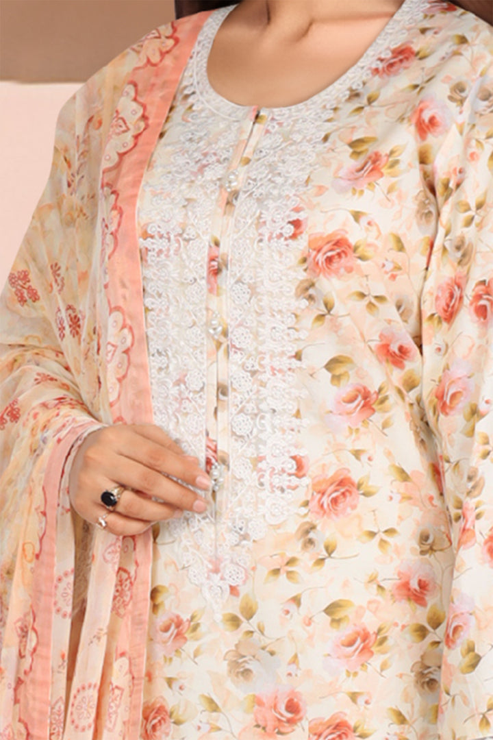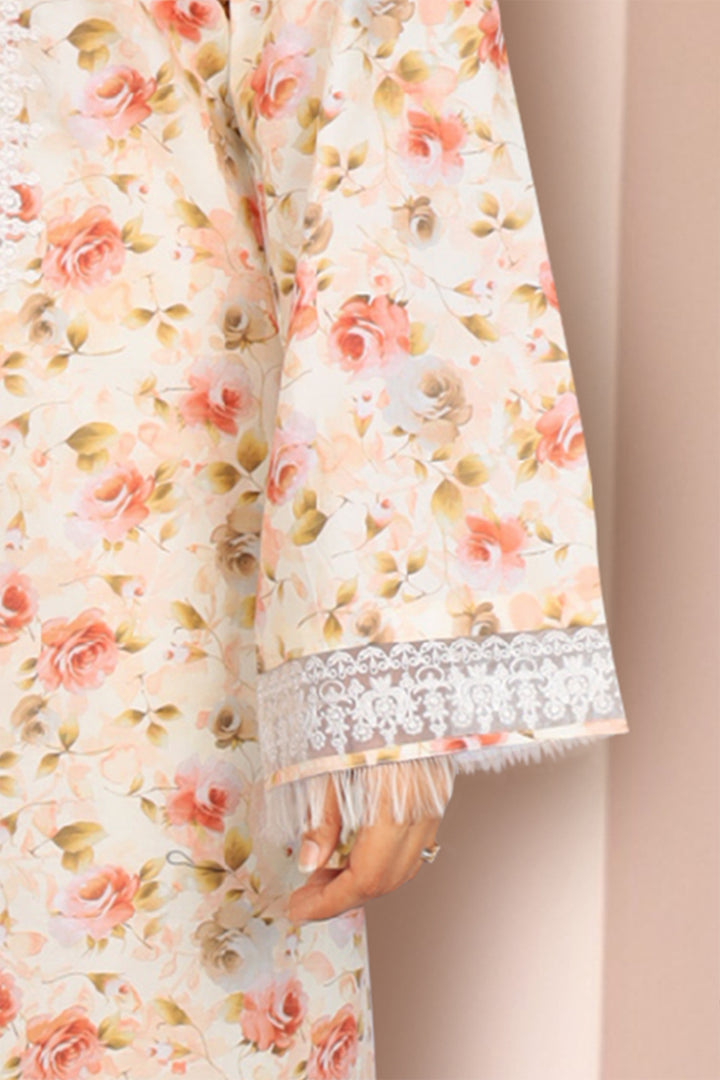 Unstitched Printed Embroidered Lawn 2-Piece By SAYA Features Sumptuously Soft Printed Lawn Fabric In A Delicate Peach Tone, Enhanced With Intricate Organza-Trimmed Embroidered Sleeve Borders, And A Complementary Dyed Cambric Trouser. Designed On A Wide Shirt Canvas And Crafted For Tailoring Ease, This Ensemble Delivers Stylish Versatility Without Compromising Comfort Or Elegance—Ideal For Festive Gatherings, Semi-Formal Affairs, Or Graceful Everyday Fashion.