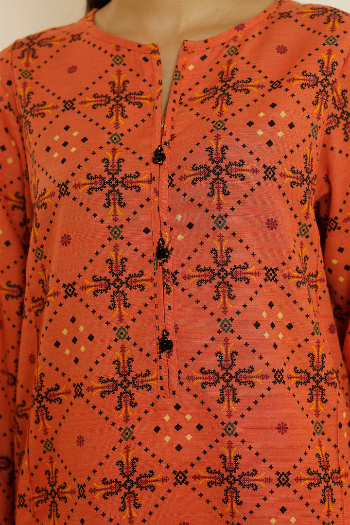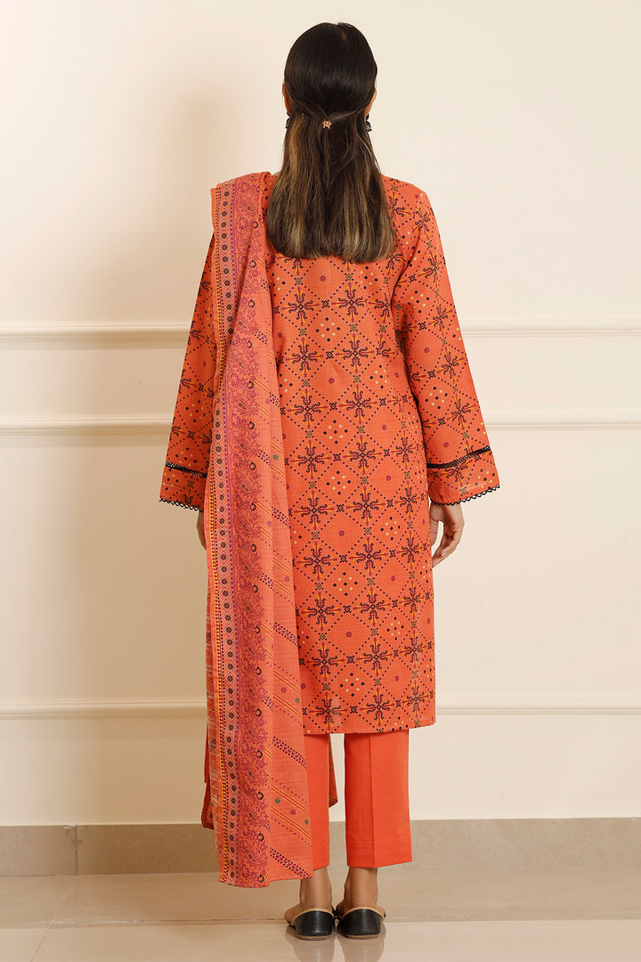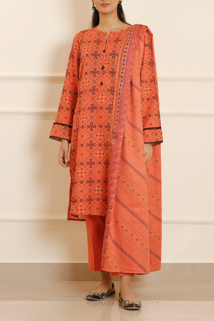 Elevate your winter wardrobe with Saya's printed khaddar stitched 3-piece set. This ensemble features a beautifully printed shirt, trouser, and a complementing dupatta, crafted from premium khaddar fabric for a cozy yet stylish look. Ideal for casual outings or daily wear.