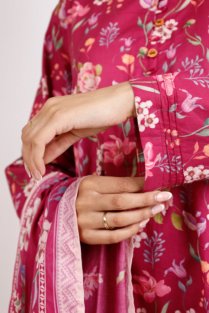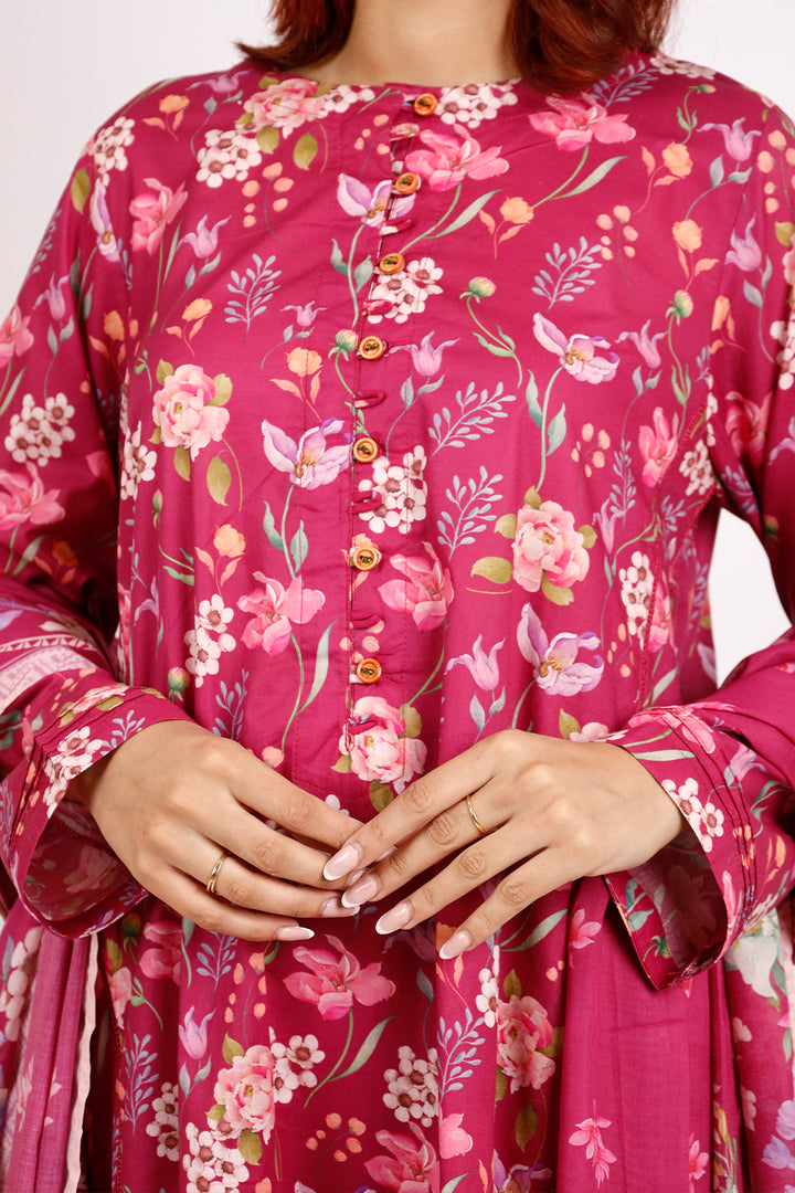 The Printed Lawn Stitched 2-Piece Set in dark fuchsia offers a vibrant, ready-to-wear ensemble for casual outings. This set features a printed lawn shirt and matching trouser, blending comfort and style seamlessly. Perfect for adding bold colors to your wardrobe.