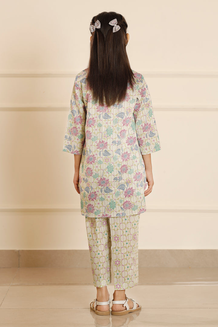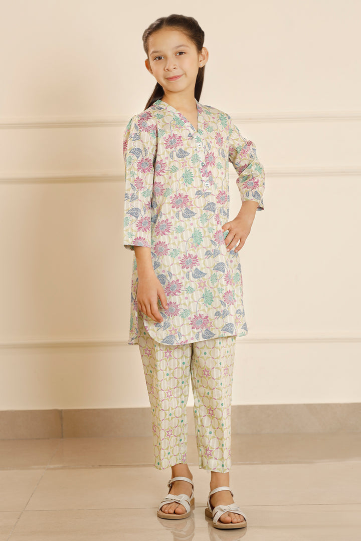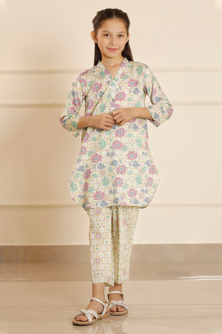 Introducing Saya's Printed Lawn Stitched 2-Piece Shirt and Trouser Set for Kids, designed to provide both comfort and style for your little ones. Crafted from premium lawn fabric, this ensemble features a charming ivory-colored printed shirt paired with matching trousers, making it perfect for casual outings and family gatherings.