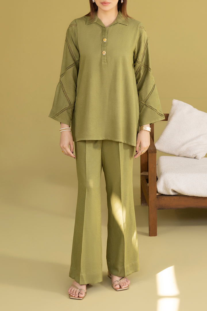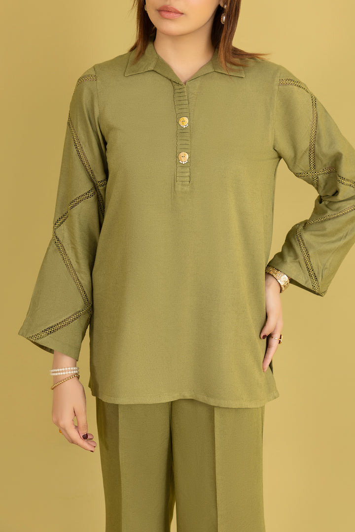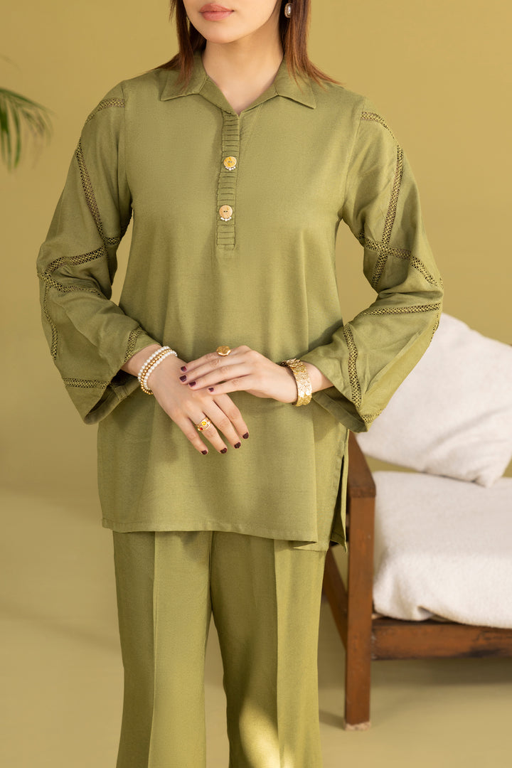 Solid Acrylic Jacquard Embroidered Stitched Shirt By SAYA, Crafted From Lightweight Acrylic Fabric That Combines Breathability With A Rich Texture. Draped In A Vibrant Olive Green Tone With Elegant Embroidery Details Along The Yoke And Sleeves, This Ready-To-Wear One-Piece Shirt Offers Polished Craftsmanship And Comfort. Fine Stitching And Structured Silhouette Ensure It Stands Out For Daytime Gatherings, Office Wear Or Semi-Formal Outings. A Statement Single Piece That Mixes Bright Color, Refined Embroidery And Everyday Wearability