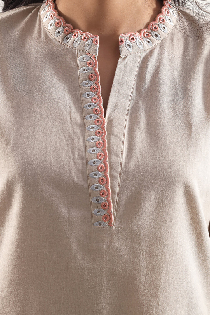 Solid Embroidered Cambric Stitched 2-Piece By SAYA Arrives In A Refined Beige Tone. Crafted From Lightweight, Soft Cambric Fabric That Breathes With Ease, The Shirt Features Subtle Tone-On-Tone Embroidery For A Touch Of Elegance. Paired With A Matching Ready-To-Wear Trouser, This Set Combines Polished Styling With Everyday Comfort—Ideal For Office Wear, Daytime Gatherings, Or Smart Casual Looks.