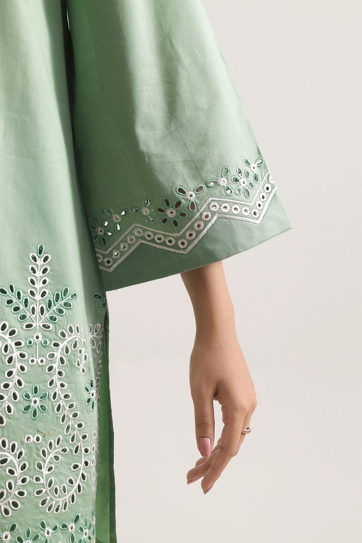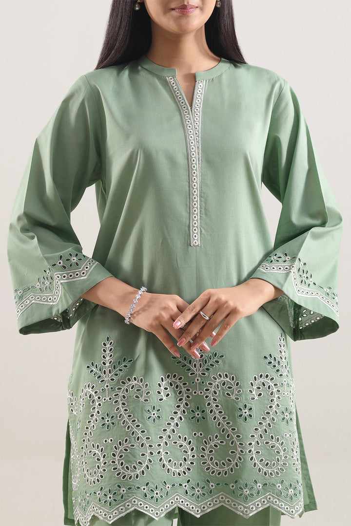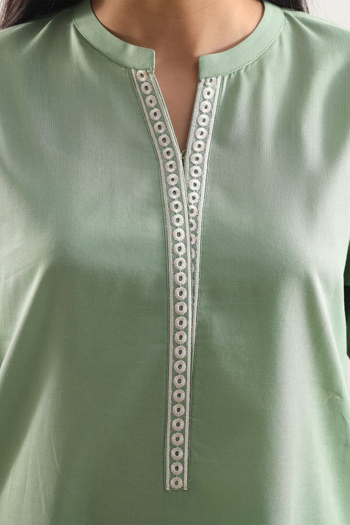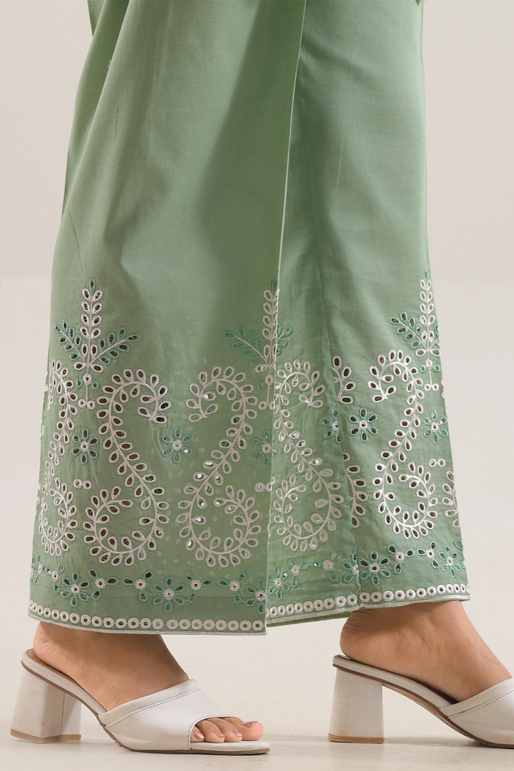 Solid Embroidered Cambric Stitched 2-Piece By SAYA Features A Refined Light Green Tone. Crafted From Lightweight Cambric Fabric That Delivers Both Comfort And Breathability, The Shirt Panel Is Enhanced With Subtle Tone-On-Tone Embroidery For An Elegant Touch. Paired With A Matching Trouser That Offers Structure And Ease, This Ready-To-Wear Ensemble Is Ideal For Office Wear, Daytime Events, Or Smart Casual Outings Where Understated Style Is Key.
