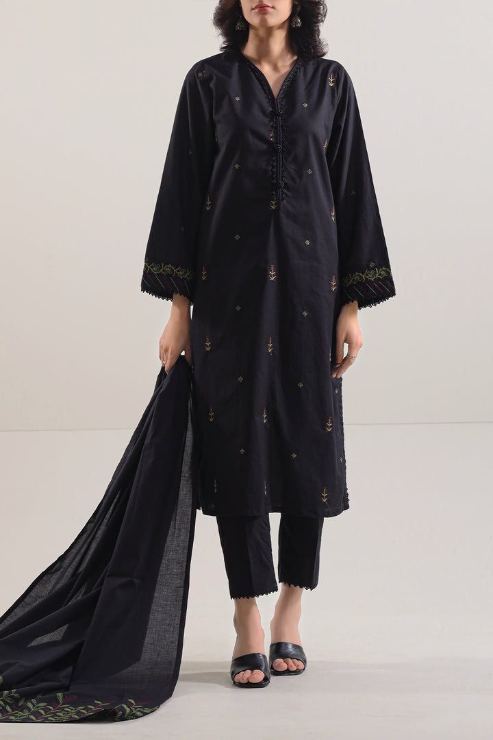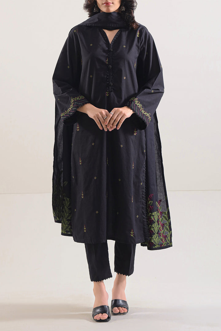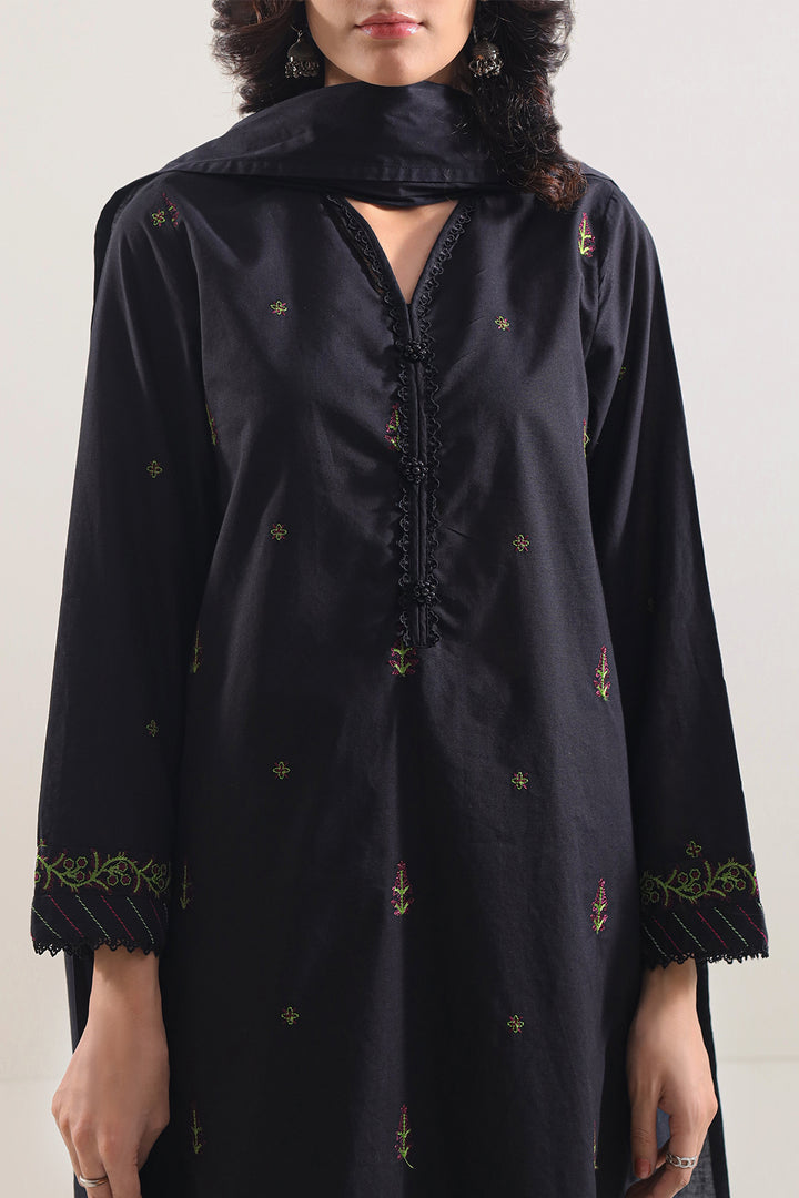 Black Solid Embroidered Cotton Stitched 3-Piece From SAYA Includes Ready-To-Wear Shirt, Jacquard Dupatta, And Dyed Trouser. Premium Cotton Shirt Is Adorned With Refined Embroidery, Providing Subtle Elegance. Dupatta Offers Textured Contrast With Jacquard Weave; Trouser Is Cleanly Tailored For Comfort. Ideal For Formal Events, Evening Gatherings, Or Coordinated Festive Looks Where Elegance And Comfort Are Both Important.