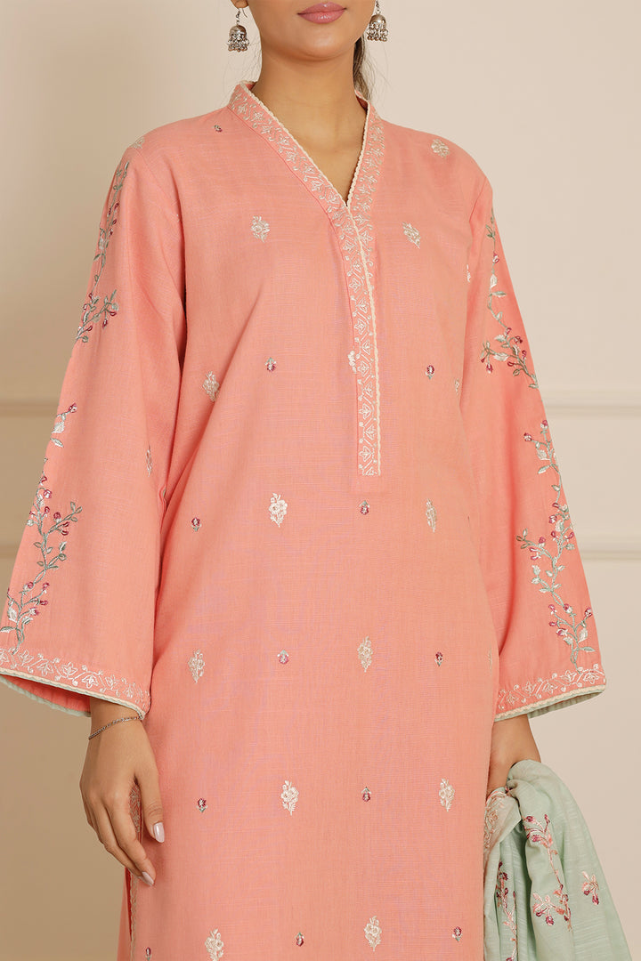 Enhance your wardrobe with this Solid Embroidered Cotton Viscose Stitched 3-Piece ensemble. Designed for elegance and comfort, this premium cotton-viscose outfit features delicate embroidery, ensuring a graceful look for any occasion. The soft, breathable fabric offers effortless wear, making it a must-have for your seasonal collection.