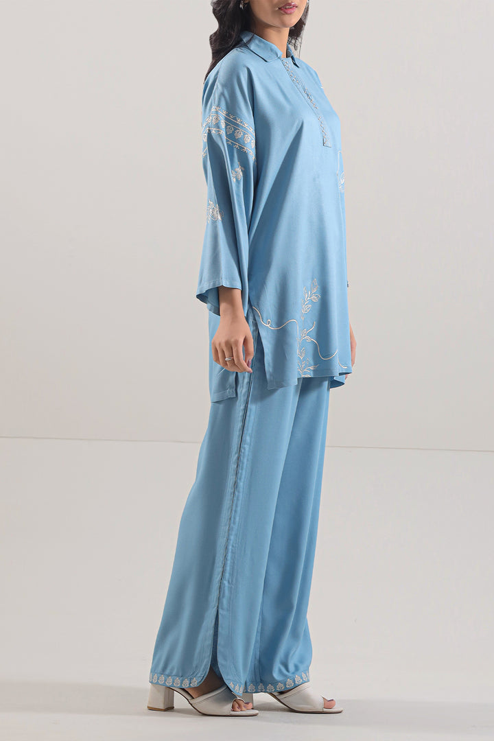 Solid Embroidered Dobby Crepe Stitched 2-Piece By SAYA Flaunts A Sleek Blue Tone. The Dobby Crepe Fabric Delivers Refined Texture And A Subtle Matte Finish, While The Tone-On-Tone Embroidery Adds Delicate Flair Without Overpowering. With Expert Stitching, A Sharp Collar, And A Clean Silhouette In The Shirt, Paired With A Matching Trouser That Offers Structure And Ease, This Ensemble Delivers Polished Style With Minimal Effort. Ideal For Office Affairs, Semi-Formal Evenings, Or Elegant Daywear.