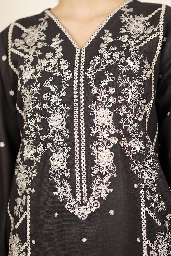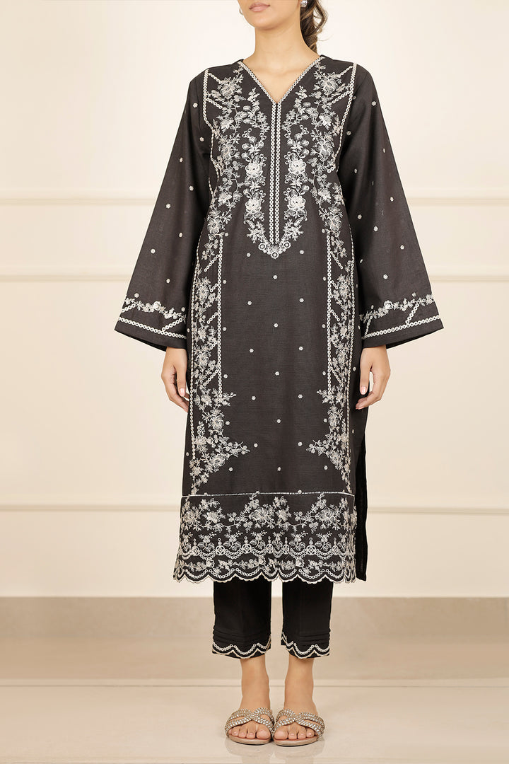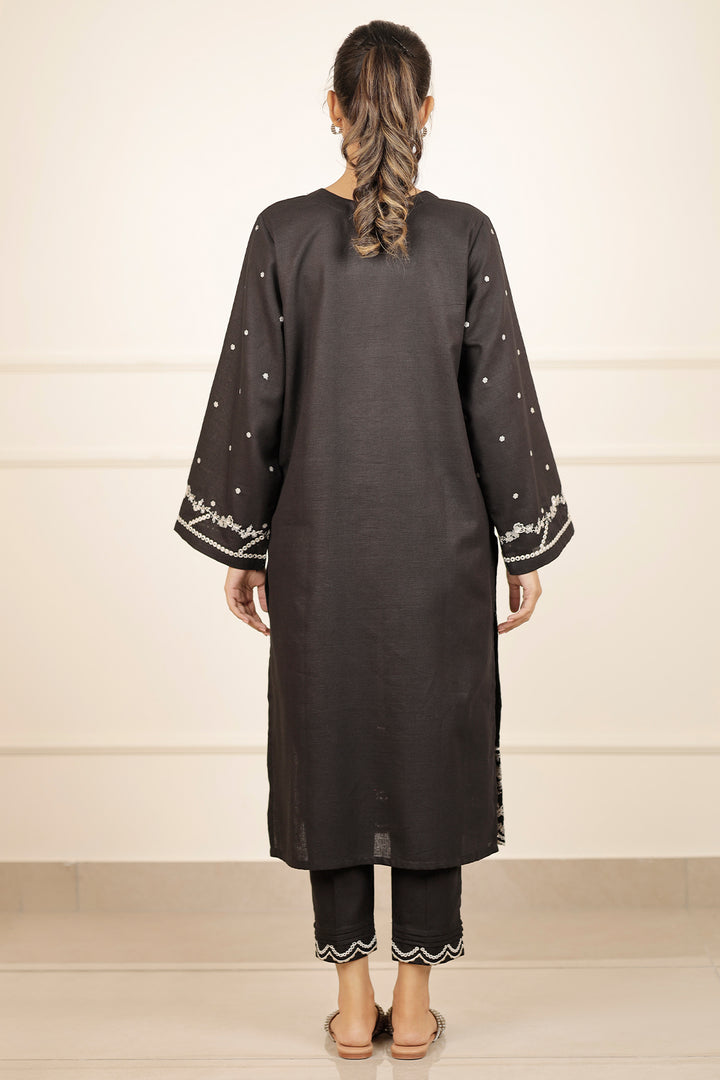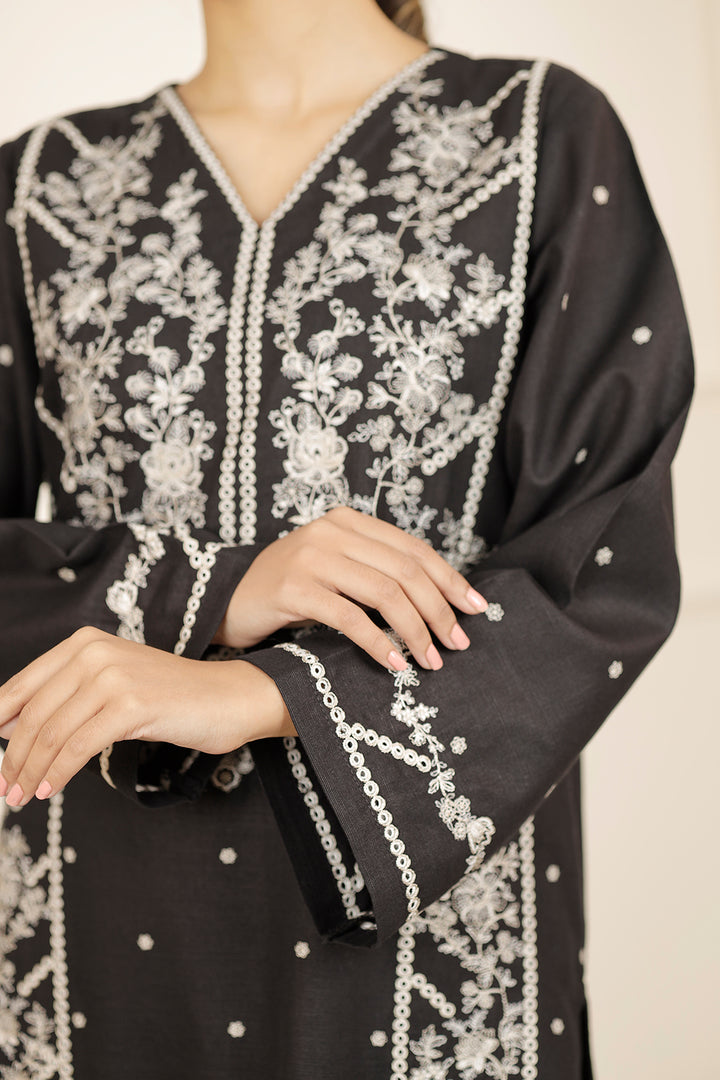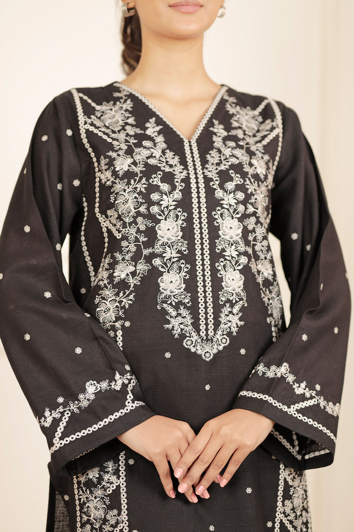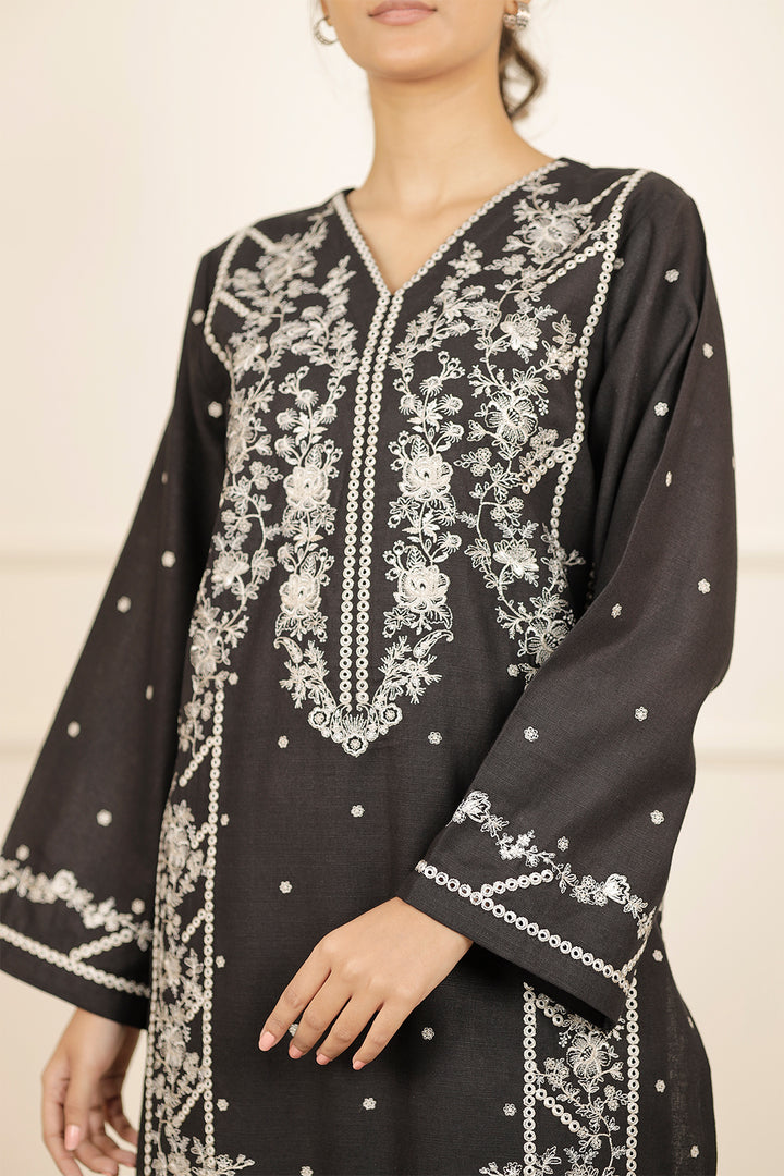 Introducing Saya's Solid Embroidered Khaddar Stitched 2-Piece ensemble, a perfect blend of warmth and elegance for your winter wardrobe. This ready-to-wear set features a black khaddar shirt adorned with intricate embroidery, paired with matching stitched trousers, making it ideal for both casual and semi-formal occasions.
