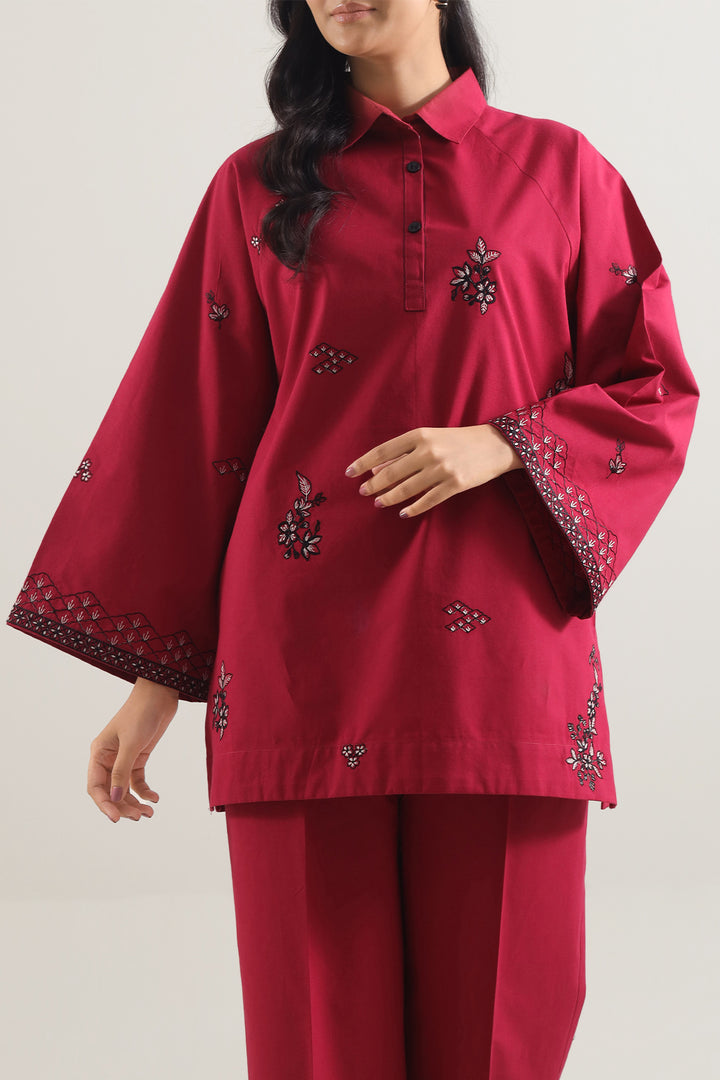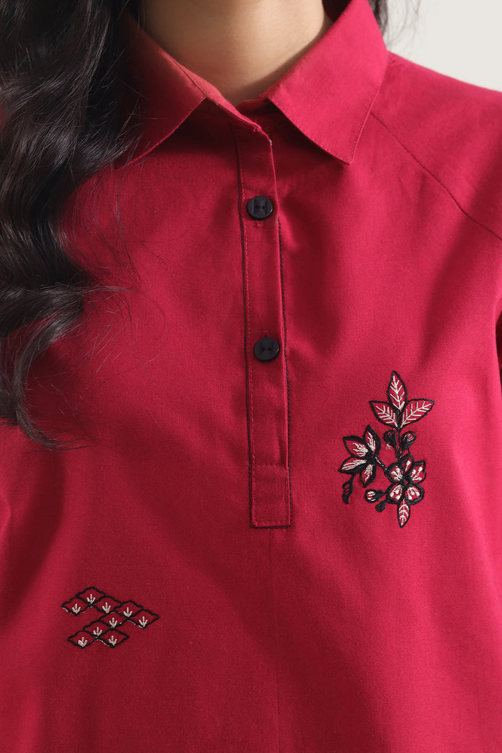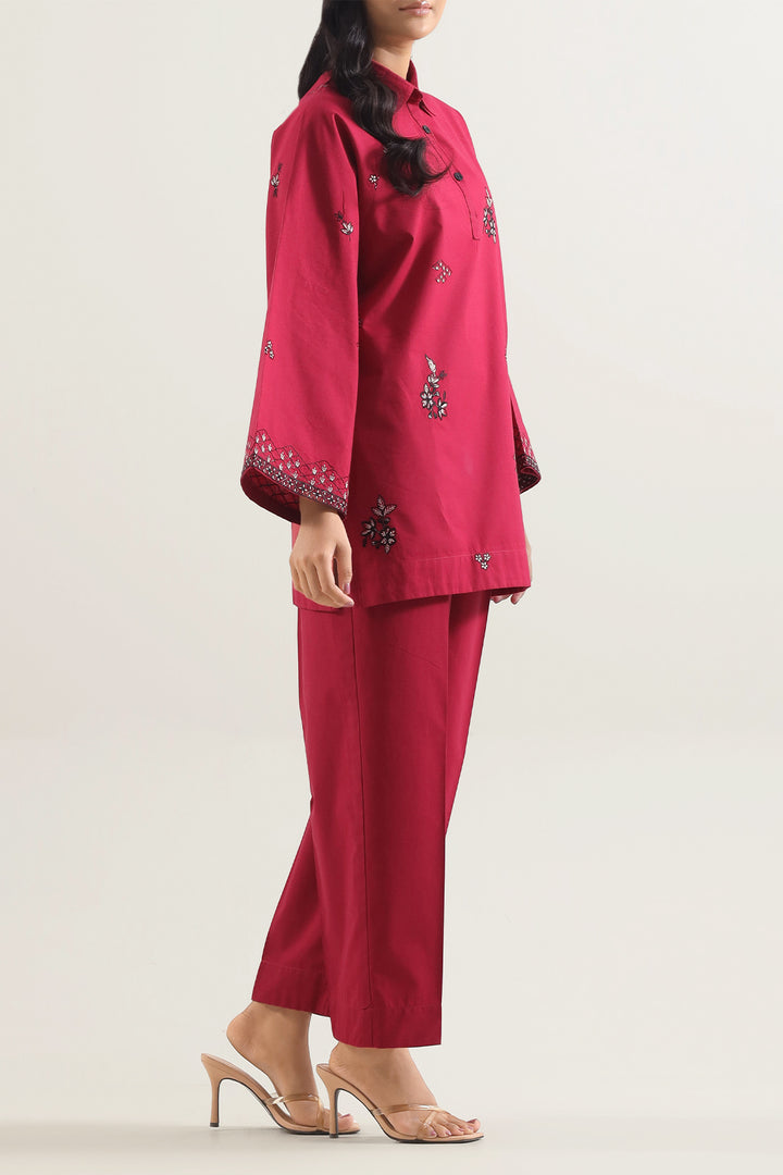 Refined And Versatile, This Ready To Wear Two Piece Set Features Light Poplin Fabric That Balances Crisp Structure With Comfortable Breathability. The Shirt Is Accented With Subtle, Tone On Tone Embroidery That Adds Texture Without Overpowering The Clean Solid Base. Paired With A Matching Trouser In The Same Fabric And Shade, The Ensemble Delivers Effortless Style, Ideal For Semi Formal Gatherings, Smart Casual Outings Or Elevated Everyday Looks.