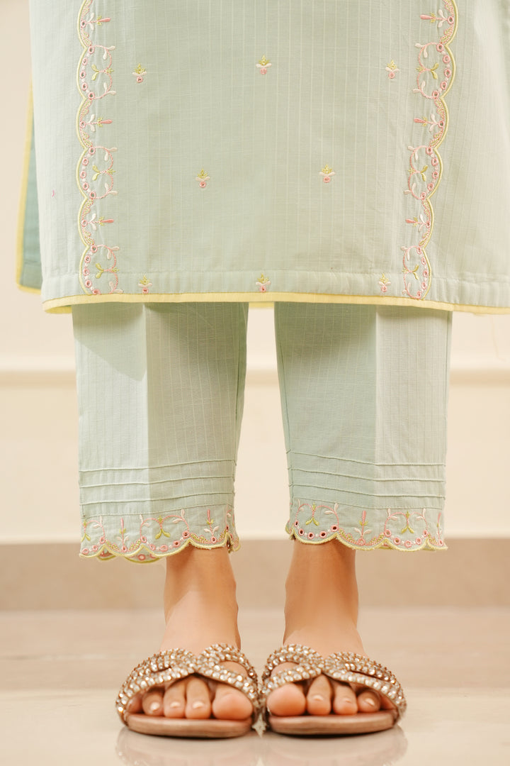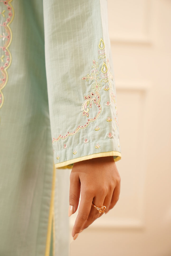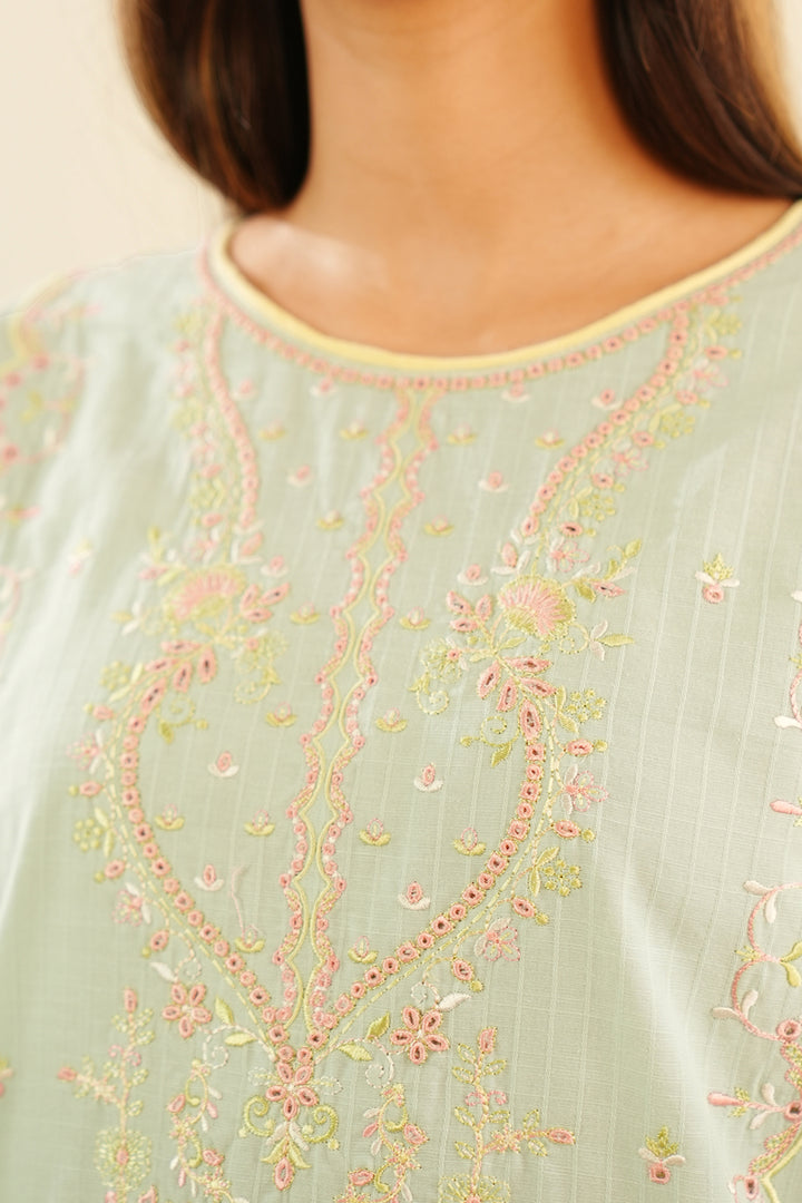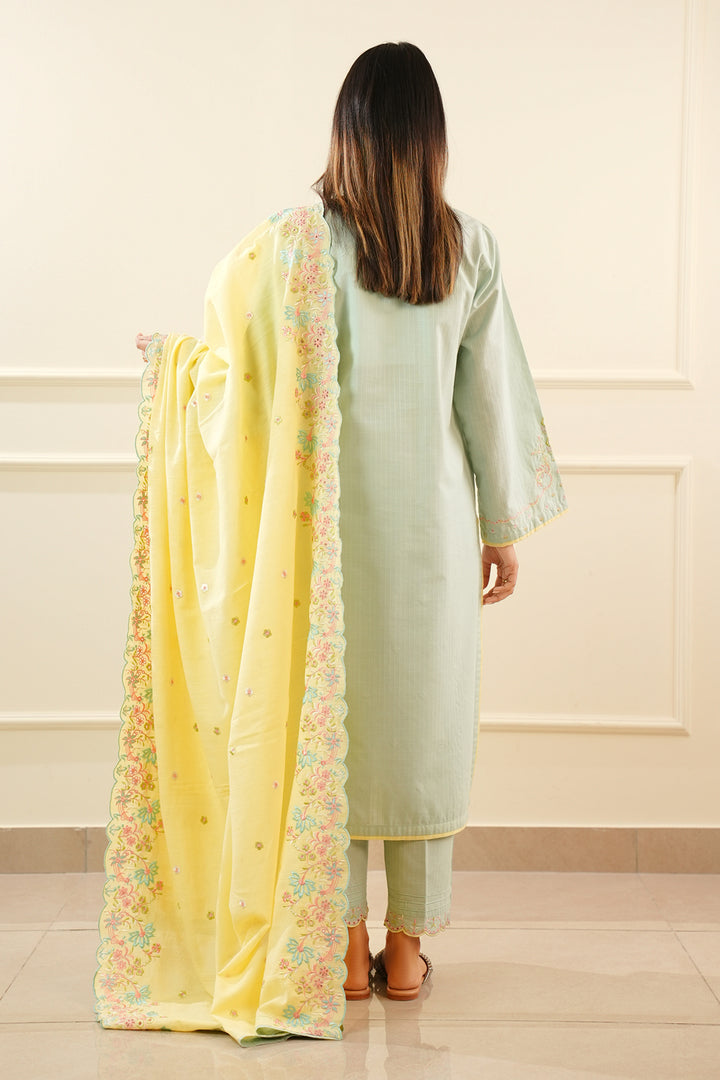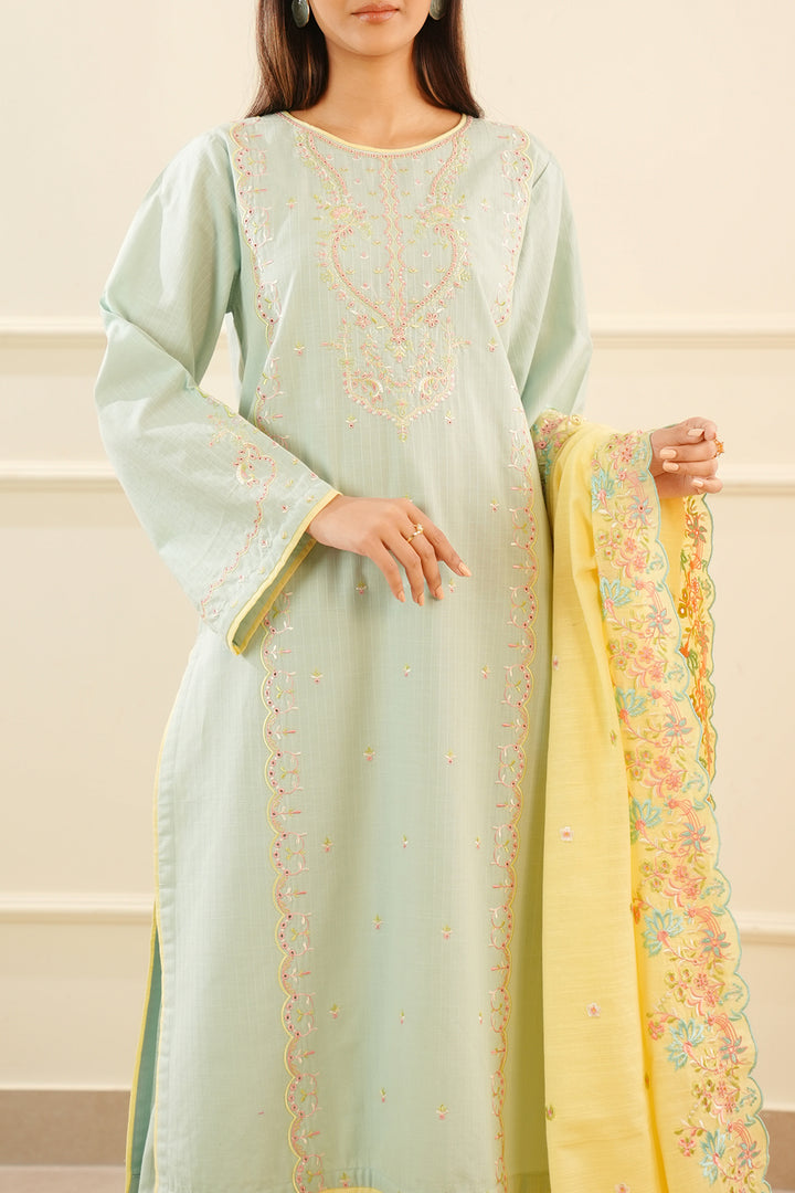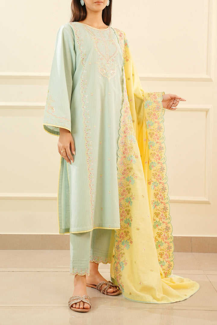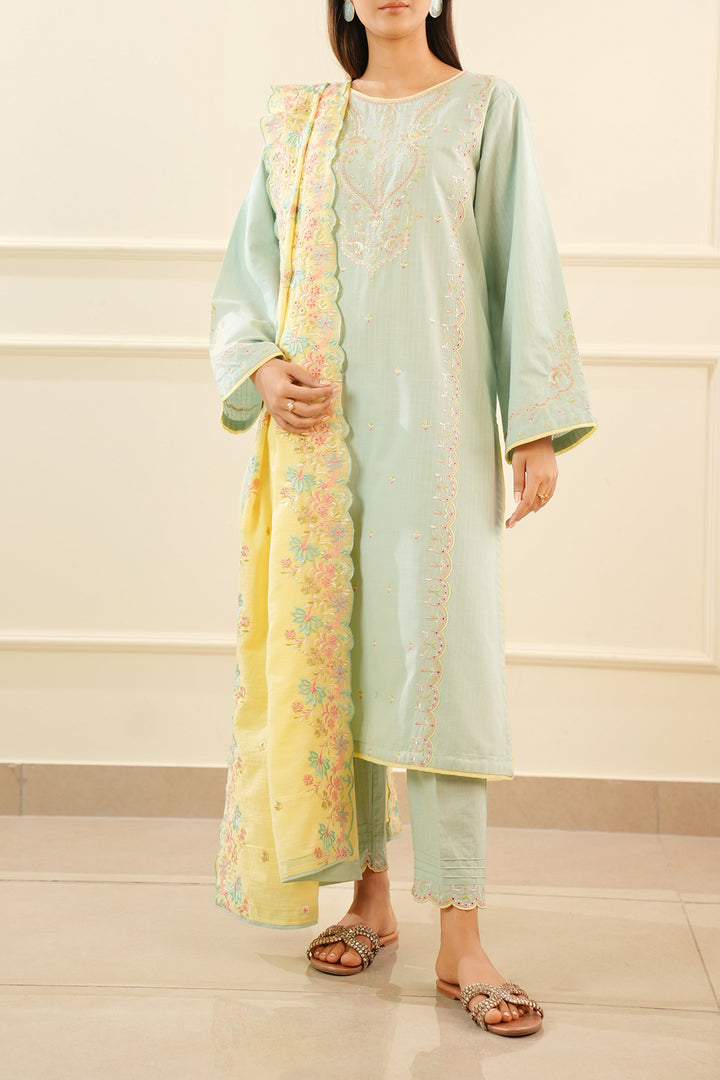 Introducing Saya's Solid Embroidered Slub Cotton Stitched 3-Piece ensemble, a perfect blend of elegance and comfort. This ready-to-wear set features a beautifully embroidered slub cotton shirt, a dyed stitched trouser, and a coordinating winter cotton dupatta. Crafted from premium slub cotton, the outfit ensures breathability and durability, making it ideal for both casual and formal occasions.