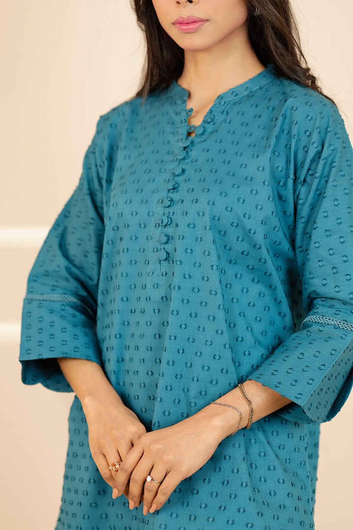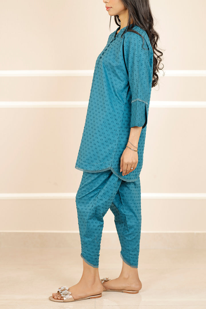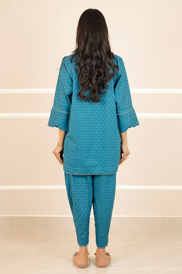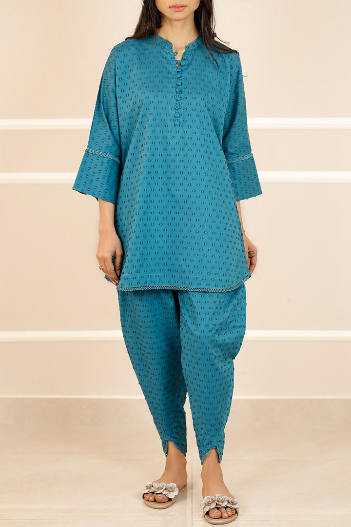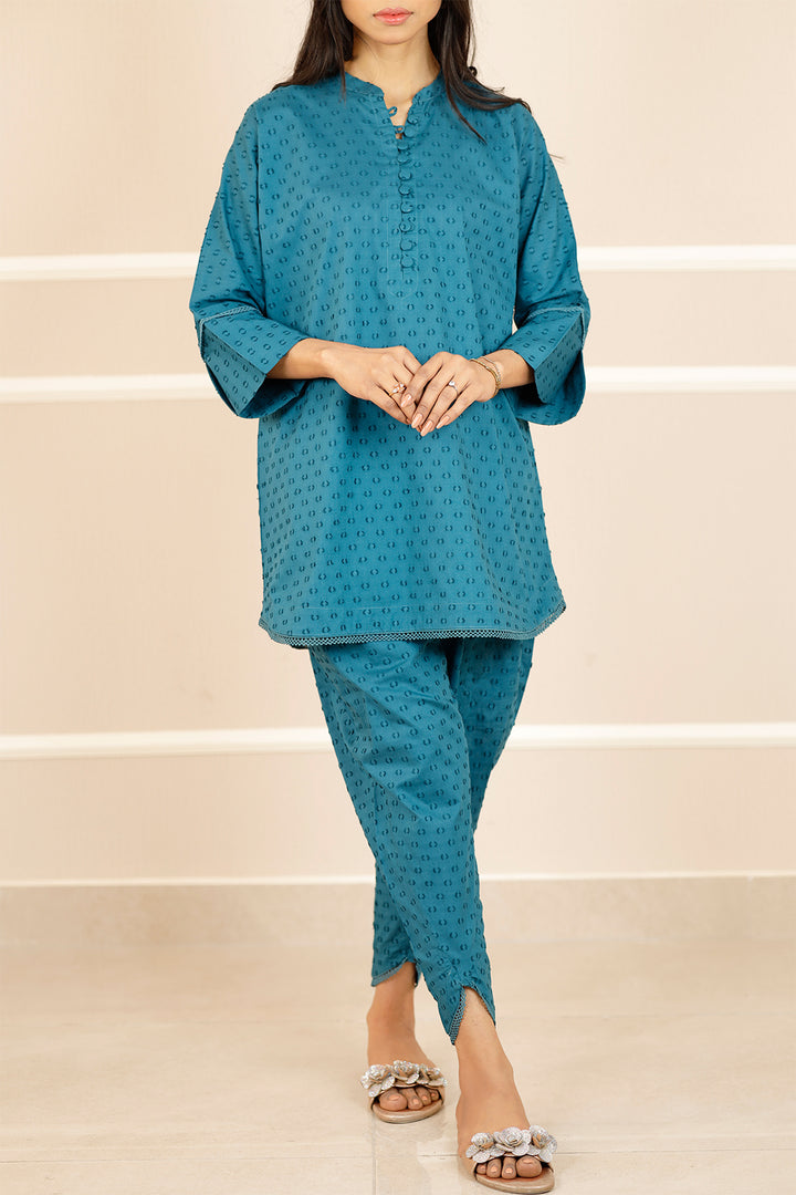 Introducing Saya's Solid Reverse Jacquard Stitched 2-Piece ensemble, a perfect blend of elegance and comfort for your wardrobe. This ready-to-wear set features a luxuriously textured reverse jacquard shirt paired with matching trousers, making it suitable for both casual and semi-formal occasions.