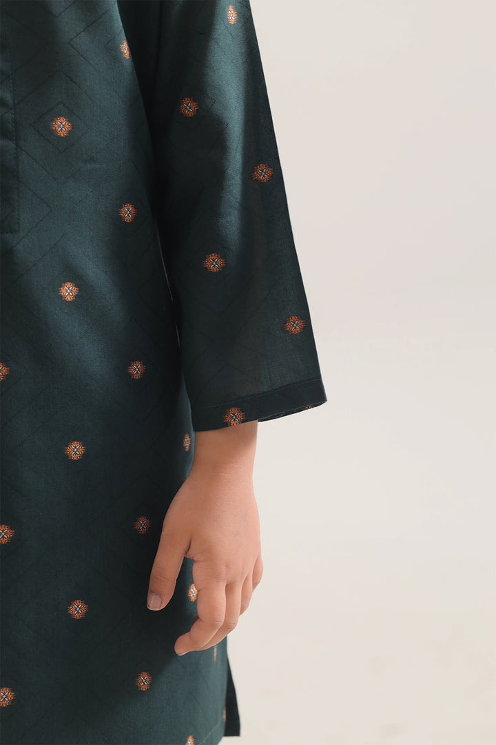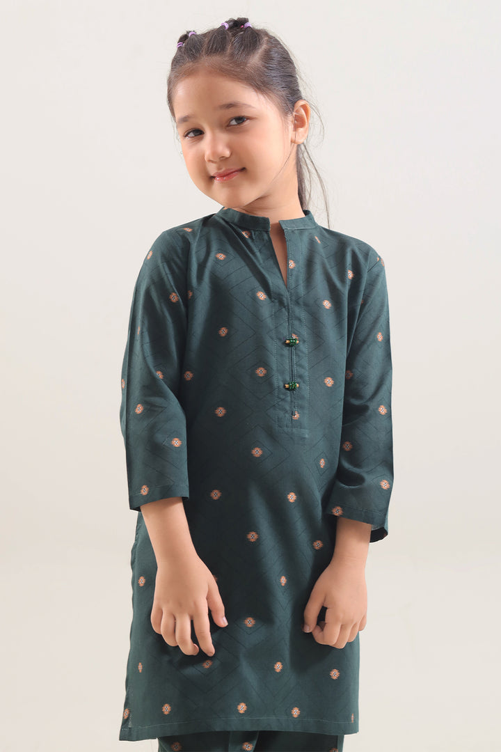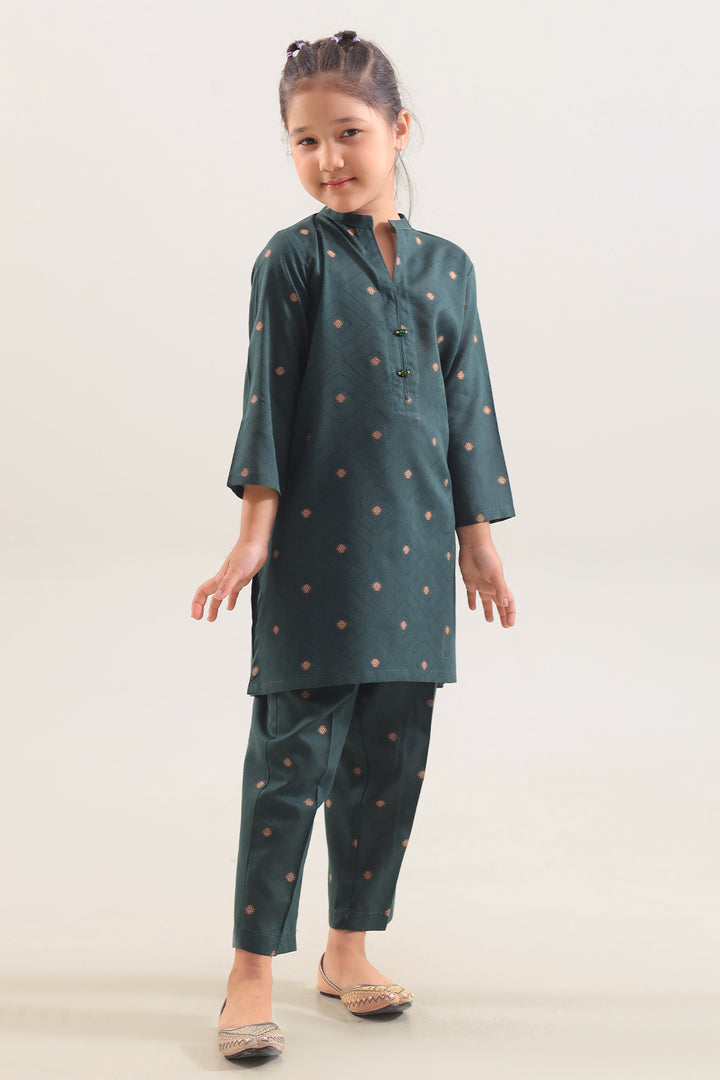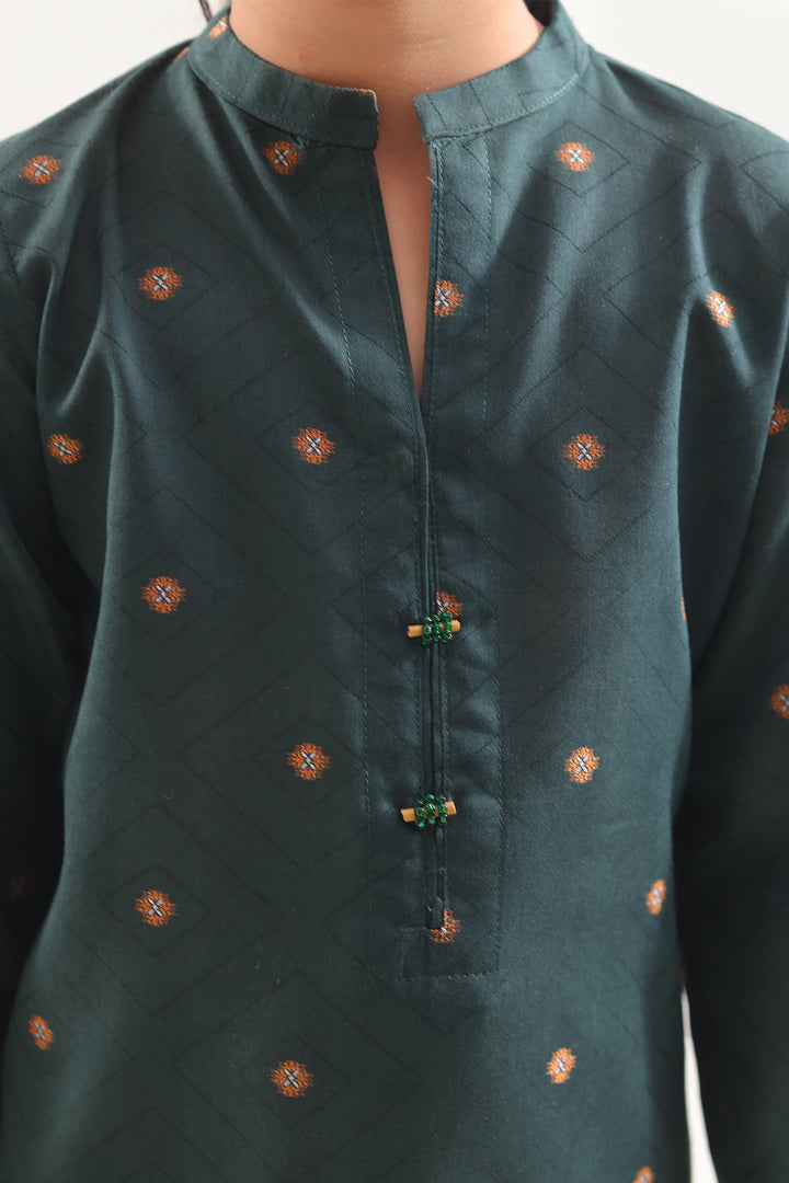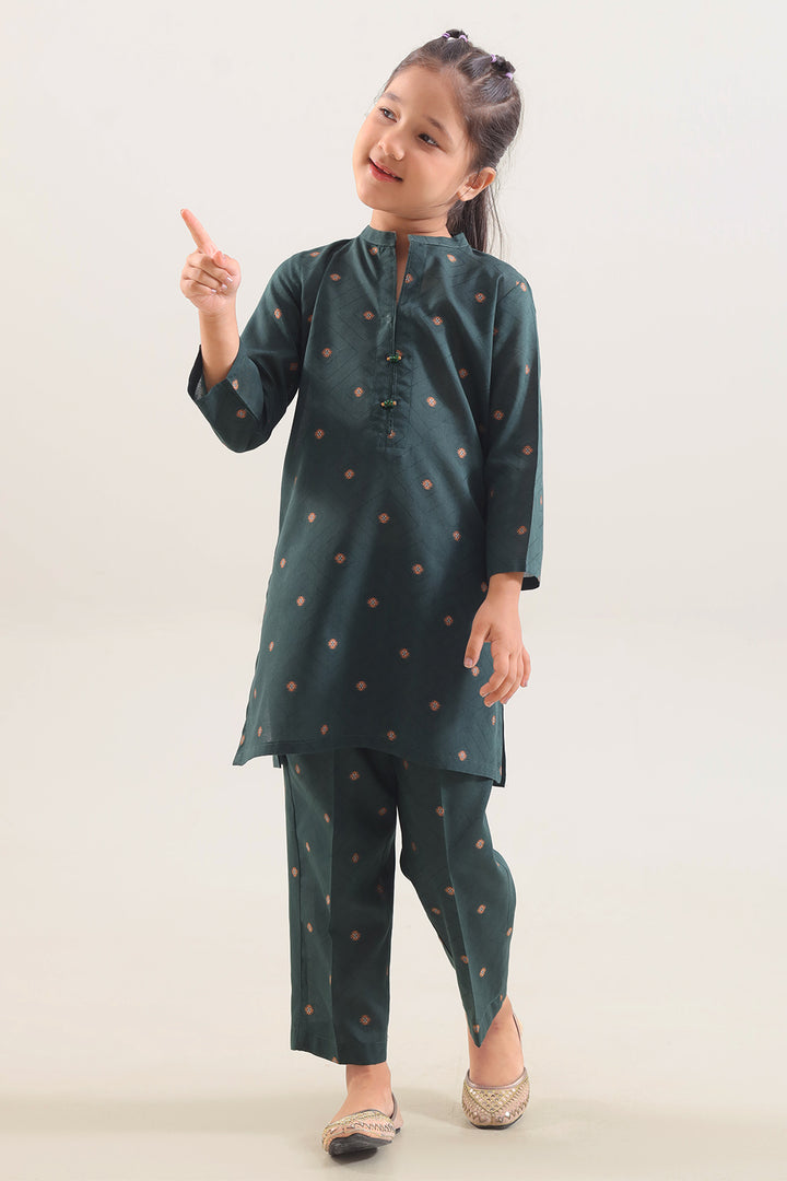 Elevate Your Child’s Wardrobe With the SAYA Stitched Cotton Jacquard Shirt & Trouser Set in Bottle Green. Tailored From Premium Cotton Jacquard Fabric That Offers A Refined Woven Texture And Soft, Breathable Wear. The Shirt Features A Fully Stitched Design For Instant Styling, Paired With Matching Trouser For A Complete Ensemble. The Rich Bottle Green Shade Adds Depth And Versatility—Ideal For Festive Events, Family Gatherings, Or Smart Daywear. This Set Blends Comfort, Quality, And Style In A Kid-Friendly Format.
