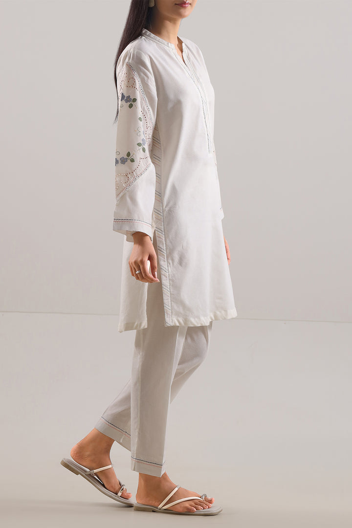 Embroidered Self-Jacquard Stitched Two-Piece Shirt & Trouser By SAYA, In Pure White Color Featuring Elegant Tonal Embroidery And Jacquard Texture For Sophisticated Depth. The Shirt Is Ready-To-Wear With Fine Self-Jacquard Weave And Subtle Embroidered Detailing That Enhances Elegance Without Overpowering. The Trouser Matches Seamlessly In Texture And Shade, Offering Comfort With Style. Perfect For Formal Events Or Elegant Day-Out Looks, Its Crisp White Fabric And Structured Finish Make It A Versatile Staple.