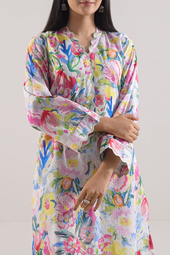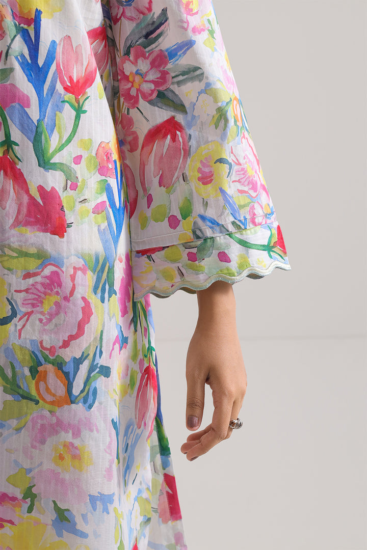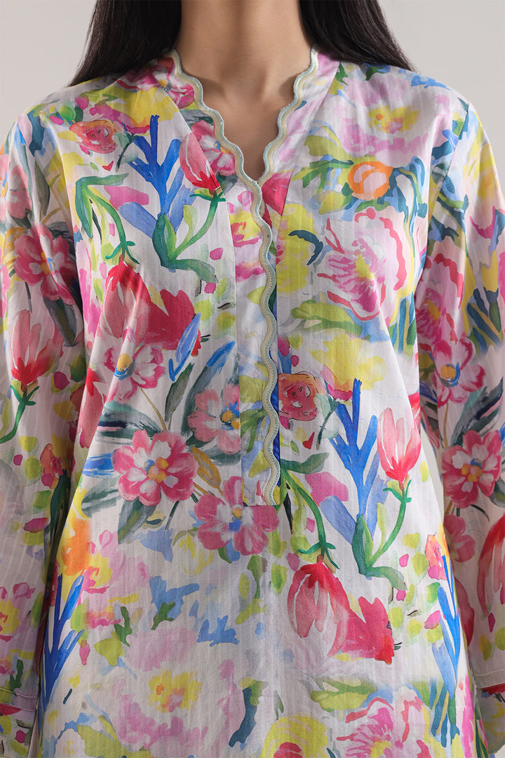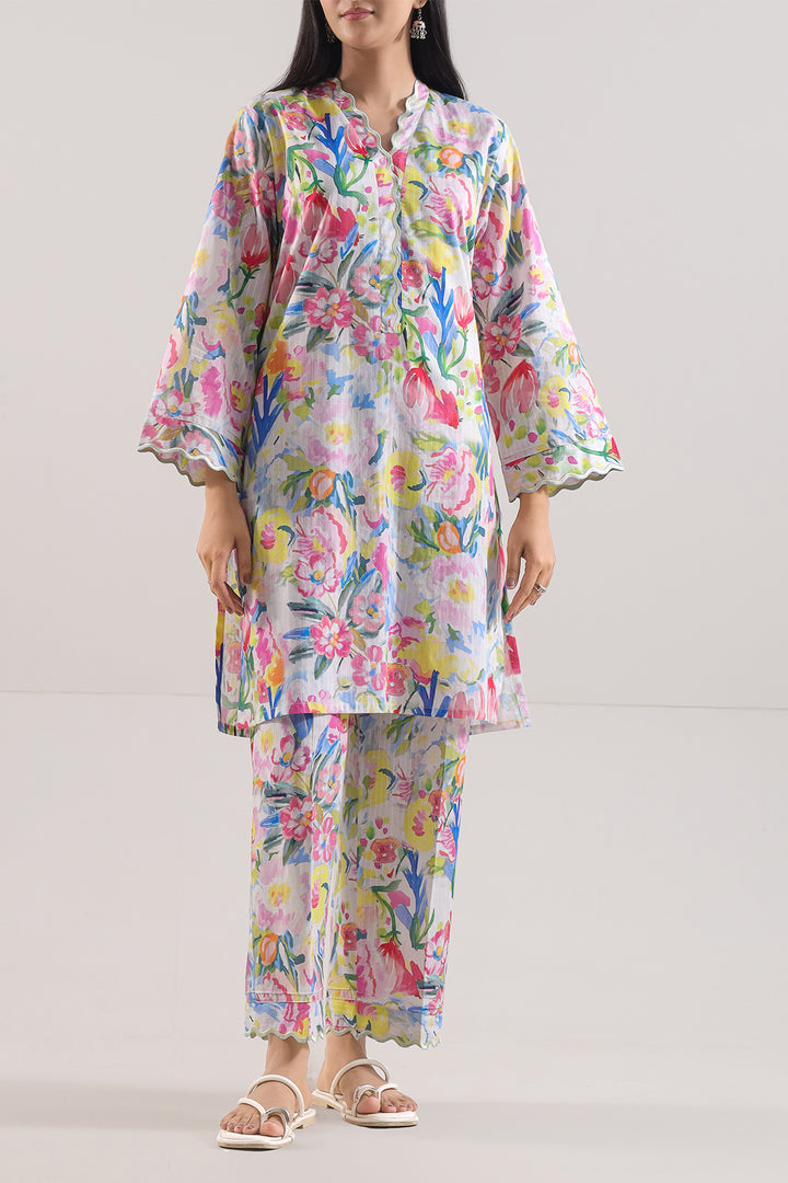 SAYA Stitched Printed Embroidered Lawn Two-Piece Shirt And Trouser Set In Multi-Color Features Premium Lawn Fabric With Vibrant Print And Intricate Embroidery That Elevates The Design. Ready-To-Wear Shirt Offers Elegant Stitching And Fine Detailing, While Trouser Complements With Clean Lines And Polished Finish. Ensemble Blends Breathable Comfort With Stylish Visual Appeal, Perfect For Day Events, Festive Occasions Or Casual Chic Gatherings.