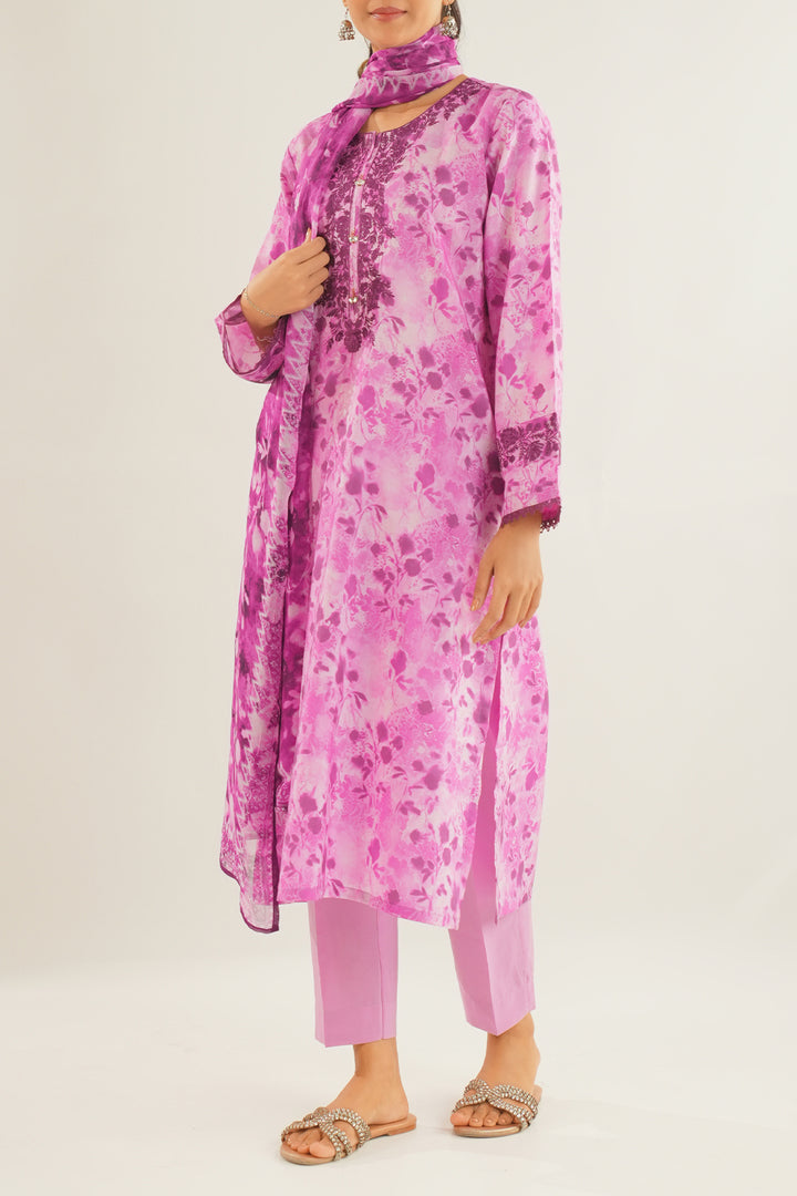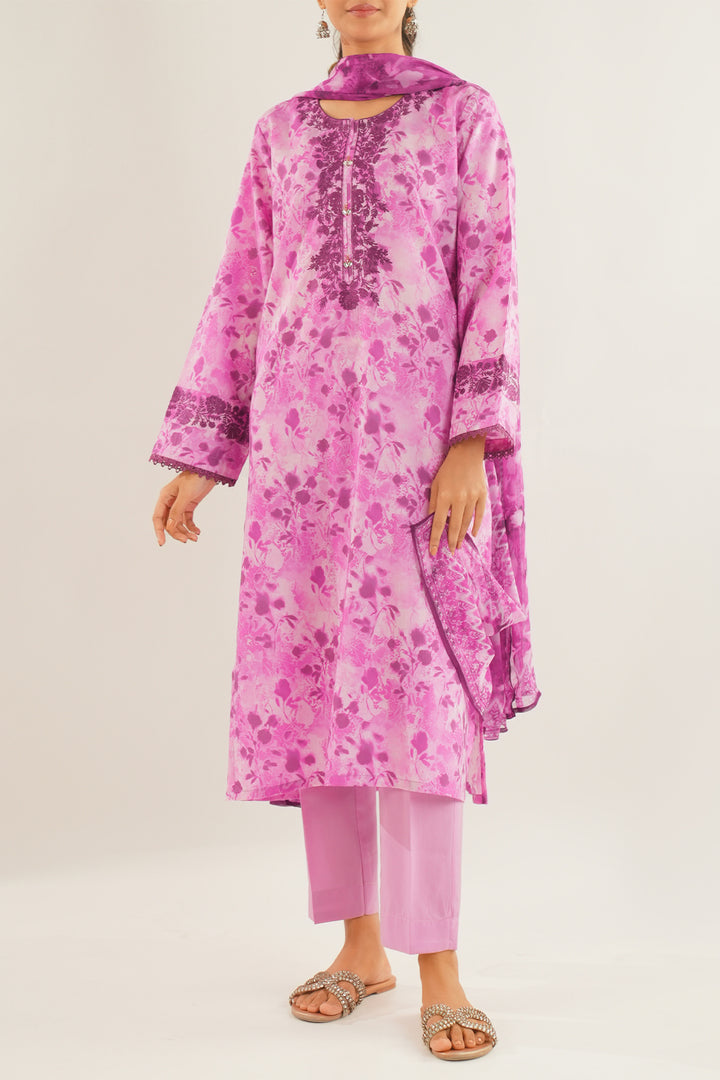 Elevate your summer wardrobe with this Stitched Printed Embroidered Lawn 3-Piece from Saya. Crafted with breathable lawn fabric, this set features a beautifully printed and embroidered shirt, dyed trouser, and a soft printed lawn dupatta—perfect for everyday wear with a touch of elegance.
