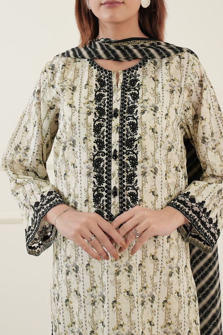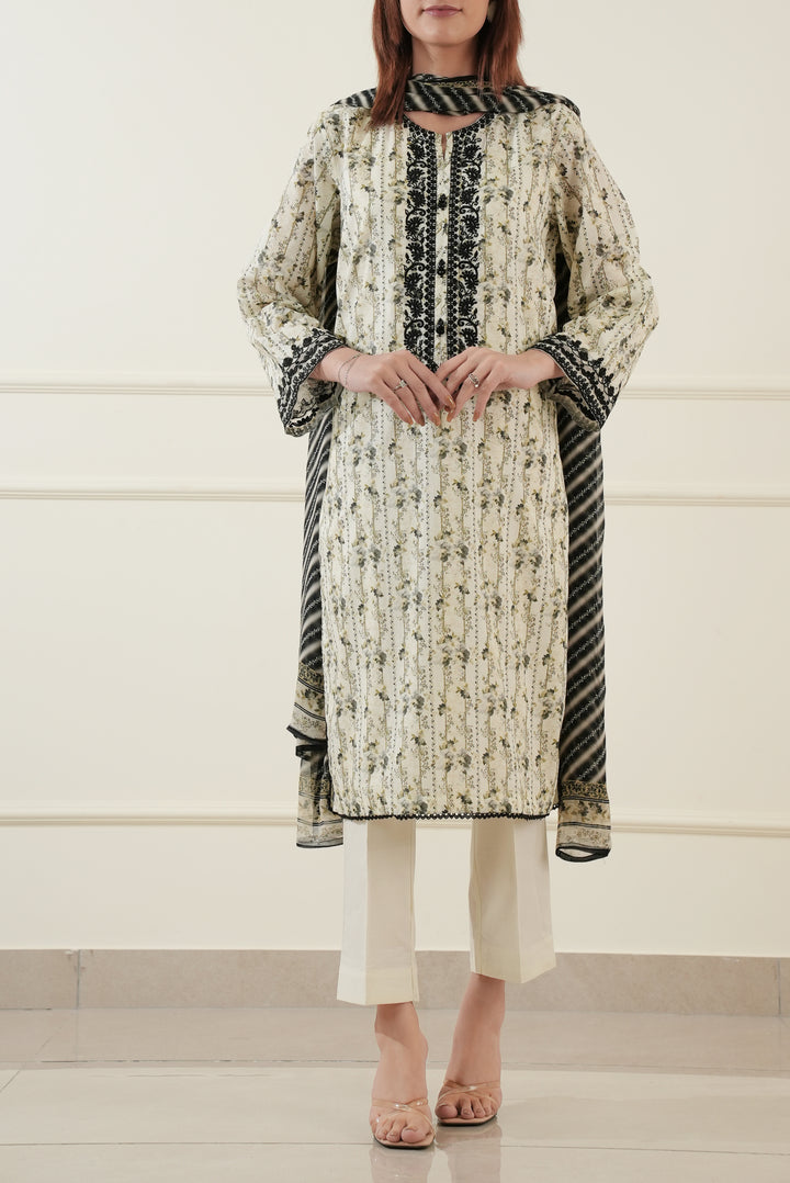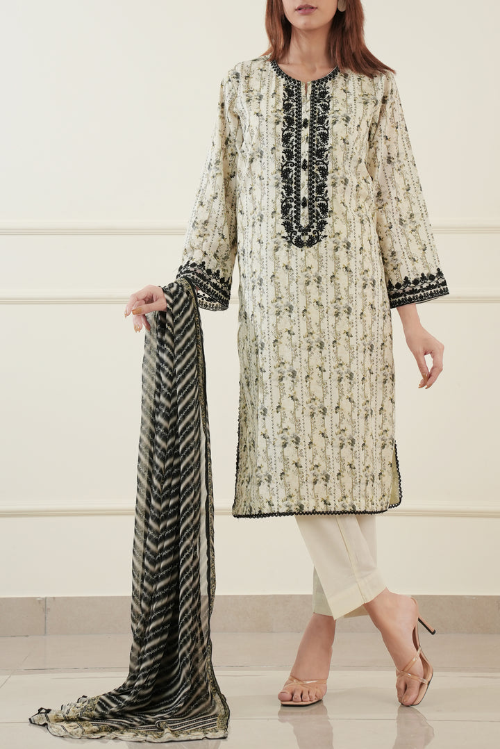 Introducing Saya's Stitched Printed Embroidered Lawn 3-Piece ensemble, a perfect blend of elegance and comfort. This ready-to-wear set features an embroidered lawn shirt, a Bemberg chiffon dupatta, and dyed trousers, all in a classic white hue. Ideal for both casual and semi-formal occasions, this outfit offers a sophisticated look with minimal effort.