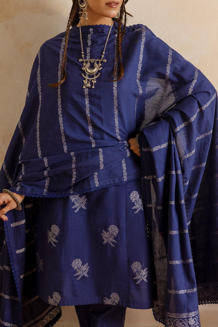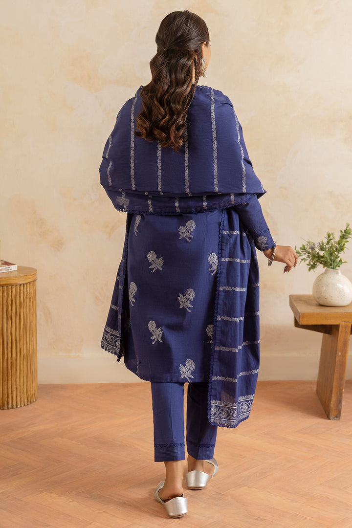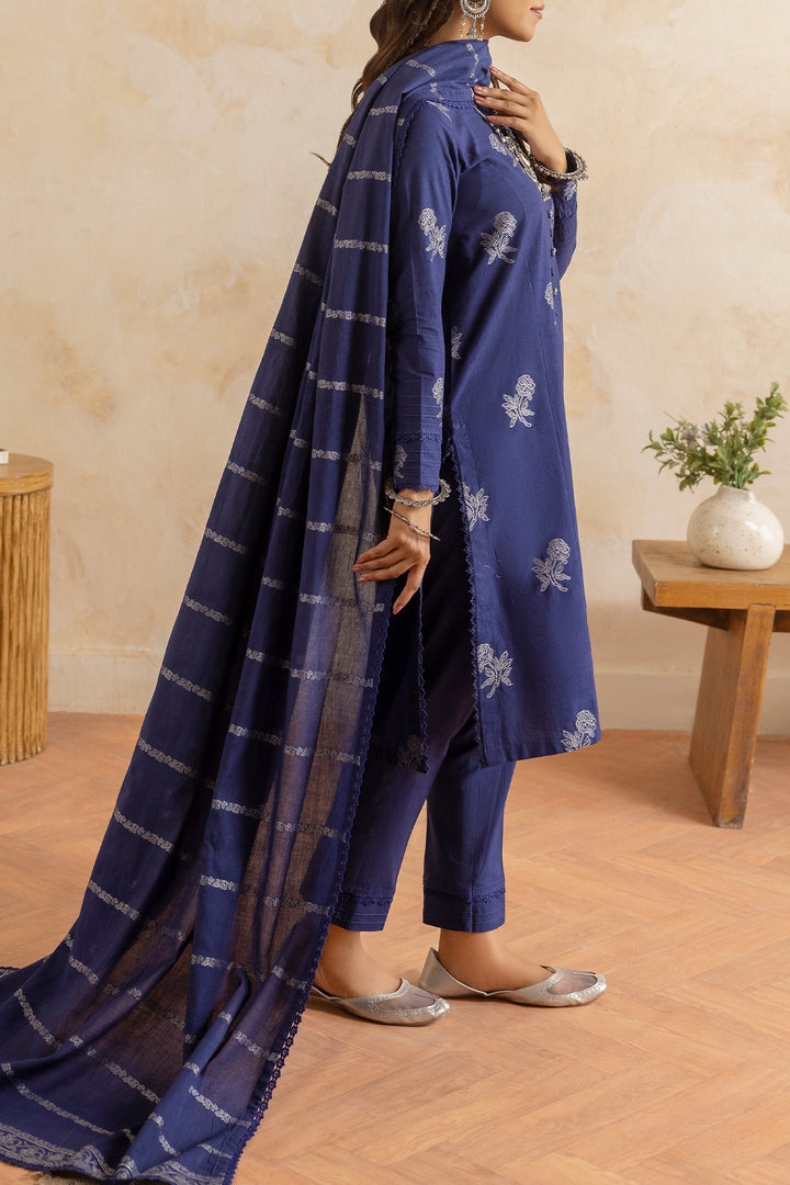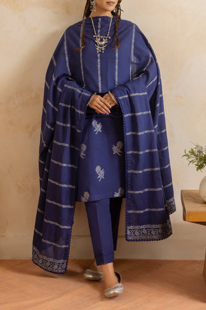 Unstitched Cotton Jacquard Shirt By SAYA Features a Richly Textured Jacquard Cotton Fabric in a Navy Blue Hue, Presented on a Broad Canvas to Allow for Seamless Tailoring. The Intricate Weave Adds Visual Depth and Elegance, While the Premium Fabric Offers Lightweight Comfort and Breathability. Designed as a versatile base for crafting custom semi-formal or everyday sophisticated silhouettes.