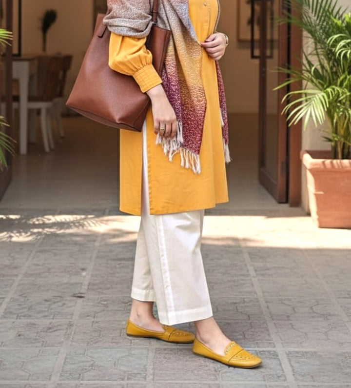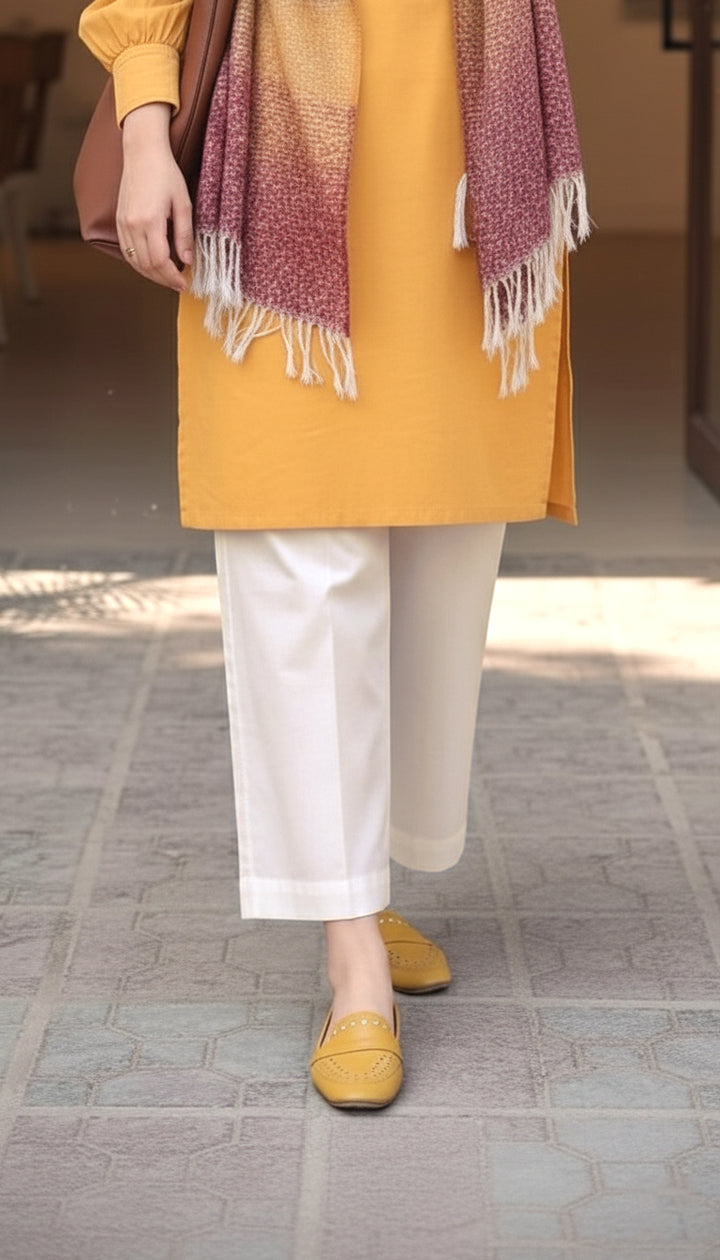 Soft Yet Stylish, This SAYA Unstitched Dyed Cambric Trouser Fabric In Off White Offers A Refreshing Base For Tailored Trouser. The Cambric Fabric Features A Fine Plain Weave With A Smooth, Crisp Handfeel — ideal for pieces that require structure without sacrificing comfort. The solid Off White hue brings brightness and versatility, allowing it to pair seamlessly with printed shirts or contrasting tops. Supplied unstitched, it gives you full creative freedom over the cut, fit, and finish of your garments.