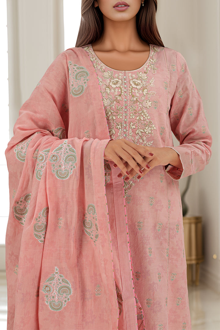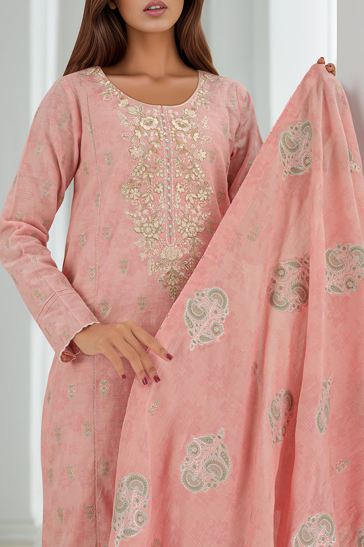 Upgrade your wardrobe with Saya’s Pink Unstitched Embroidered Jacquard Cotton Shirt. Crafted from textured jacquard cotton and featuring delicate organza neckline and sleeve embroidery, this 1.75-meter fabric offers breathable elegance and versatility. Tailor to your preference for custom-fit sophistication.